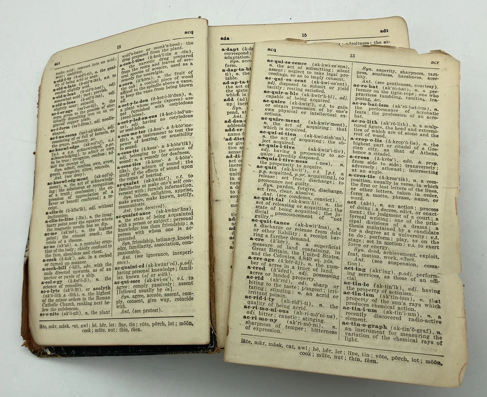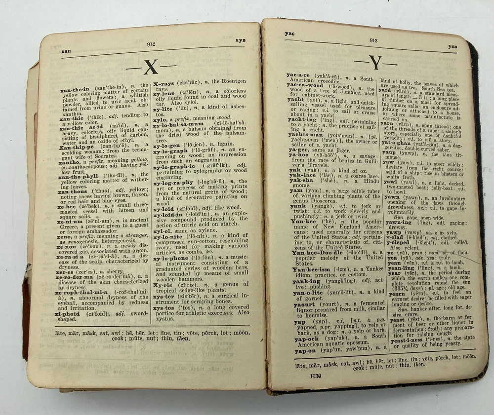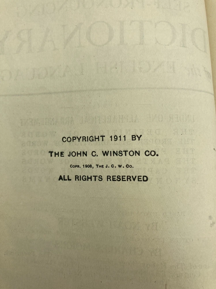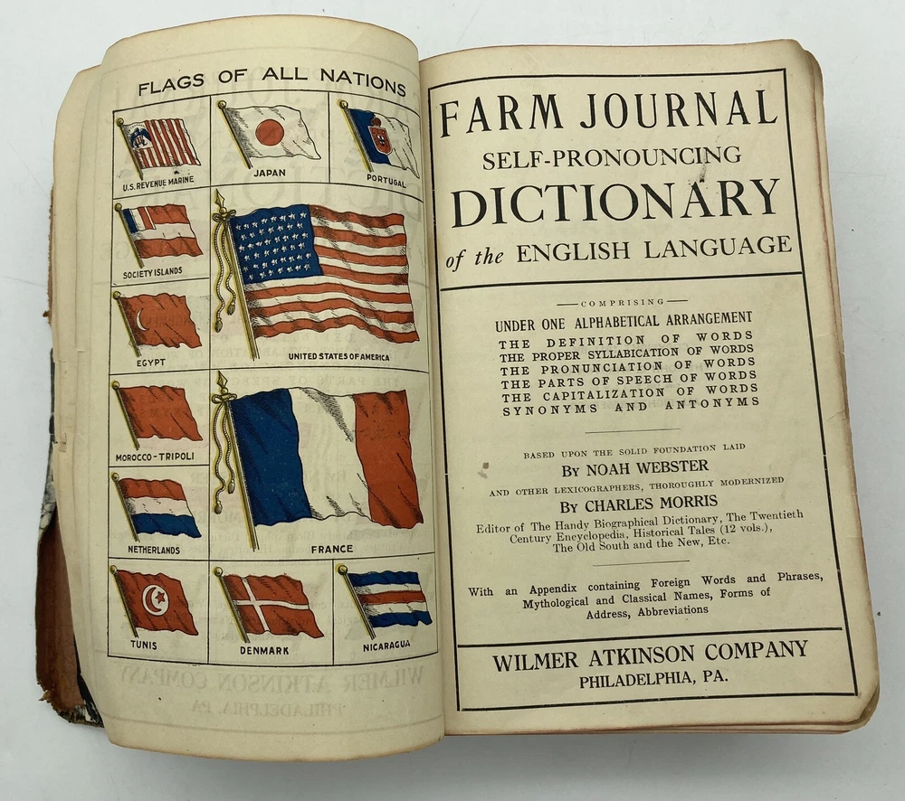 1911 Webster Morris Farm Journal Dictionary Leatherbound Self-Pronouncing. See pictures for condition. The leather is supple and the book feels nice in the hand. There are a few pages missing, but most are intact. Very nice 112 year old dictionary.