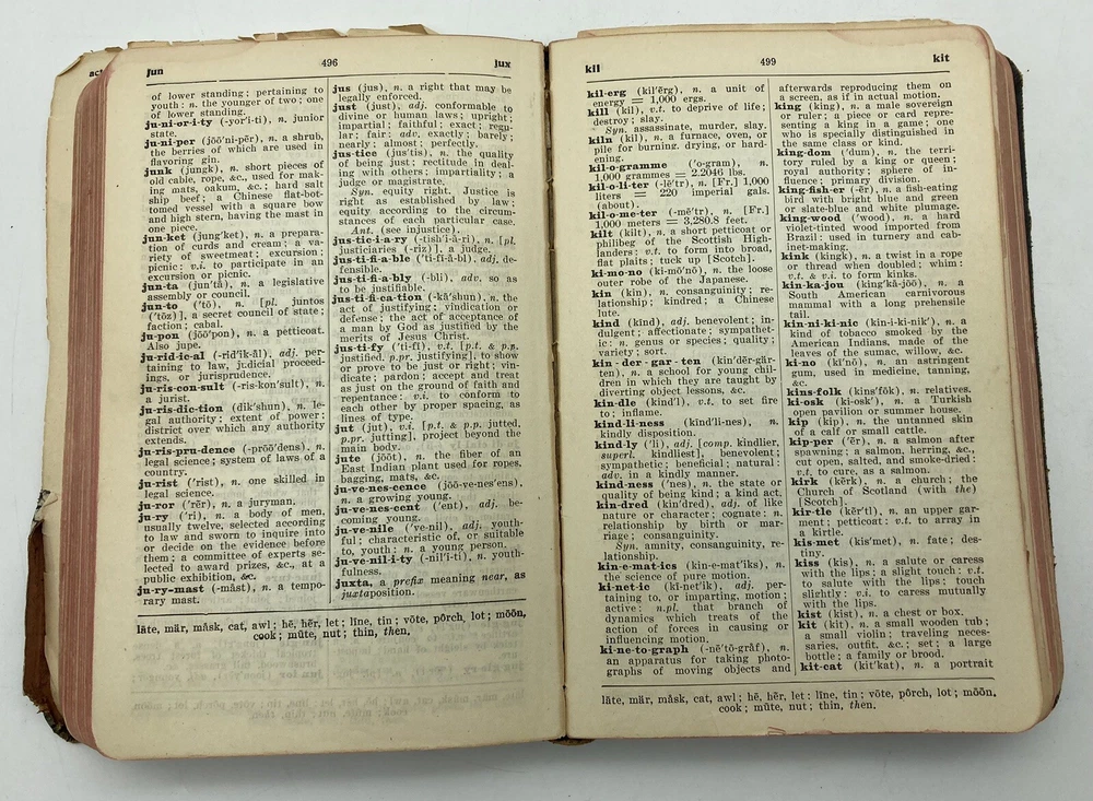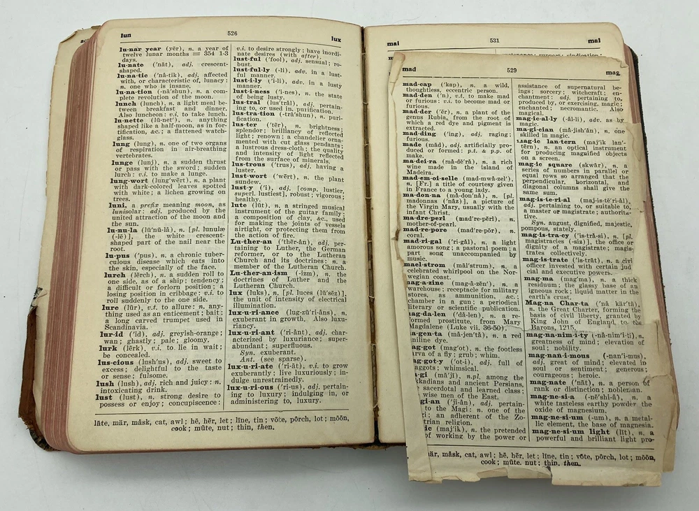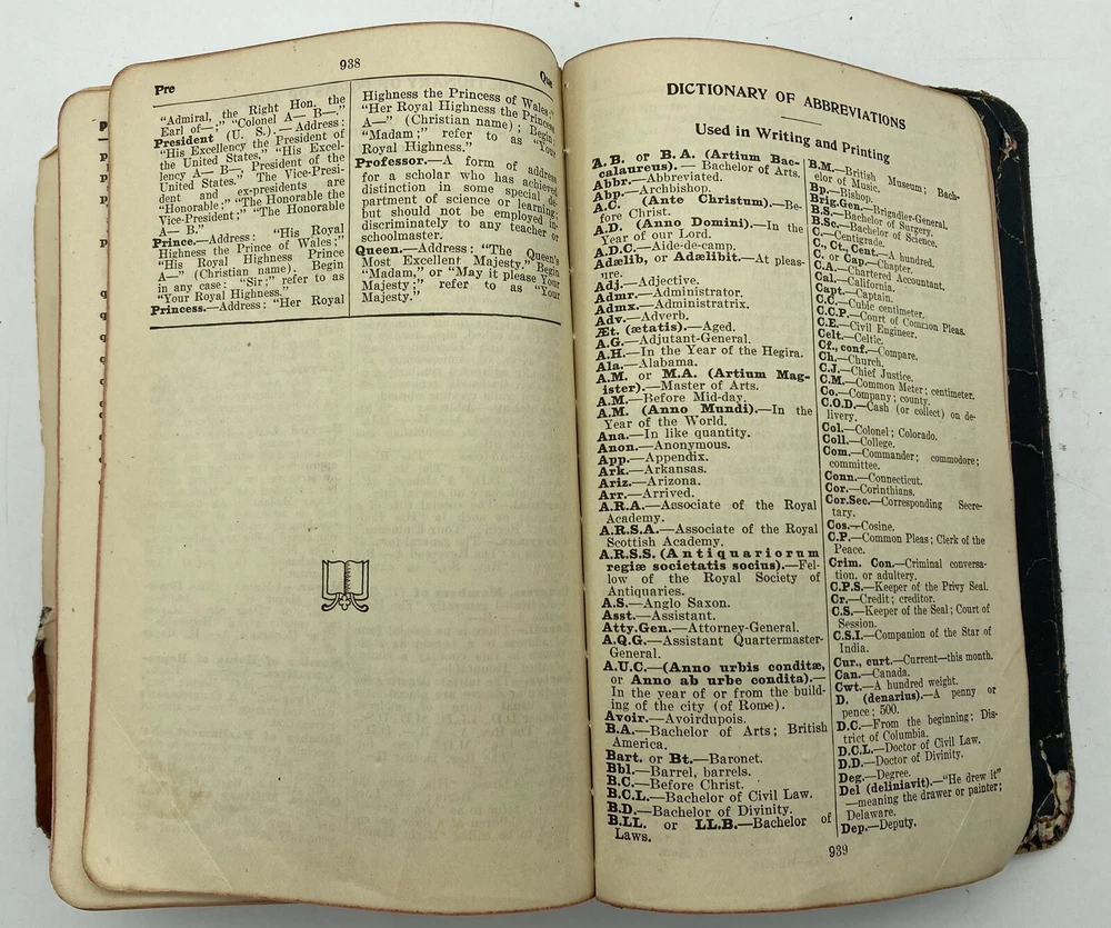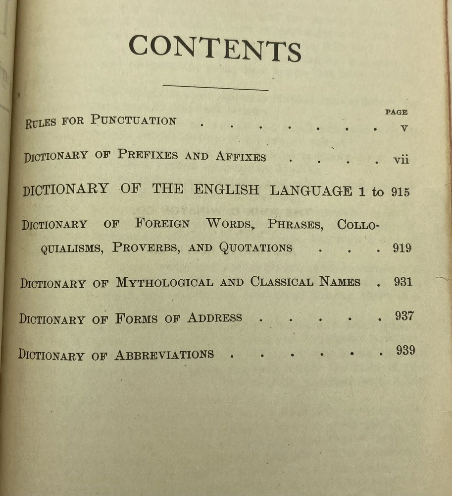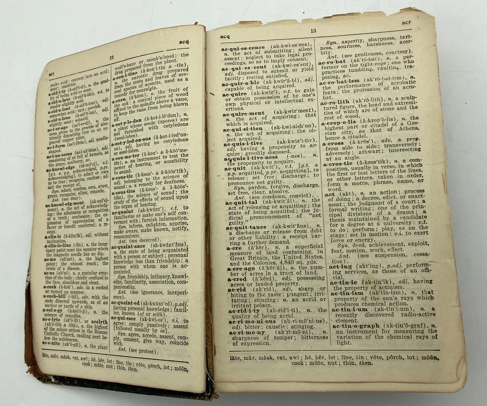1911 Webster Morris Farm Journal Dictionary Leatherbound Self-Pronouncing. See pictures for condition. The leather is supple and the book feels nice in the hand. There are a few pages missing, but most are intact. Very nice 112 year old dictionary.