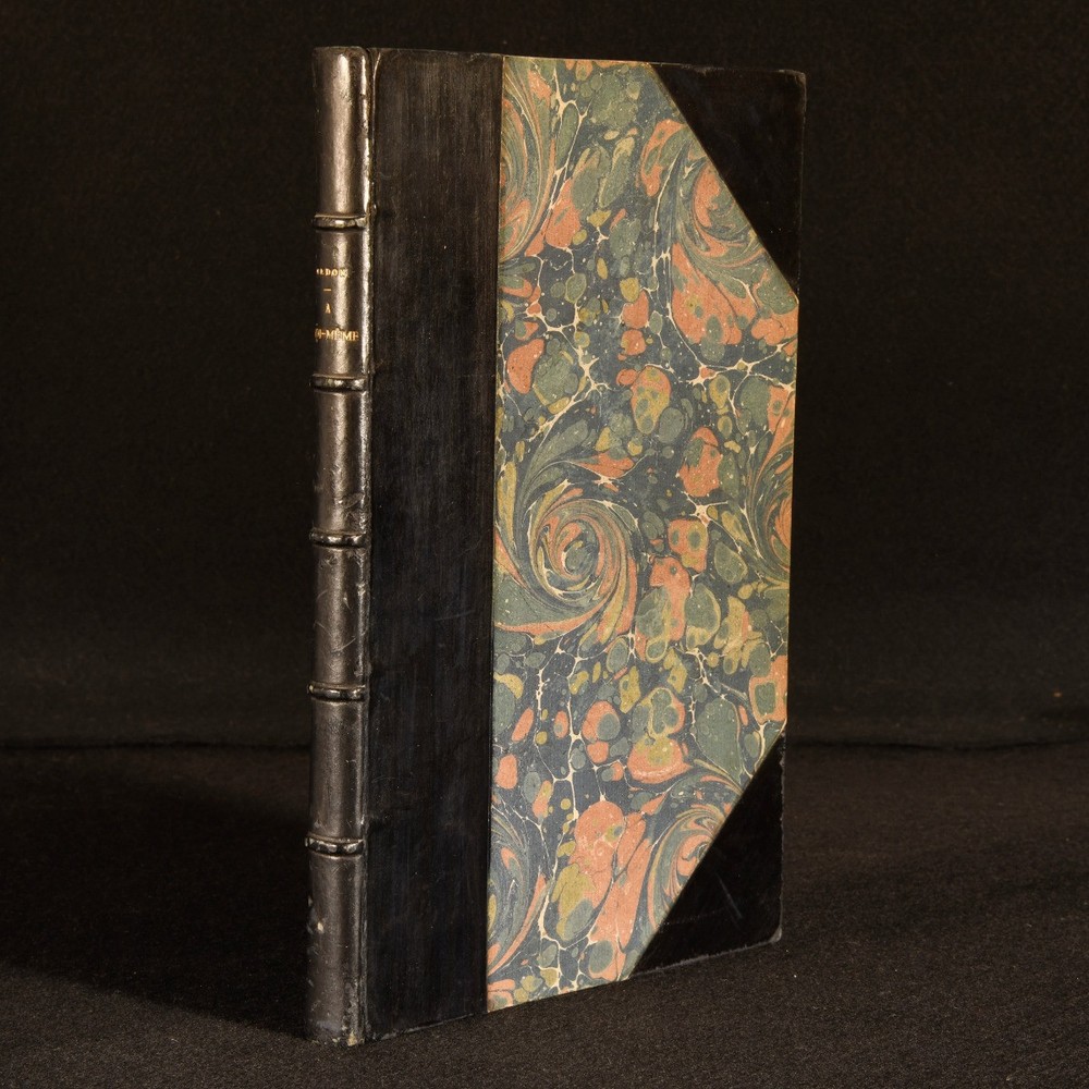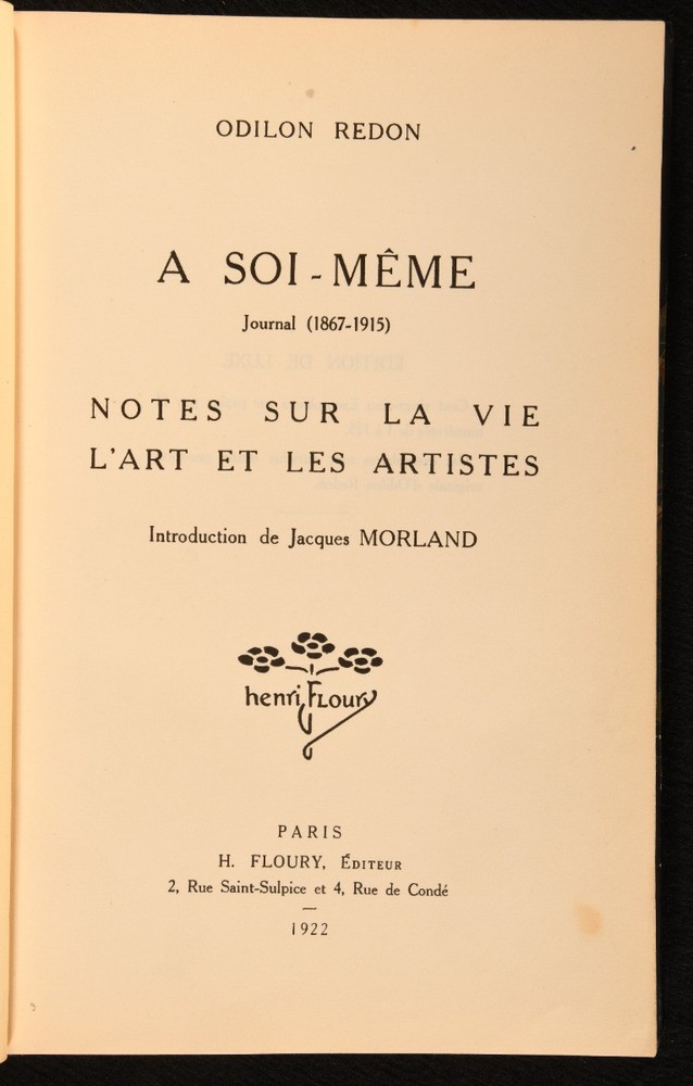 Click here to see our other books! A Soi-Meme Odilon Redon 1922 H. Floury : Paris 10" by 6.5" 178, [1pp] SUMMARY A Riviere bound copy of this autobiographical work by Odilon Redon, in the original French. Illustrated,Leather Binding,Signed Binding Overall Condition: Very Good Indeed This book weighs 1 KG when packed UK Postage: £ 3.99 US Postage: £ 22.99 EU Postage : £ 16.99 European Postage: £ 17.99 Asia Postage: £ 22.99 Worldwide Postage: £ 28.99 DESCRIPTION Bound by Riviere. In the original French. Illustrated with a frontispiece and one plate. Collated, complete. The standard edition of this journal by French Symbolist artist Odilon Redon. In this work, Redon reflects on his life and work from 1867 to 1915, and discusses how he found inspiration for his work. He is known for as part of Post-Impressionism and Symbolism, and for his dreamlike paintings which were inspired by Japanese art. With an introduction by Jacques Morland. CONDITION In a half calf binding with marbled paper to the boards, bound by Riviere. Externally, smart. Light rubbing to the spine and extremities. Spine is faded. Spots to the endpapers. Internally, firmly bound. Pages are bright and clean with a few scattered spots. Overall Condition: Very Good Indeed GLOSSARY OF TERMS Overall Condition (Dustwrapper condition rating is shown after that for the book itself, where a dustwrapper is present) Fine - Very well preserved copy showing very little wear Very Good Indeed - Only one or two minor faults, really a very attractive copy Very Good - Quite a wide term meaning no major faults but probably several smaller ones often expected given the age of the book, but still a respectable copy Good - Meaning not very good. Some more serious faults as will be described in the condition report under 'condition' Good Only - Meaning one or more faults that could really do with repair Fair - As with good only above but with other faults leaving a compromised copy even after repair Poor - Really bad and possibly seriously incomplete. We only sell books in this condition where their rarity or value makes them attractive none the less. Major defects will be described. GUARANTEE We offer a full money back guarantee on our descriptions. Please ask for details and conditions. We prefer PAYPAL. If you pay via PAYPAL we will post the item off the same or the next working day with the postage you have selected. Please note we cannot accept USD cheques