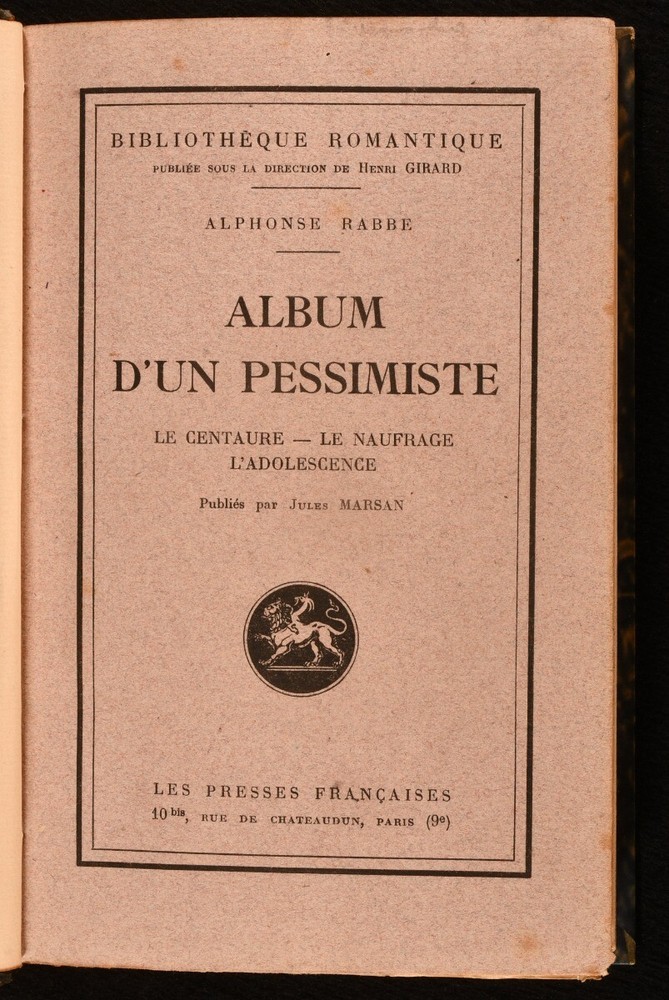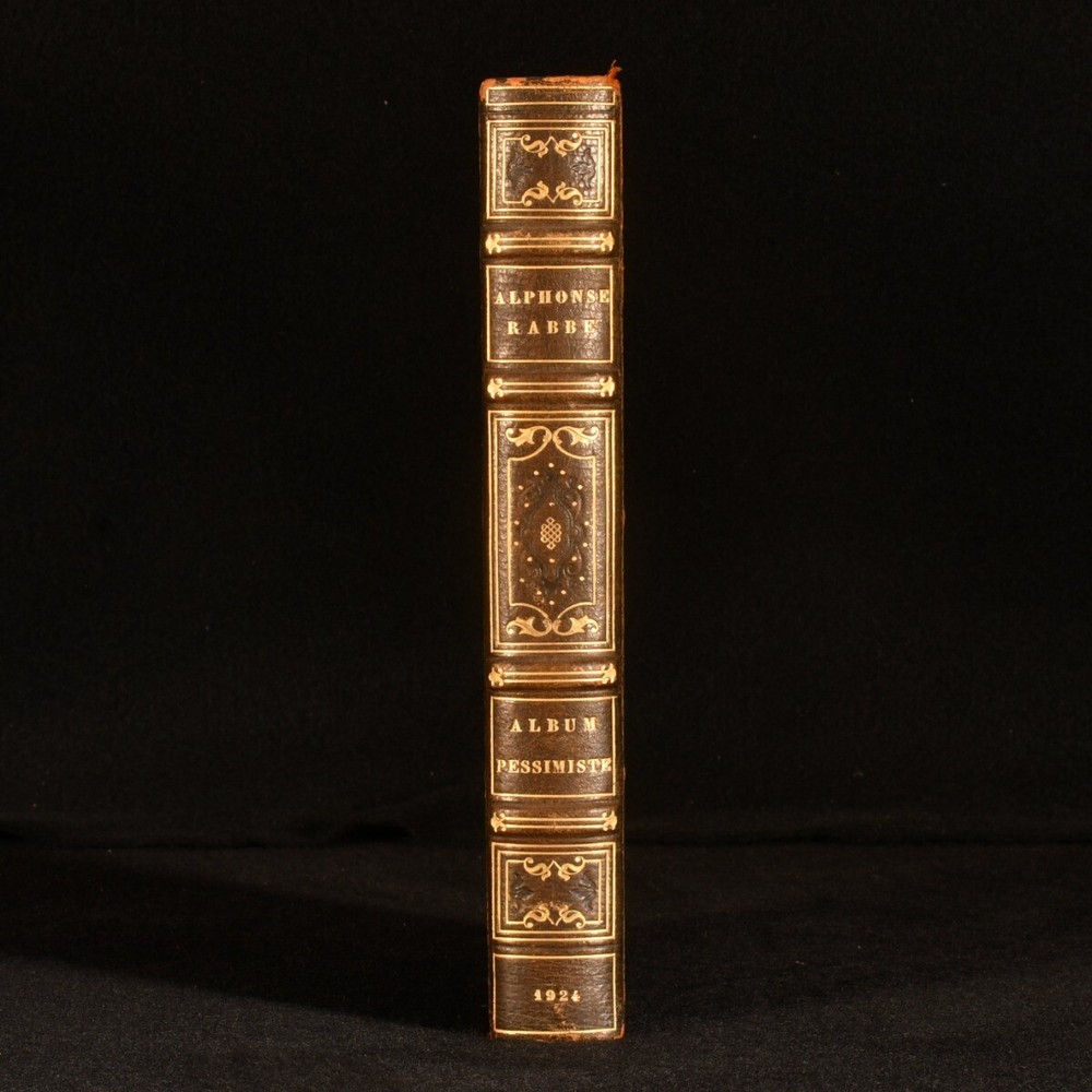 Click here to see our other books! Album d'un Pessimiste Alphonse Rabbe; Henri Girard 1924 Les Presses Francaises : Paris 8" by 5.5" xlvii, [8], 6-214, [1pp] SUMMARY A smart new edition of Alphonse Rabbe's philosophical pondering on life, inscribed by the editor, Henri Girard. Illustrated,Leather Binding,Signed Overall Condition: Very Good Indeed This book weighs 0.75 KG when packed UK Postage: £ 3.99 US Postage: £ 19.99 EU Postage : £ 15.99 European Postage: £ 16.99 Asia Postage: £ 21.99 Worldwide Postage: £ 25.99 DESCRIPTION Signed by the editor, Henri Girard, to the head of the half-title. In the original French. A new edition of the best known work of Alphonse Rabbe, in which the opium-addicted author wrote about the pointlessness of existence. Illustrated with one folding letter facsimile plate. Edited by Henri Girard in the 'Bibliotheque Romantique' series. Original wraps bound in. Limited to three hundred copies, this copy is unnumbered. CONDITION In a quarter straight grain morocco binding with marbled paper to the boards. Externally, smart. Light rubbing to the leather. Spine is a little faded. Internally, firmly bound. Pages are bright and clean. Overall Condition: Very Good Indeed GLOSSARY OF TERMS Overall Condition (Dustwrapper condition rating is shown after that for the book itself, where a dustwrapper is present) Fine - Very well preserved copy showing very little wear Very Good Indeed - Only one or two minor faults, really a very attractive copy Very Good - Quite a wide term meaning no major faults but probably several smaller ones often expected given the age of the book, but still a respectable copy Good - Meaning not very good. Some more serious faults as will be described in the condition report under 'condition' Good Only - Meaning one or more faults that could really do with repair Fair - As with good only above but with other faults leaving a compromised copy even after repair Poor - Really bad and possibly seriously incomplete. We only sell books in this condition where their rarity or value makes them attractive none the less. Major defects will be described. GUARANTEE We offer a full money back guarantee on our descriptions. Please ask for details and conditions. We prefer PAYPAL. If you pay via PAYPAL we will post the item off the same or the next working day with the postage you have selected. Please note we cannot accept USD cheques