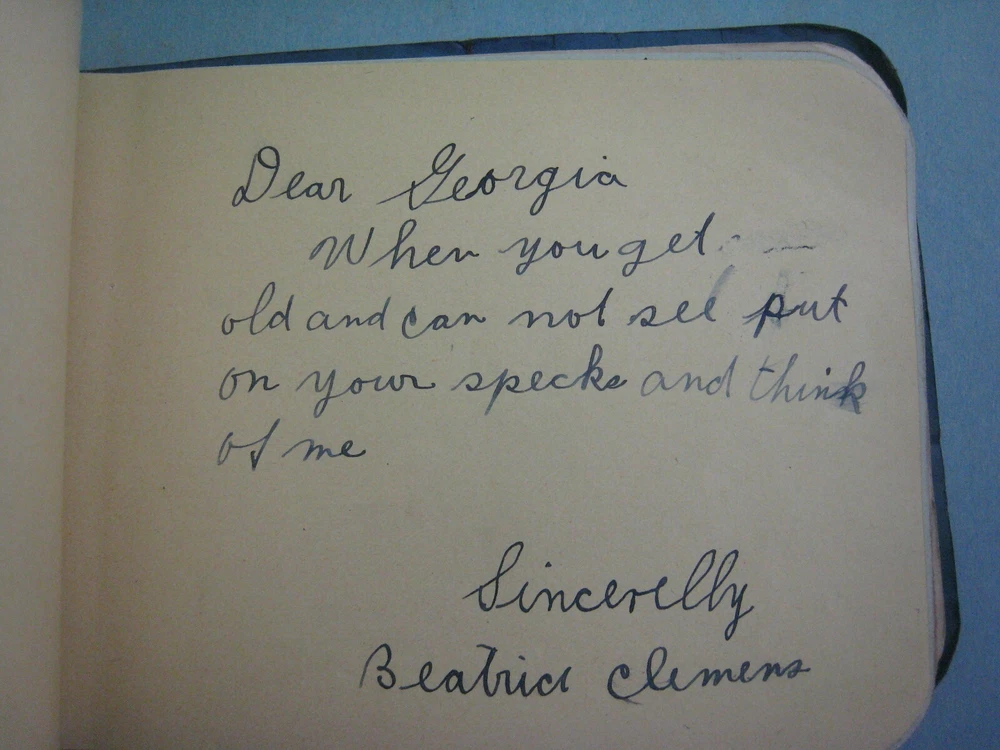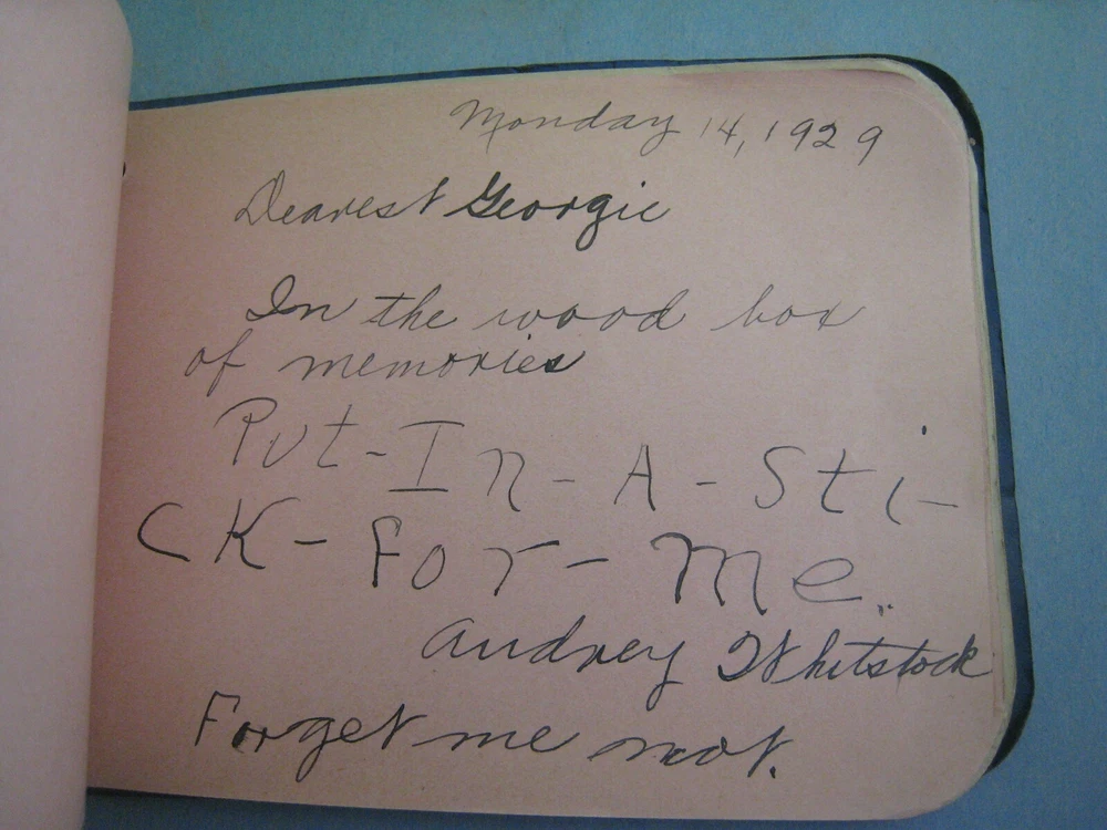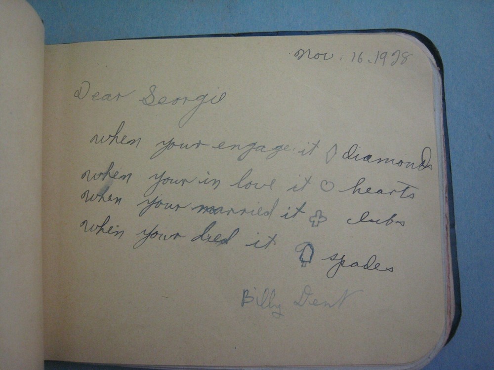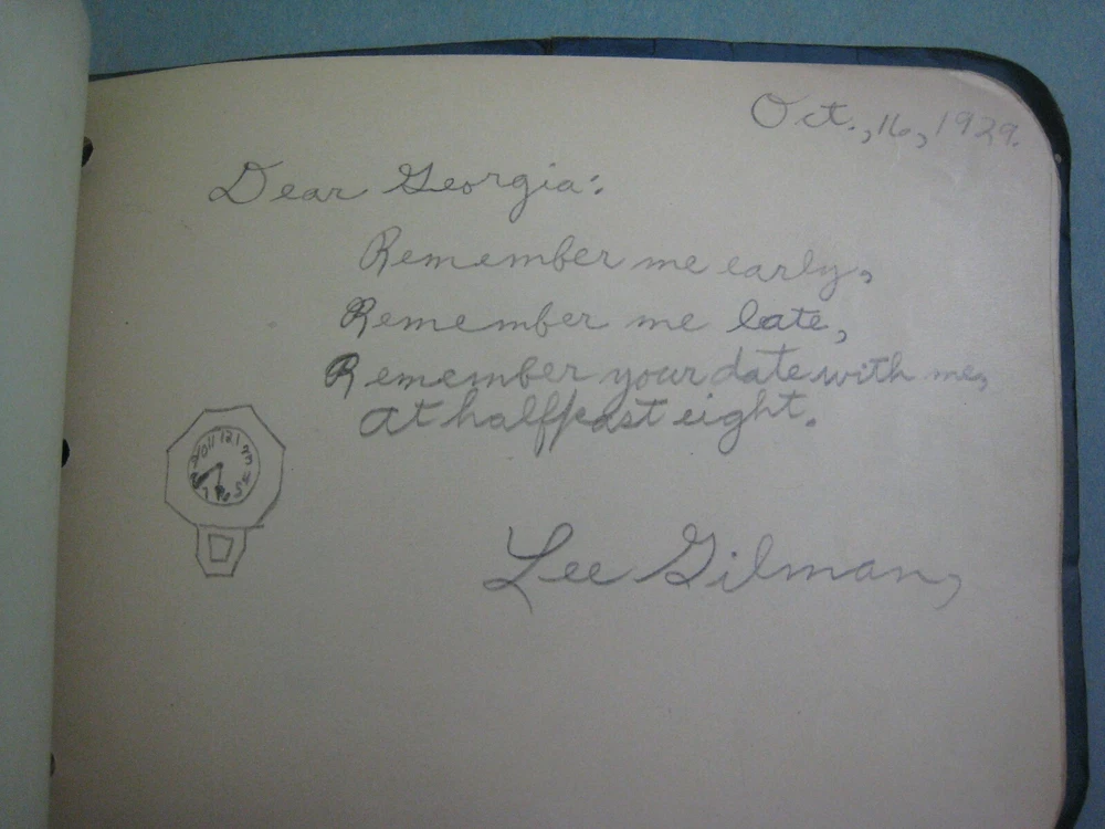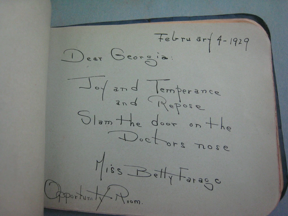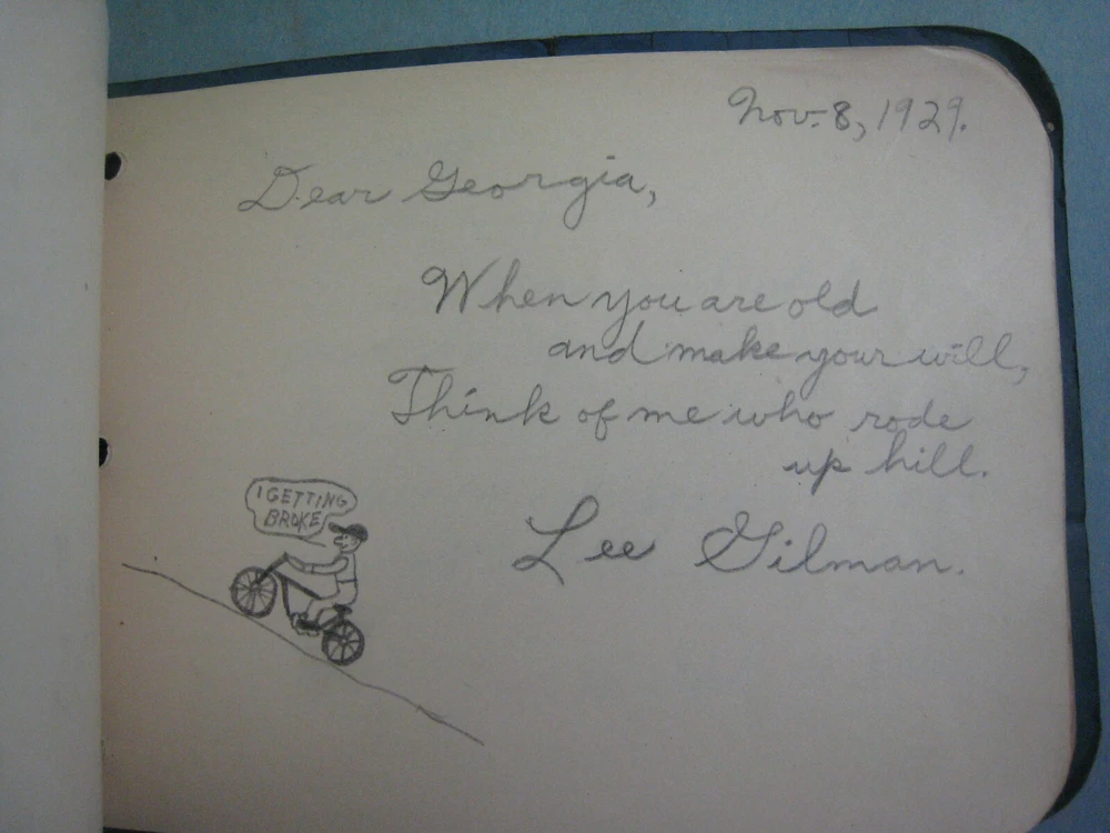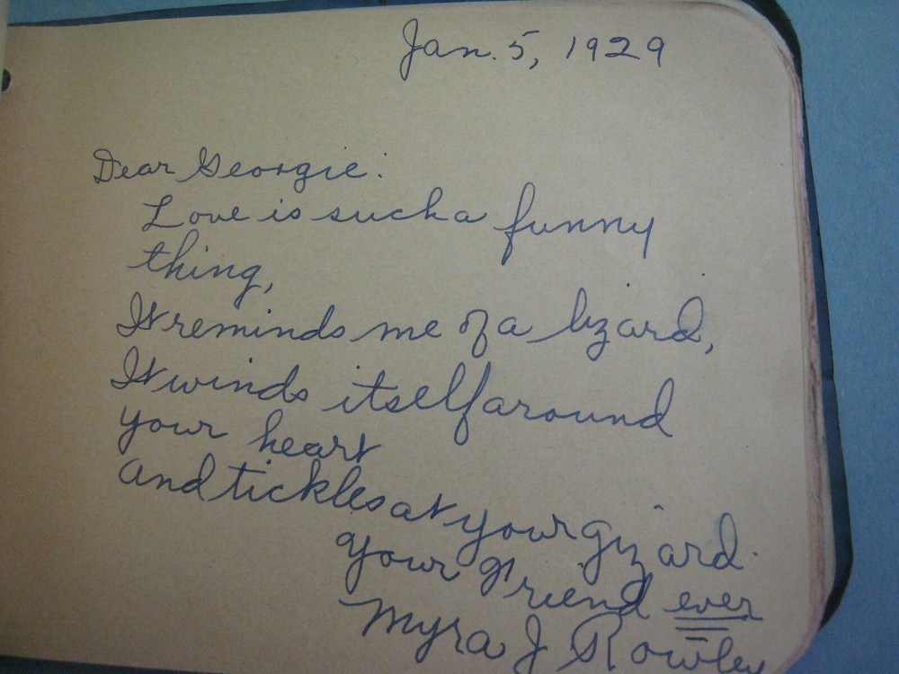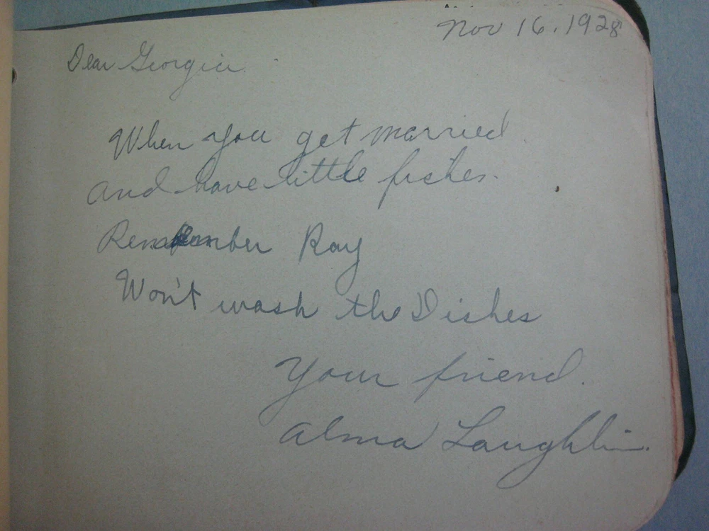 1929 AUTOGRAPH FRIENDSHIP BOOK ...VERY AMUSING..SOME SHOWN..MANY MORE FUNNY LINES...APPROX. 6 1/4 X 4 3/4 IN....... GOOD CONDITION, SOME CREASING TO COVER..SOLIDLY BOUND WITH STRING...