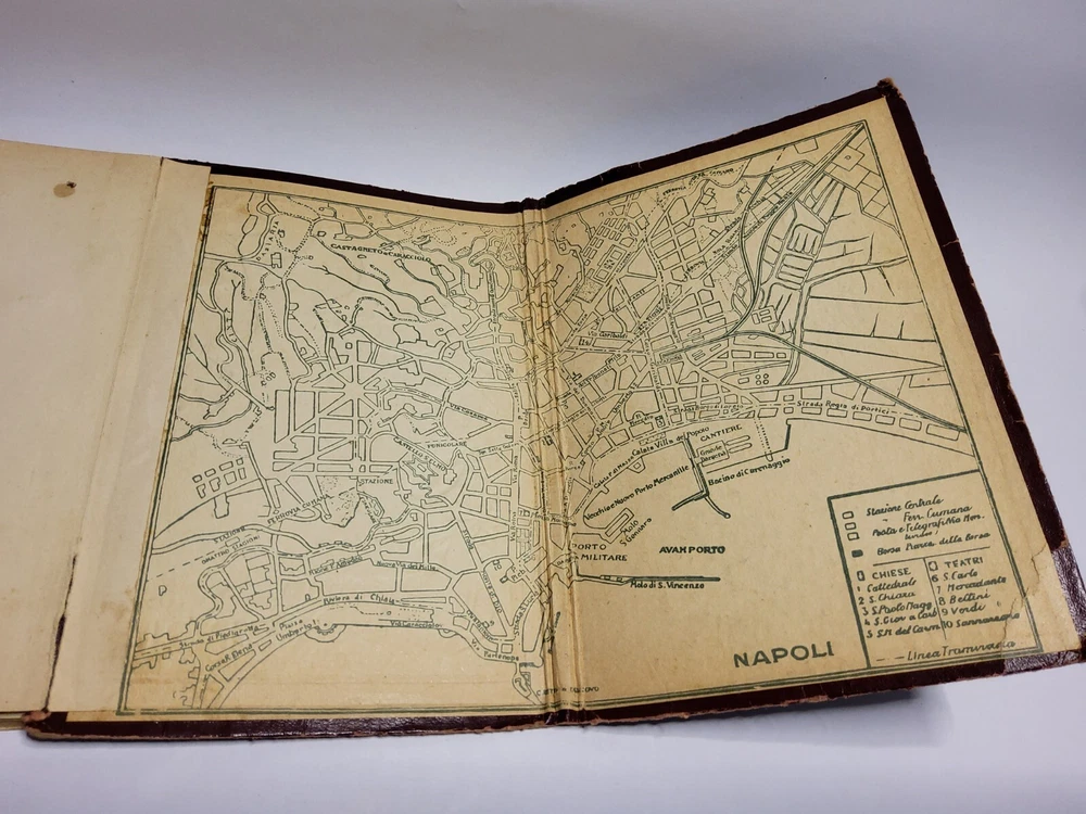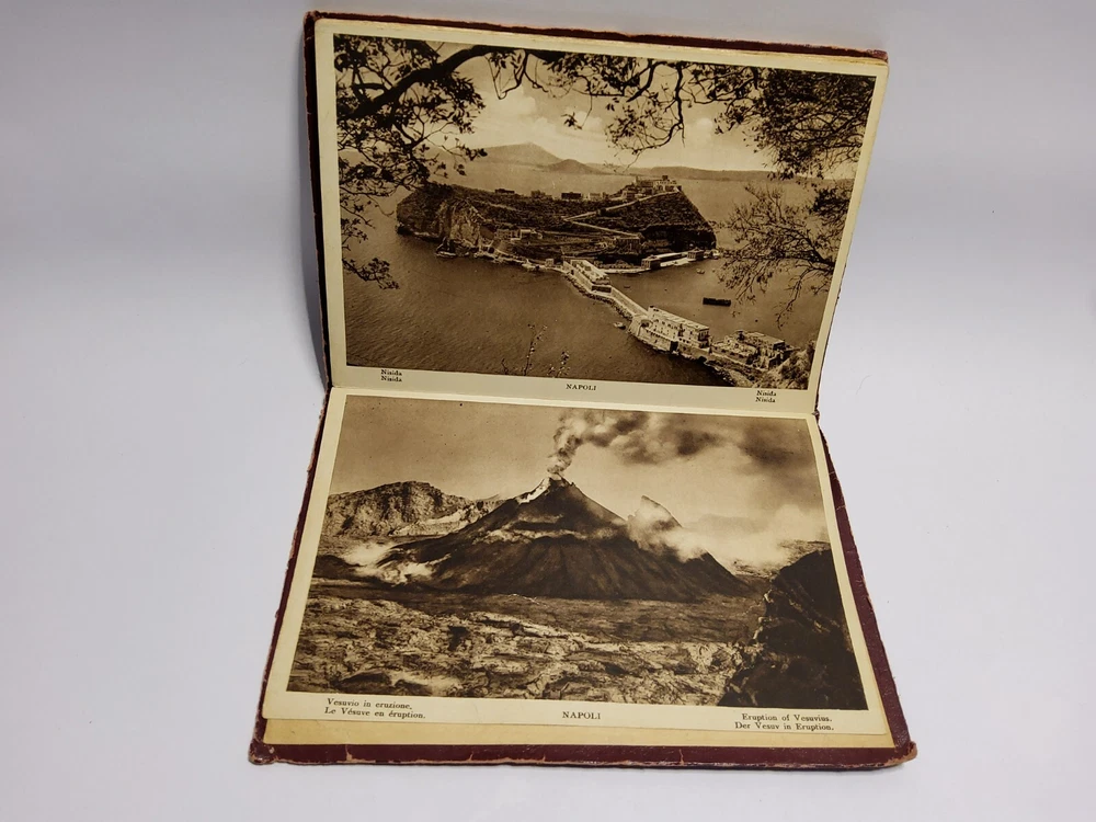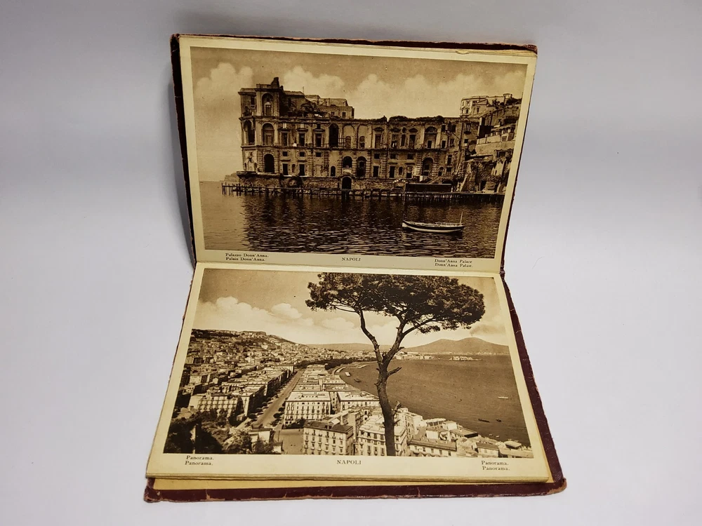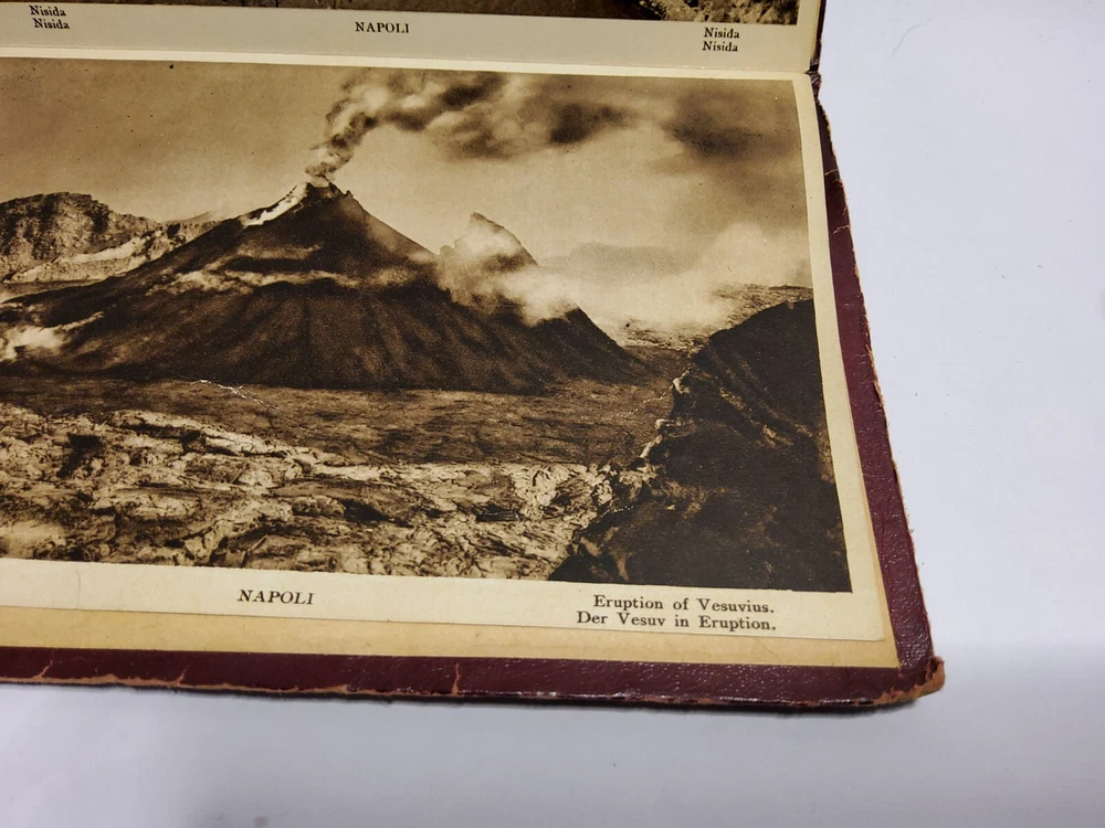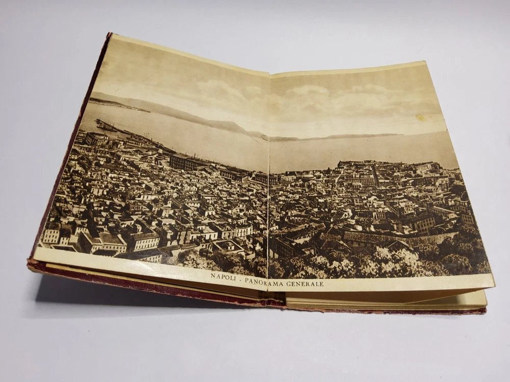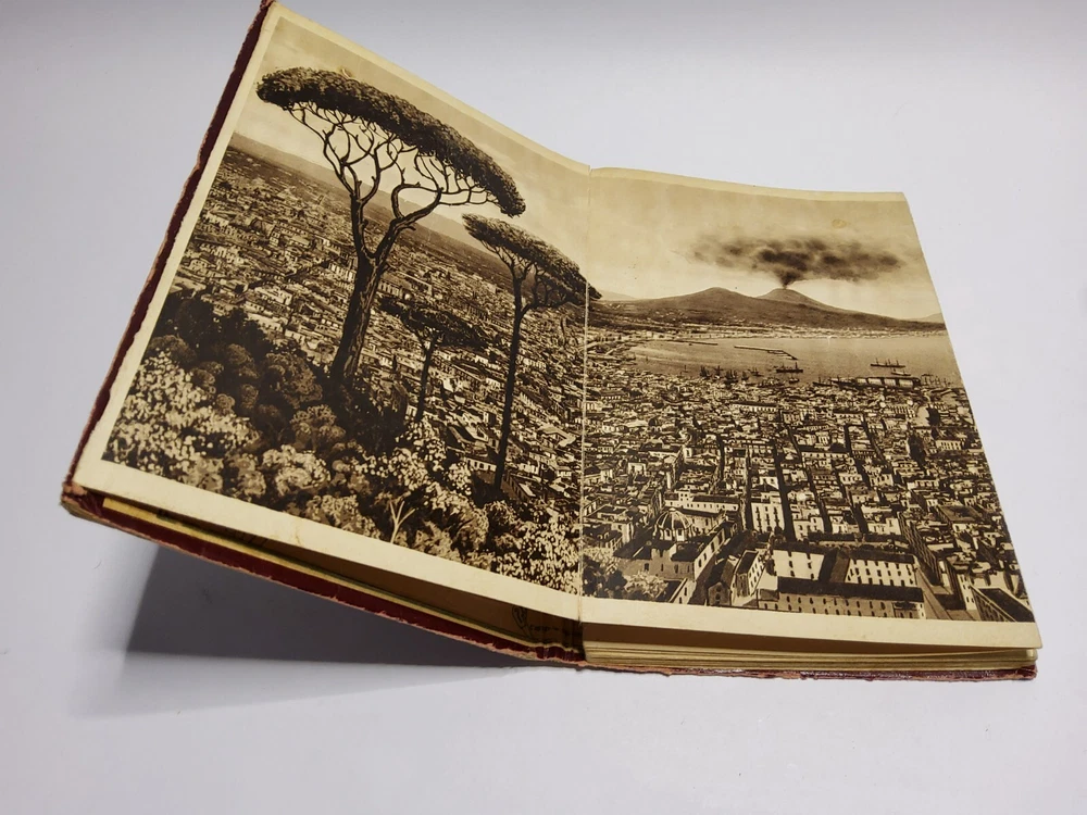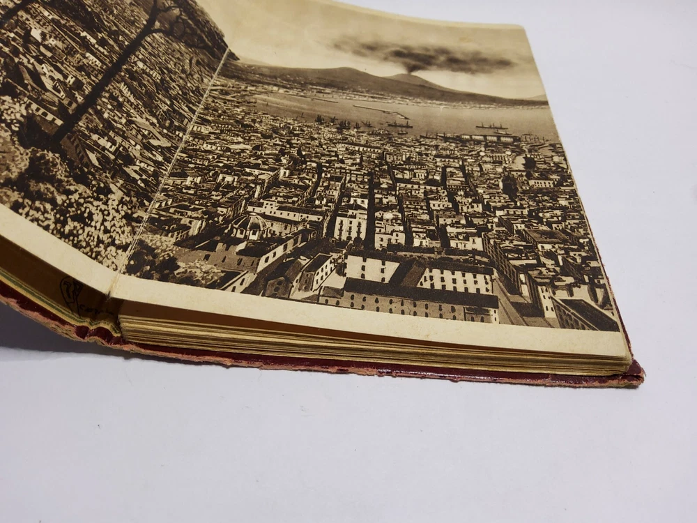 This beautiful leather-bound book is a true collector's item, with a stamped and raised front cover depicting a stunning scene from Napoli. Made in Italy in the 1930s, it is a wonderful souvenir of the region and a piece of history. The book also features an accordion-style photo album of some of the most iconic places to visit including a panoramic photo of the eruption of Vesurvius. Whether you're a lover of vintage Italian design or simply looking for a unique addition to your collection, this book is sure to impress.