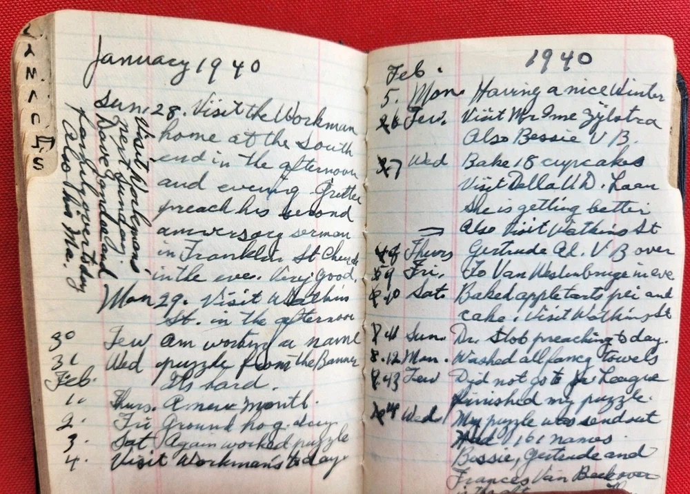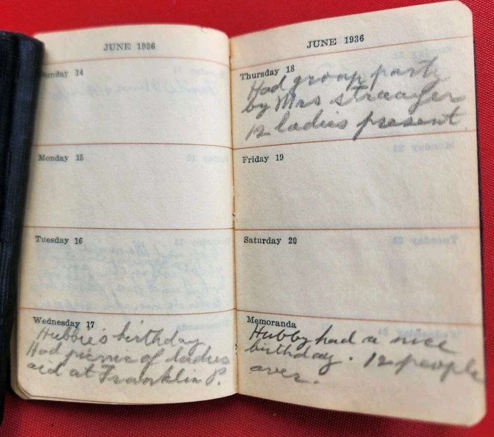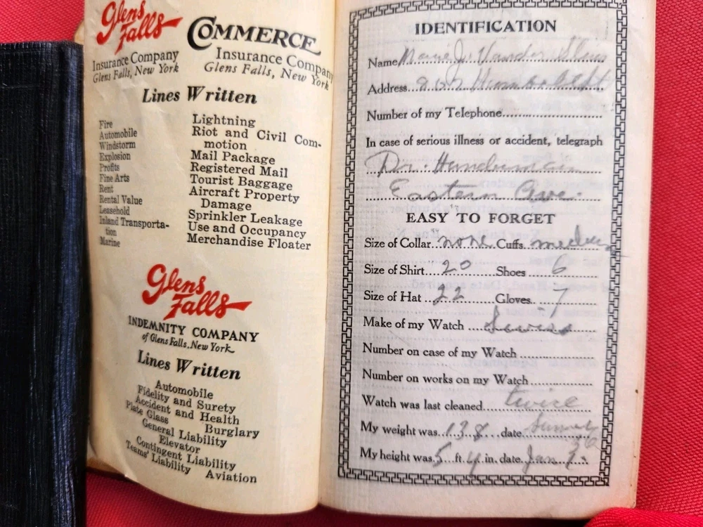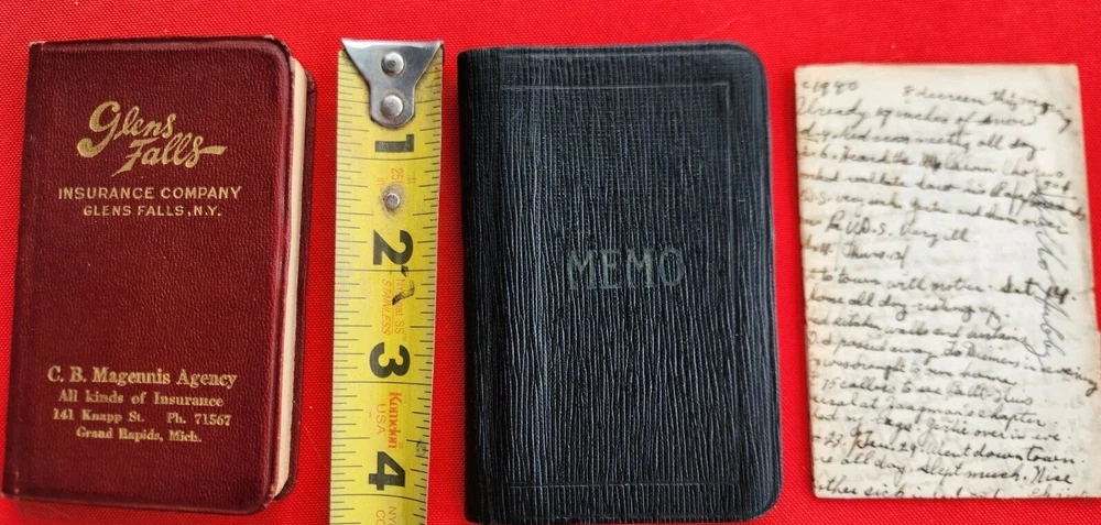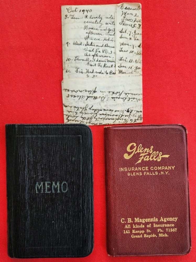 1930s 1940s Two Dairies Personal Handwritten Tiny 4" in length. 1. Memo: Black Leather "full" of tids bits of personal information. Approximately 1937 to 1940s. Dedicated to George Van Der Sleius. 2. Glens Falls Insurance New York. C.B. Magnetism Agency, Grand Rapids, MI. Belonged to Marie Sleius. 3. One piece of paper, with information written on both sides Fast Shipping