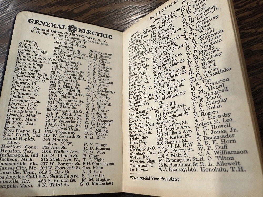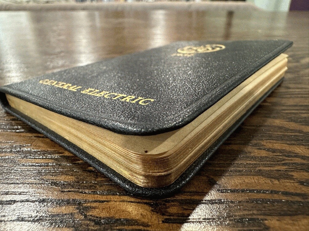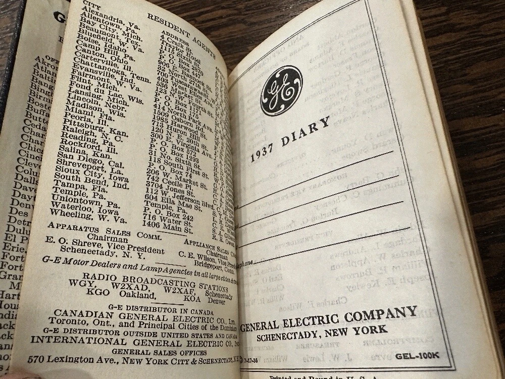 1937 General Electric Pocket Diary and Reference~Leather~unused~Cincinnati Author: General Electric Publisher: General Electric Publication Date: 1937 Qty Available: 1 Condition: Used: Very Good Sku: 050308 Notes: Small leather LIKE NEW 1937 Diary and general reference booklet. Includes a General Electric list of national Sales offices, Distribution and Warehouses, charts and records, color world maps and weekly 1937 calendar/diary (with no markings).Bright gilt edges and title. Measures: 2 2/8" x 4 1/2" . Your purchase benefits literacy and summer reading programs in Cincinnati and Hamilton County, Ohio. We ship every business day. All books ship in cardboard bookfolds with delivery confirmation. Sets or unusually heavy items ship in a box. Please contact us for more information.