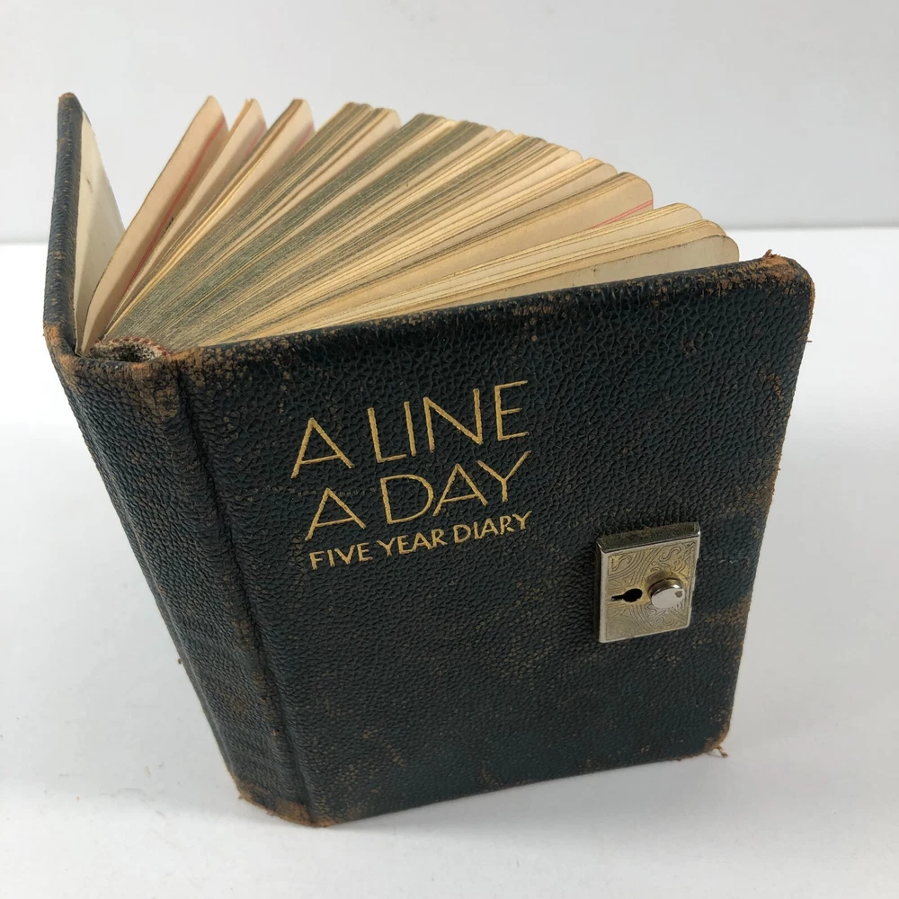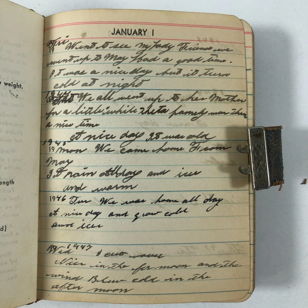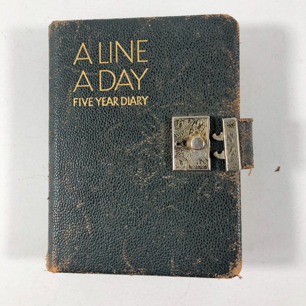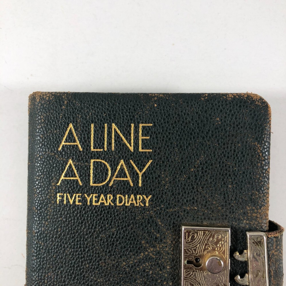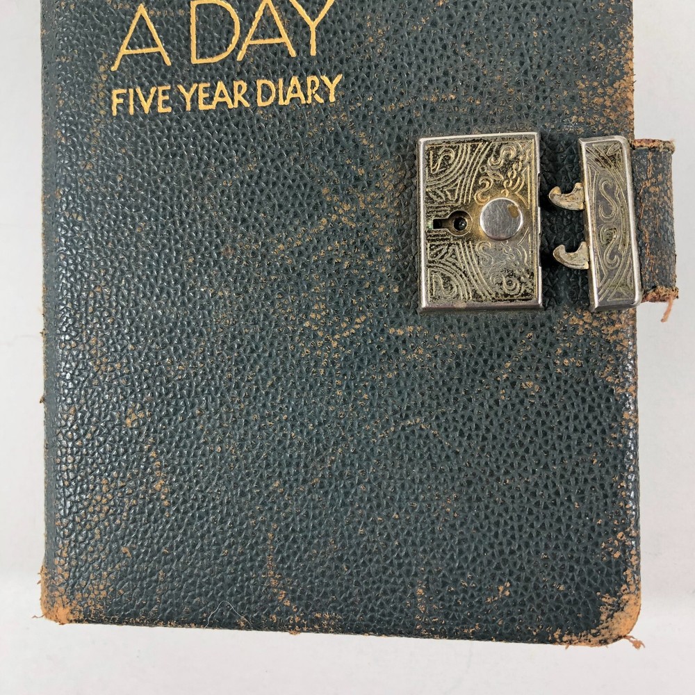 1940's WWII Era A Line A Day Five Year Diary Every Day Travels With Lady Friend . This diary appears to be in very good condition for it's age. It spans 1943-1947. Note there is a functioning lock, but no key. I was able to open simply with a small screwdriver. All pages are totally intact, binding is in very good condition. It appears that there is some type of daily entry almost every day of the five year span. It mainly discusses weather, daily life, travels with and without "My Lady Friend", mentioned frequently. This leather bound diary is definitely an enjoyable browse and read, makes a great piece of historical decor, too. Please use the zoom function over the photo to closely examine condition before purchasing. We are continually adding products to our inventory, so please come back and check out our other items! Don't forget to add our store to your favorites list! Shipping: We ship Monday through Friday, and Saturday whenever possible. I will make every effort to complete shipping with 24 hours except for Sunday's and holidays. Feedback: Positive feedback is greatly appreciated. If you have trouble with your purchase, PLEASE contact us before leaving a neutral or negative feedback. I will make every effort to correct any concern or problem you may have. We take great pride and responsibility for our sales, and in most cases can help with a problem one way or another: no matter if it is the fault of the shipper, a mistake we may have made, or just something overlooked or done accidentally by the buyer. Thanks again for looking at our listing! 012623