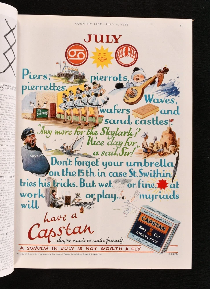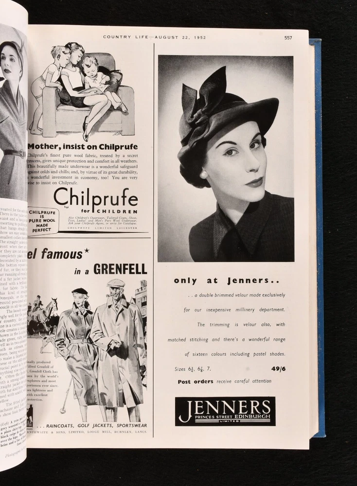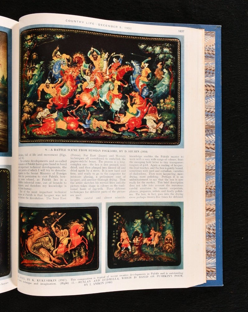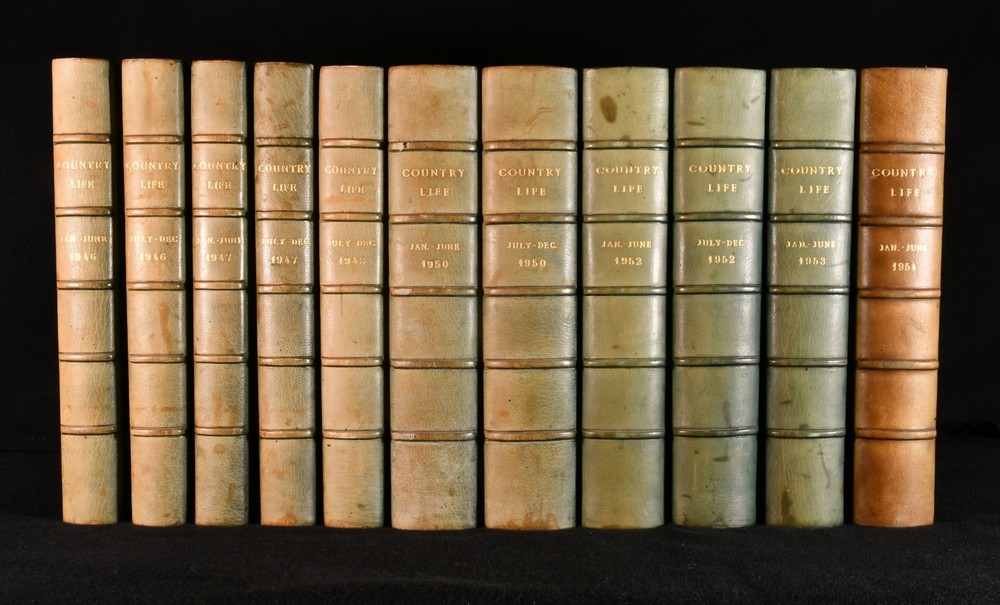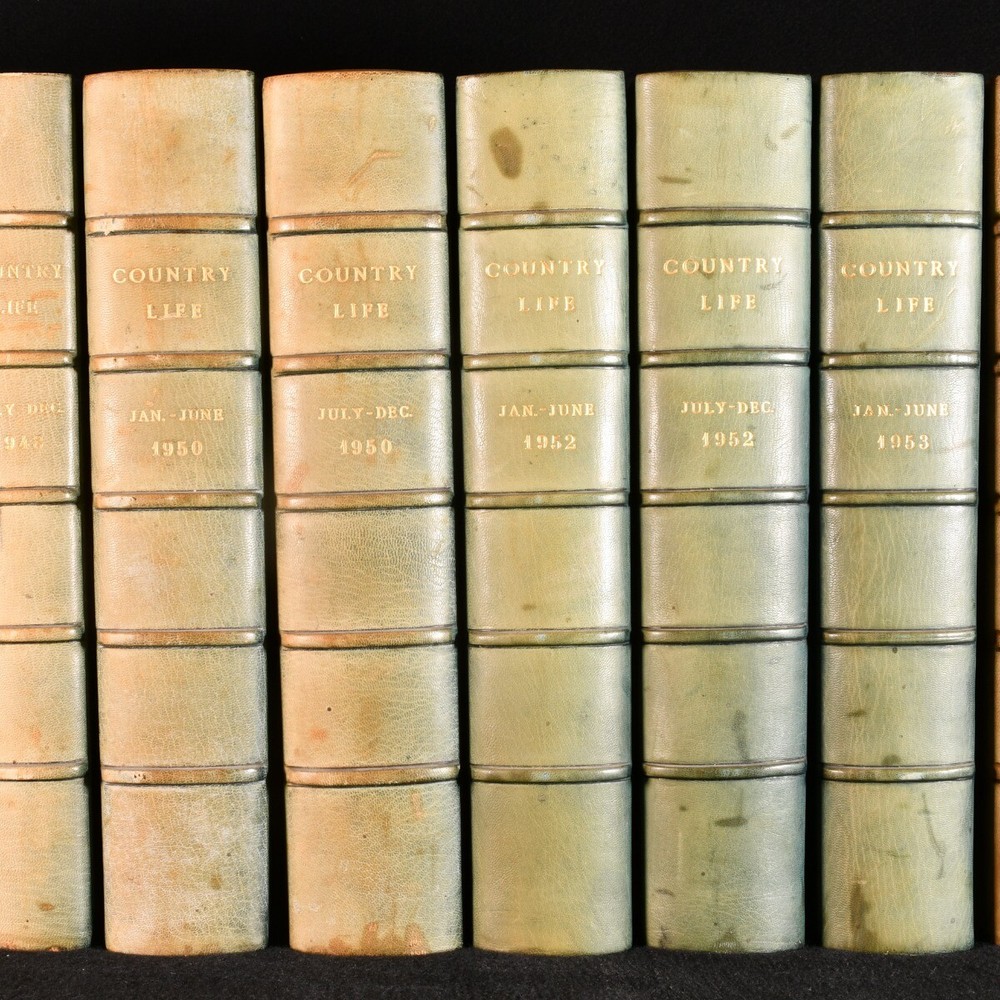 Click here to see our other books! Country Life: The Journal for all Interested in Country Life and Country Pursuits Not Stated 1946-54 The Offices of Country Life; George Newnes : London 13" by 9.5" SUMMARY A collection of eleven volumes of the Country Life magazine, uniformly bound in an attractive Sangorski and Sutcliffe signed quarter morocco. First Edition,Illustrated,Leather Binding,Pleasing Copy,Rebound Overall Condition: Very Good Indeed This book weighs 30 KG when packed UK Postage: £ 4.49 US Postage: £ 99.99 EU Postage : £ 49.99 European Postage: £ 99.99 Asia Postage: £ 187.99 Worldwide Postage: £ 276.99 DESCRIPTION A sumptuous collection of eleven large paper volumes of The Country Life journal, uniformly bound in a quarter morocco binding signed Sangorski and Sutcliffe. An excellent set. Bound without the original wraps. A British weekly magazine discussing all sorts of topics relating to the rural life, with articles on gardening, farming and fishing, furniture, horses, racing, and hunting, insects, golf, and much more. Primarily concerned with rural communities and their environment, although much of its success was built on its coverage of country houses, architecture, and gardening. Including reviews of books, wine, art and architecture, antiques and crafts. Featuring articles by notable contributors such as Bernard Darwin on golfing, Gertrude Jekyll on gardening, and Tim Yeo on politics. Illustrated with numerous decorations in text throughout. With advertisements and photographs. The present collection is comprised of the following volumes: Vol. XCIX, 1946 January to June; Vol. C, 1946 July to December; Vol. CI, 1947 January to June, one page with illustrations in colour, without the uniform title page and subject index; Vol. CII, 1947 from July to December; Vol. CIV, 1948 July to December; Vol. CVII, 1950 January to June, including seven leaves of colourful advertisements; Vol. CVIII, 1950 July to December, with eighteen leaves of colourful advertisements; Vol. CXI, 1952 January to June; Vol. CXII, 1952 July to December with twenty-five leaves of colourful advertisements; Vol. CXIII,, 1953 January to June; Vol. CXV, 1954 January to June. From the library at Julian Park, Hertfordshire, belonging to Audrey Pleydell-Bouverie. Audrey was the youngest daughter of an Anglo-American lumber and steel millionaire, sister to Edward James, a key figure in the Surrealist movement, and the illegitimate granddaughter of King Edward VII. She was an English socialite known for her beauty and for charming various wealthy men, she was included in The Book of Beauty by Cecil Beaton. A patron of the arts, she assisted Viscount Carlow financially in the publication of limited editions of numerous works by leading literary figures such as T E Lawrence, James Joyce, Wyndham Lewis, and others. A hedonistic pursuer, she was recognised as one of the 'Bright Young Things'. CONDITION In a quarter morocco binding signed Sangorski and Sutcliffe, with five raised bands, marbled endpapers, and gilt to the top edge. Externally very smart with minor shelf wear only and minor rubbing to the spine and boards, only some sunning to the spine and minor general marking. Internally, firmly bound. With a faint minor spotting to the fore edge, affecting only the endpapers. Otherwise, the pages are bright and clean. Illustrated in text throughout with numerous photographs and advertisements in black and white as well as some in colour. Overall Condition: Very Good Indeed GLOSSARY OF TERMS Overall Condition (Dustwrapper condition rating is shown after that for the book itself, where a dustwrapper is present) Fine - Very well preserved copy showing very little wear Very Good Indeed - Only one or two minor faults, really a very attractive copy Very Good - Quite a wide term meaning no major faults but probably several smaller ones often expected given the age of the book, but still a respectable copy Good - Meaning not very good. Some more serious faults as will be described in the condition report under 'condition' Good Only - Meaning one or more faults that could really do with repair Fair - As with good only above but with other faults leaving a compromised copy even after repair Poor - Really bad and possibly seriously incomplete. We only sell books in this condition where their rarity or value makes them attractive none the less. Major defects will be described. GUARANTEE We offer a full money back guarantee on our descriptions. Please ask for details and conditions. We prefer PAYPAL. If you pay via PAYPAL we will post the item off the same or the next working day with the postage you have selected. Please note we cannot accept USD cheques