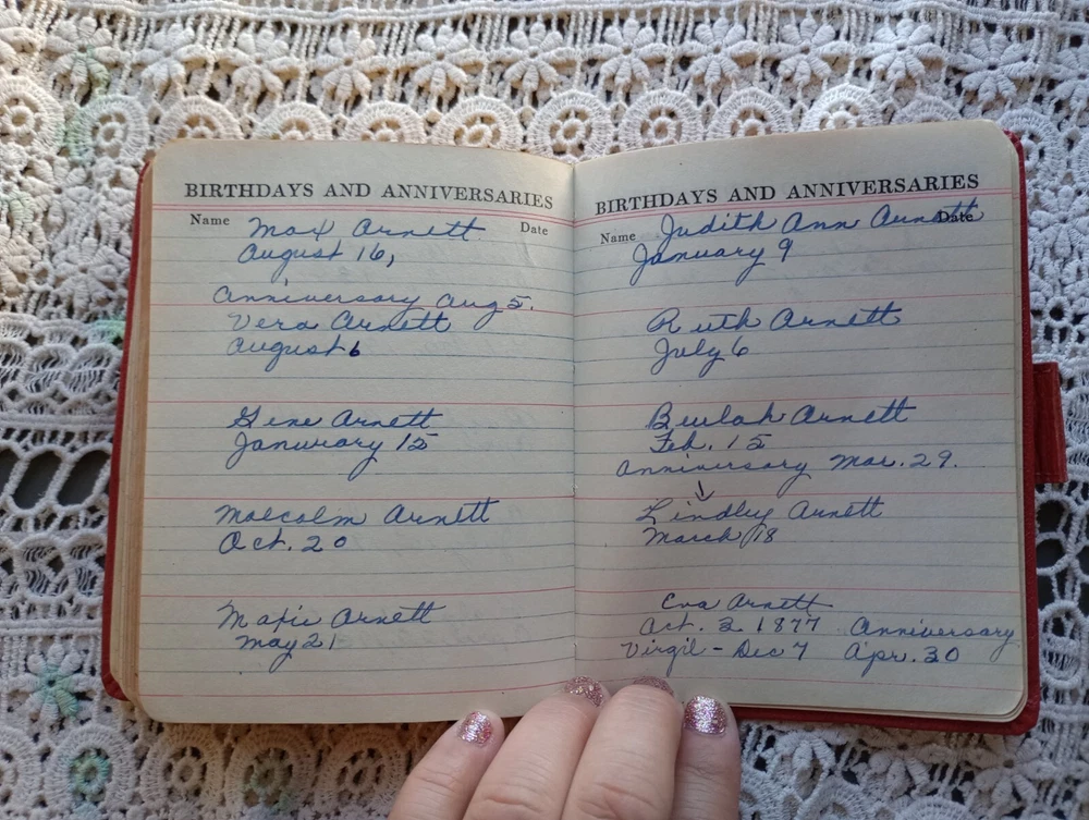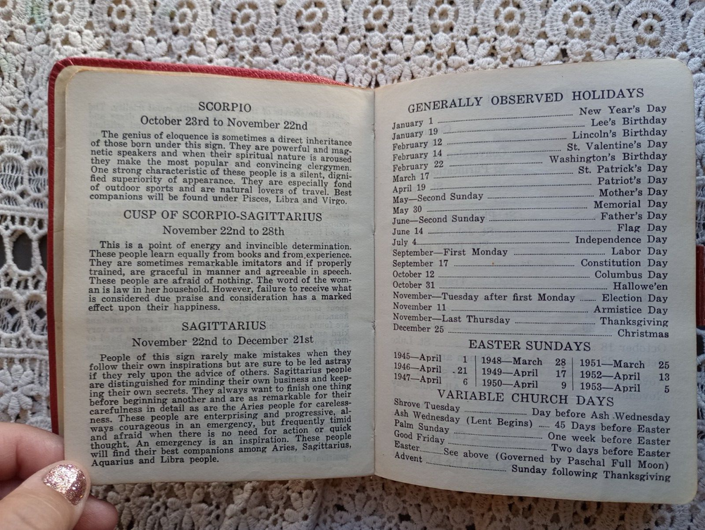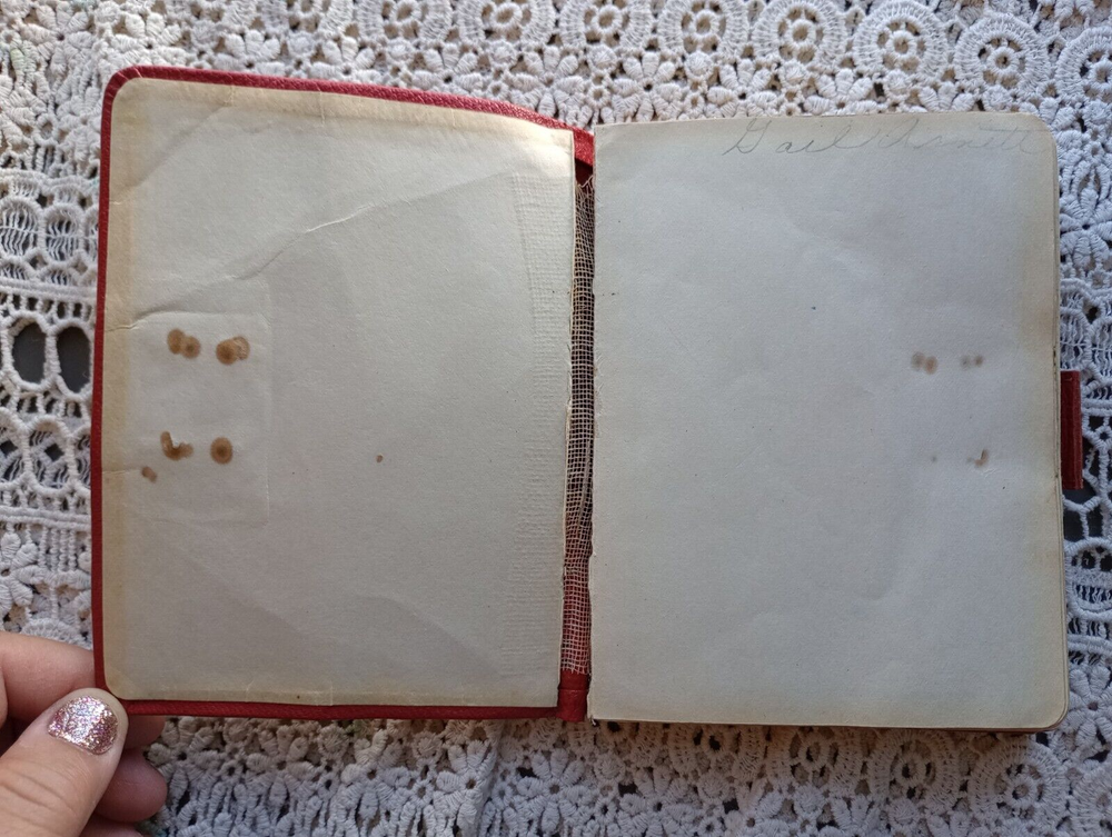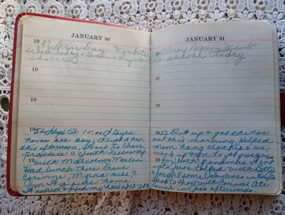 1947 5-Year Diary written by Gail Arnett starting in 1947. Most of the entries are from 1947 and 1952. There are many blank spots and some dates have been cut out. Includes horoscope info, birthdays and addresses among other things. Some of the entries indicate this was from a town in South Dakota, most likely Bowman as other items of hers are centered on that town. Nearby places include Spearfish, Baker, Fargo, Rapid (City). Other paces are Drey's Cafe, The Moline Cafe, Shrimp Valley Cafe, Stuters Farm & Ranch. As much as I can make out. I have not read all the entries. Names noted in the back sections: Rhods, Arnett, Kirchner, Steyer. also Lewton, Redd or Rydd? etc. The 1947 entries are Gail in school and by the end she's in college. Measures approximately 4" X 5.5" and 1" thick.