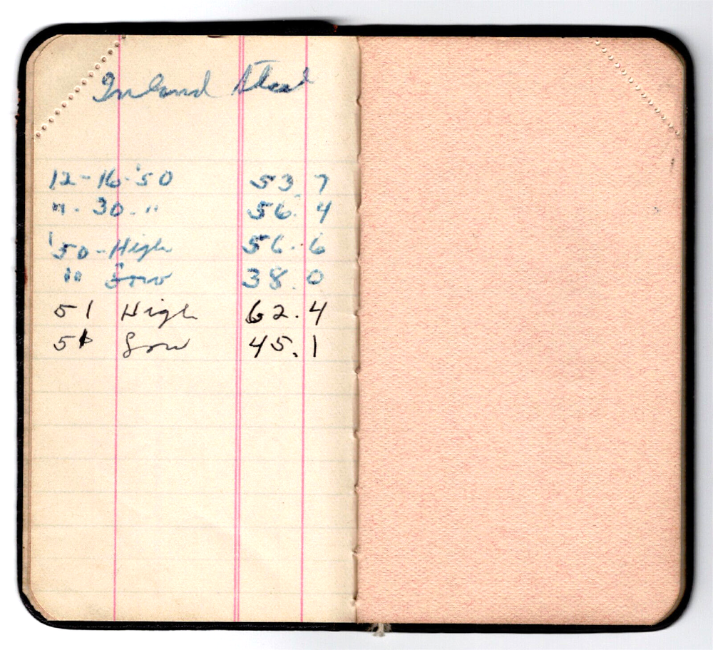 1950 First National Bank Memo Book; notes on investment purchases — measures: 2 1/4" x 4"