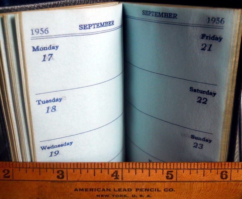 1956 DIARY Standard Dairy Company division of Wilson Jones Co in 2025 AGE 69 YRS Happy Birthday in 2025 age 69 * 1956 diary GILT STAMPED YEAR * POCKET CALENDAR Vintage 1956 made in USA - unused BLACK LEATHER pages blue tinted with gilt edges little BLACK bound book Pocket Calender / Diary*Planner/Address Book* approximate size 2 3/4"W x 4"H inches x 1/4" D * contains page for year- months 1956:1957 notes Populations of major U.S. cities WEEKLY ON 2 PAGES - i.e. Sunday through Saturday several pages for names address telephone