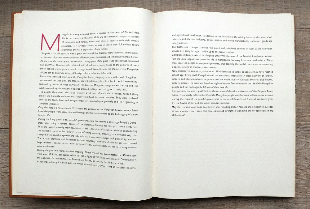 1961 MONGOLIA 40th Anniversary Excellent vintage Rare Album Book with Leather covers Preface and photo descriptions in Mongolian , Russian , English , French , Spanish and German languages Album is in excellent conditions 288 pages 266 Photo Illustrations Leather binding Size: 26 x 33 cm ( 10,2 x 13 inch) Weight: 2,1 Kg Worldwide shipping