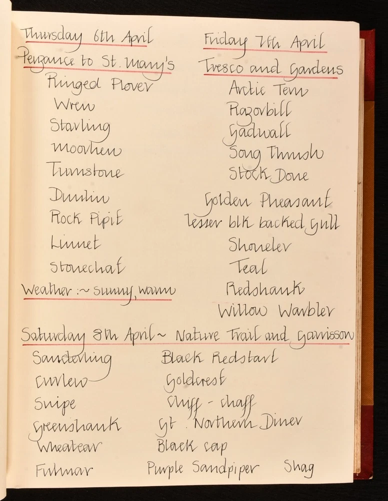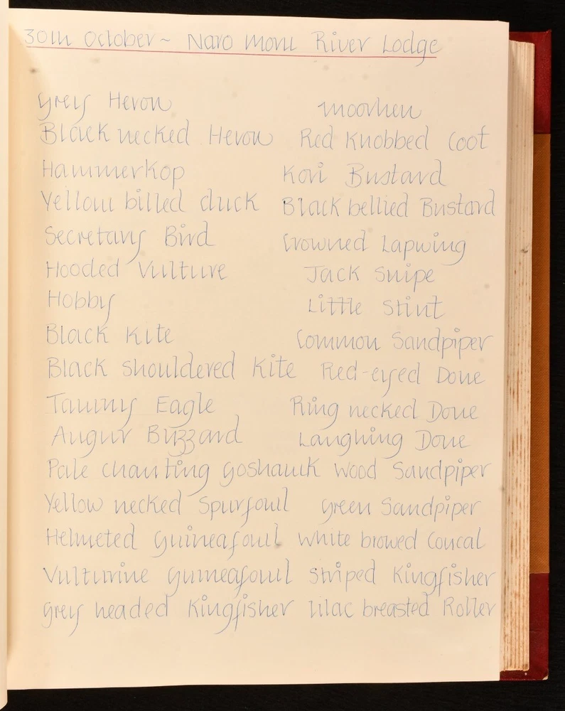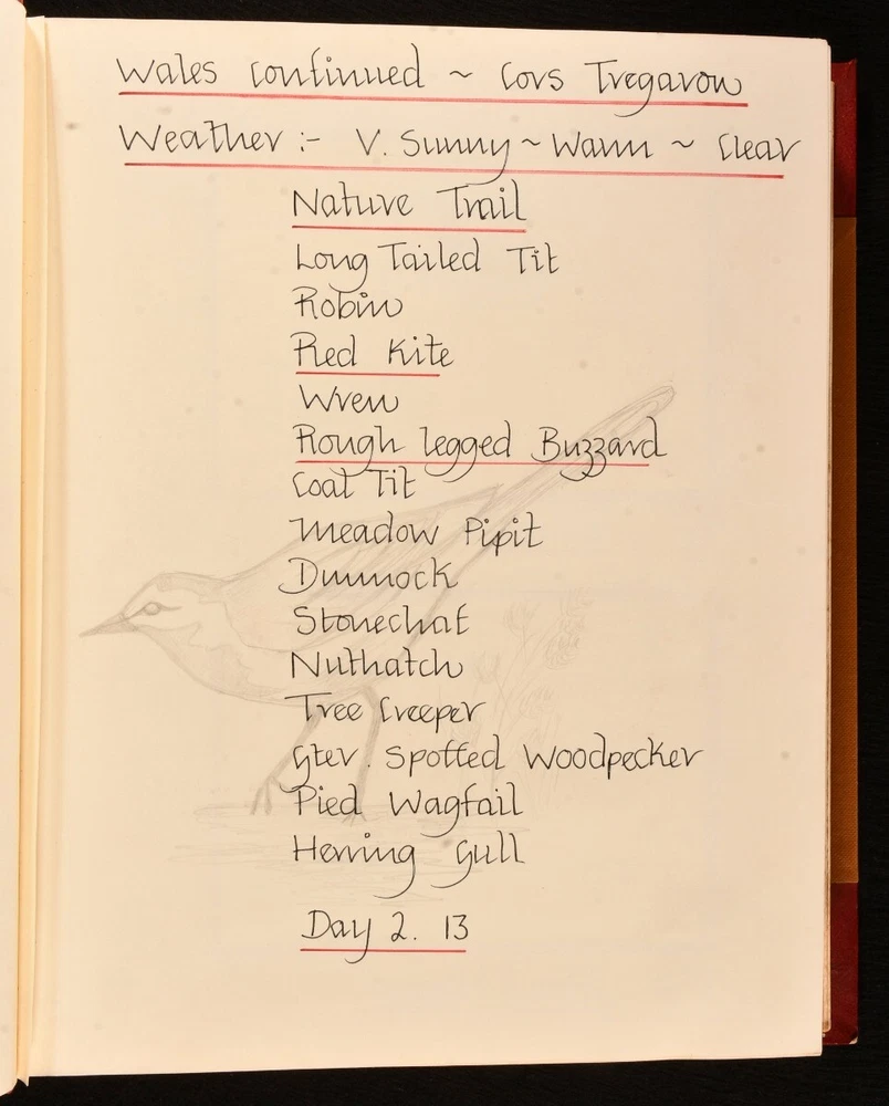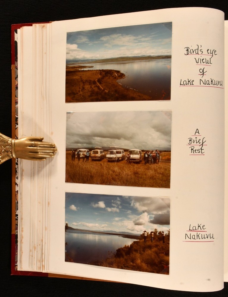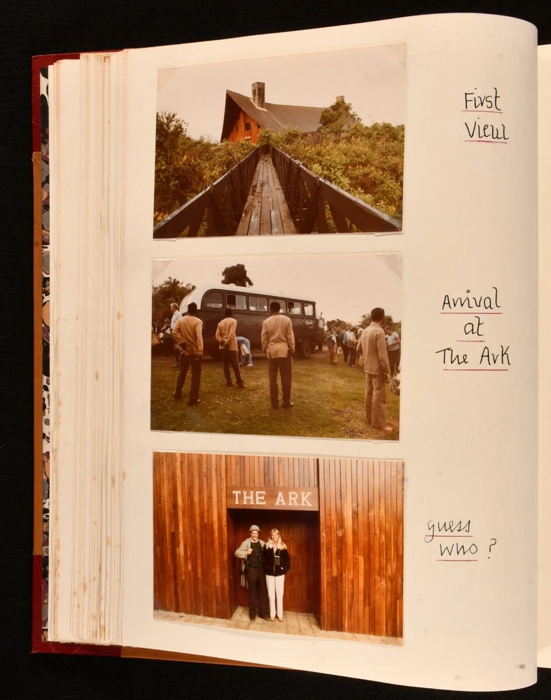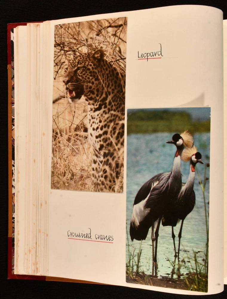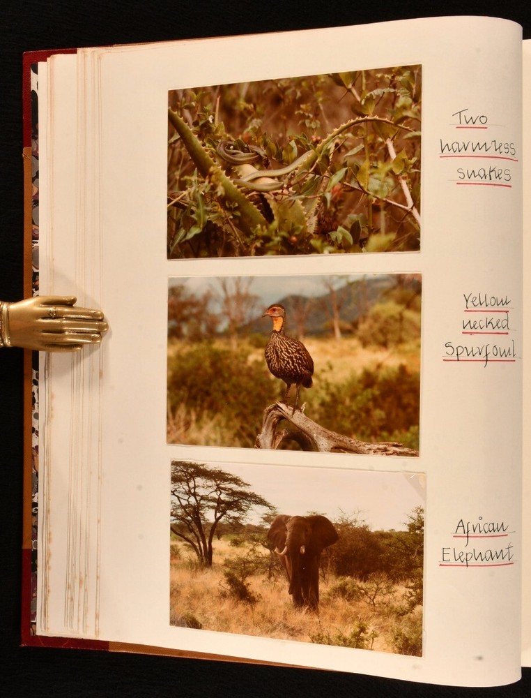 Click here to see our other books! The Love of Wild Life Mary Maughan 1977-79 None : None 13" by 10.5" Unpaginated SUMMARY A very unique hand-produced journal, recounting ornithological and zoological tours undertaken by a Mary Maughan, compiled with original photographs and drawings. Colour Plates,Illustrated,Leather Binding,Very Scarce Overall Condition: Near Fine This book weighs 3 KG when packed UK Postage: £ 3.99 US Postage: £ 36.99 EU Postage : £ 25.99 European Postage: £ 27.99 Asia Postage: £ 47.99 Worldwide Postage: £ 69.99 DESCRIPTION A beautiful and unique hand-produced ornithological and zoological journal. With one striking hand-painted plate to the front, alongside a total of twenty-five original photographs, forty-three postcards, and three clippings. Fifteen pages also have charming pencil sketches of birds. This journal was compiled by a Mary Maughan, and details her trips to the Scilly Isles, Wales, England, Kenya, and India. Mary faithfully lists all of the birds sighted on these trips, written in neat hand. One of the trips detailed was to Kenya, led by the noted ornithologist James Ferguson-Lees - one of the photographs shows Ferguson-Lees. The second part of the work focuses on Mary's trip to India, on a 'leisurely tour in the company of experts' a tour from the 10th to 27th February of 1979; brochure for this work is bound in. Two birthday cards loosely inserted, both wishing Mary a happy 21st birthday. CONDITION In a half morocco binding with cloth to the boards. Externally, smart. Spine is a little faded. A few light marks to the boards. Spots to the fore edge. Internally, firmly bound. Pages are bright and clean. Overall Condition: Near Fine GLOSSARY OF TERMS Overall Condition (Dustwrapper condition rating is shown after that for the book itself, where a dustwrapper is present) Fine - Very well preserved copy showing very little wear Very Good Indeed - Only one or two minor faults, really a very attractive copy Very Good - Quite a wide term meaning no major faults but probably several smaller ones often expected given the age of the book, but still a respectable copy Good - Meaning not very good. Some more serious faults as will be described in the condition report under 'condition' Good Only - Meaning one or more faults that could really do with repair Fair - As with good only above but with other faults leaving a compromised copy even after repair Poor - Really bad and possibly seriously incomplete. We only sell books in this condition where their rarity or value makes them attractive none the less. Major defects will be described. GUARANTEE We offer a full money back guarantee on our descriptions. Please ask for details and conditions. We prefer PAYPAL. If you pay via PAYPAL we will post the item off the same or the next working day with the postage you have selected. Please note we cannot accept USD cheques