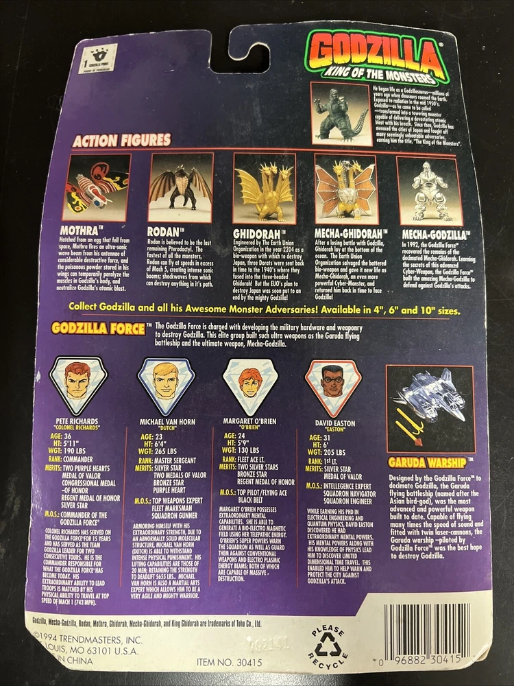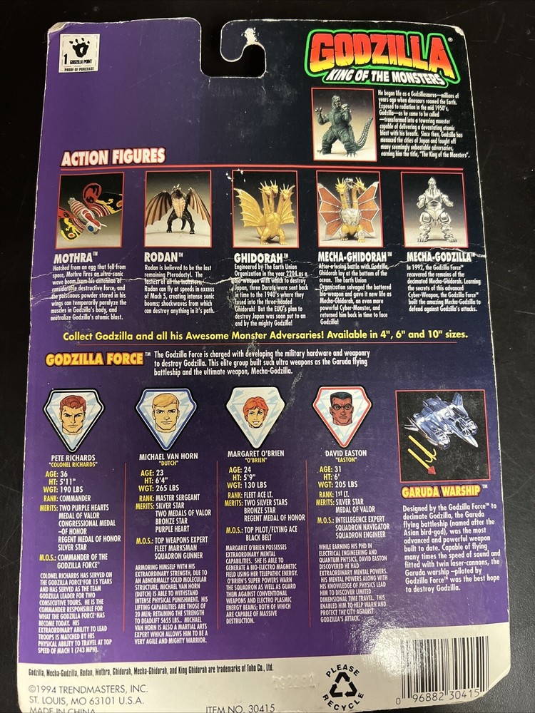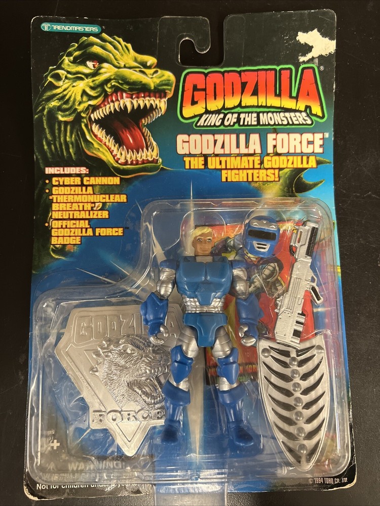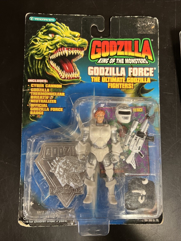 Lot of 2 vintage original 1994 Godzilla Force Fighter Action Figures both New in packaging. Includes Margaret O’Brien and Michael Van Horn. Van Horn card shows some minor damage top right corner and is bent/curved slightly forward. See Pictures go more details as those are the exact items you will receive.
