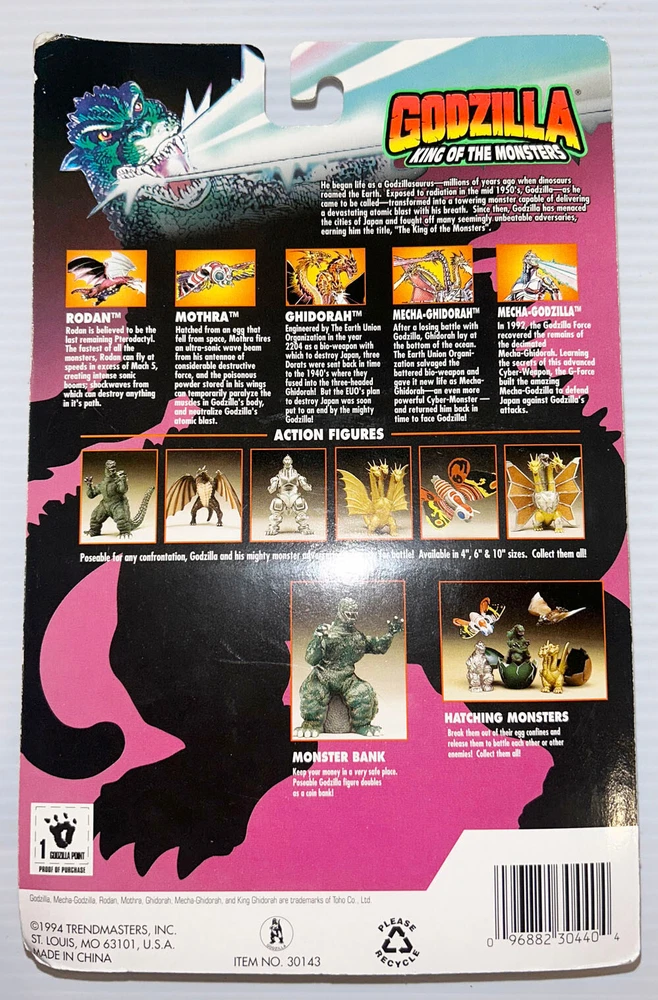 Up for sale is this MOC Trendmasters Godzillaa bendable DVD. Toy is new on card. Bubble is nice, however the glue has dried on the side and bottom, and bubble has started to lift. Buy It Now for $35 or Make Your Best Offer! PLEASE NOTE THAT THERE ARE NO RETURNS ON ARTWORK OR TOYS. This item will ship by itself, but shipping may be reduced for multiple purchases. Shipping for this item will be 11 bucks more, and will arrive via USPS. This price includes confirmation. eBay requires a method of shipment but I’m not sure it will be by Priority Mail. I will combine shipping for multiple wins, and will ship to all 50 states as well as internationally, but those outside the U.S. please contact me before bidding. I am at this point forward ONLY ACCEPTING PAYPAL. Any questions just let me know, please. I will likely contact you within 24 hours (usually much less) of your email. If there is a problem with your item PLEASE contact me and we will definitely work out a solution. I want your purchase and buying experience to be to your satisfaction! Thanks and God bless! ...filcore out.