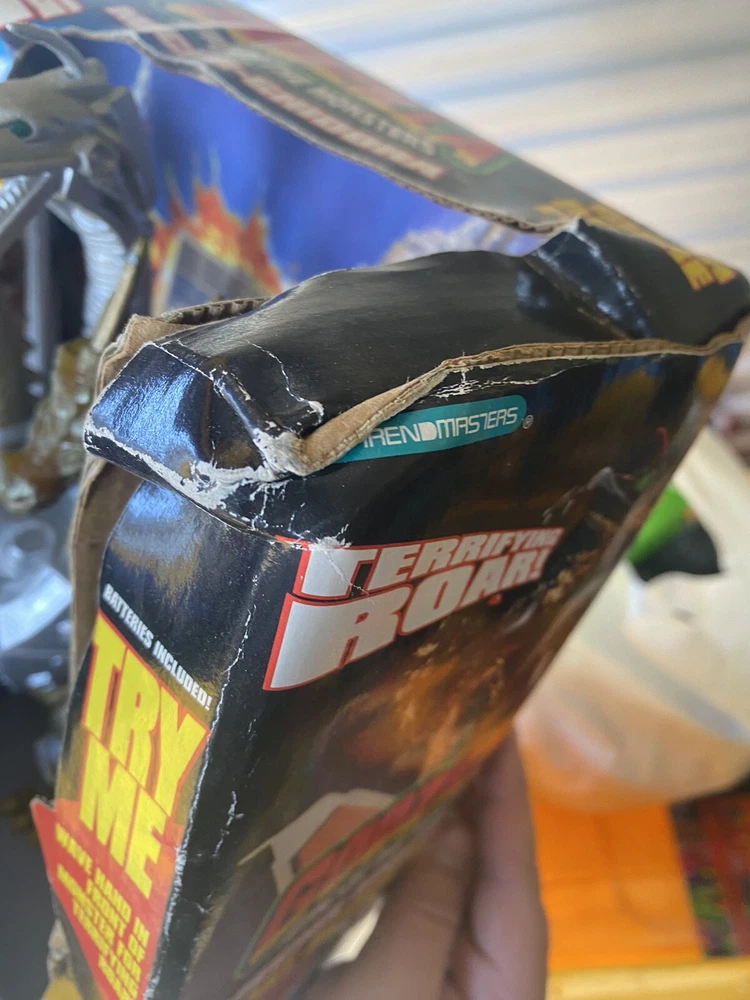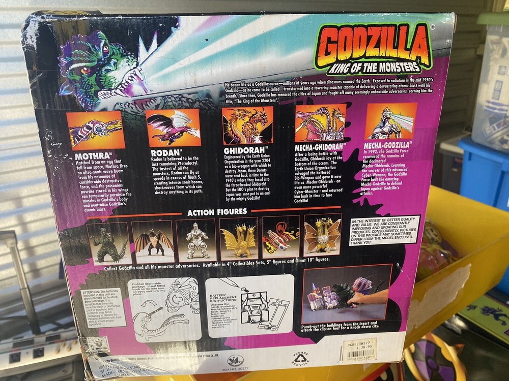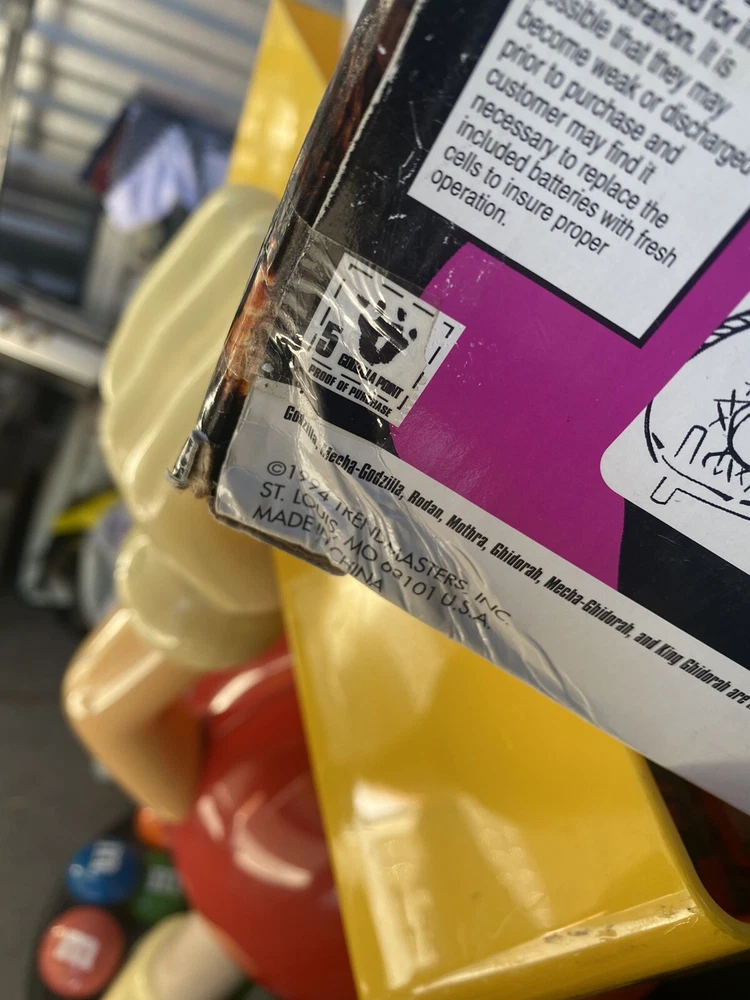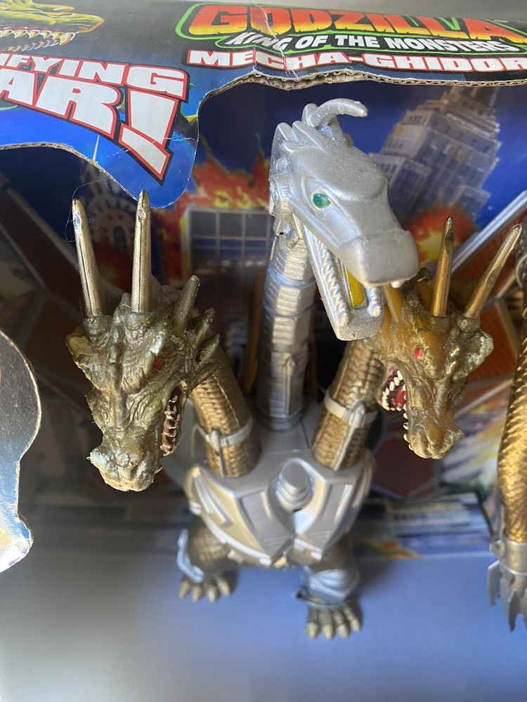 The product is a 1994 Trendmasters Godzilla King of monsters Ghidorah giant figure, brand new in box. It is a toy from the Godzilla theme, featuring a monstrous character known as Ghidorah. The figure is a part of the Trendmasters collection, released in 1994. Note: box a little ruff , sound doesn’t work because of age
