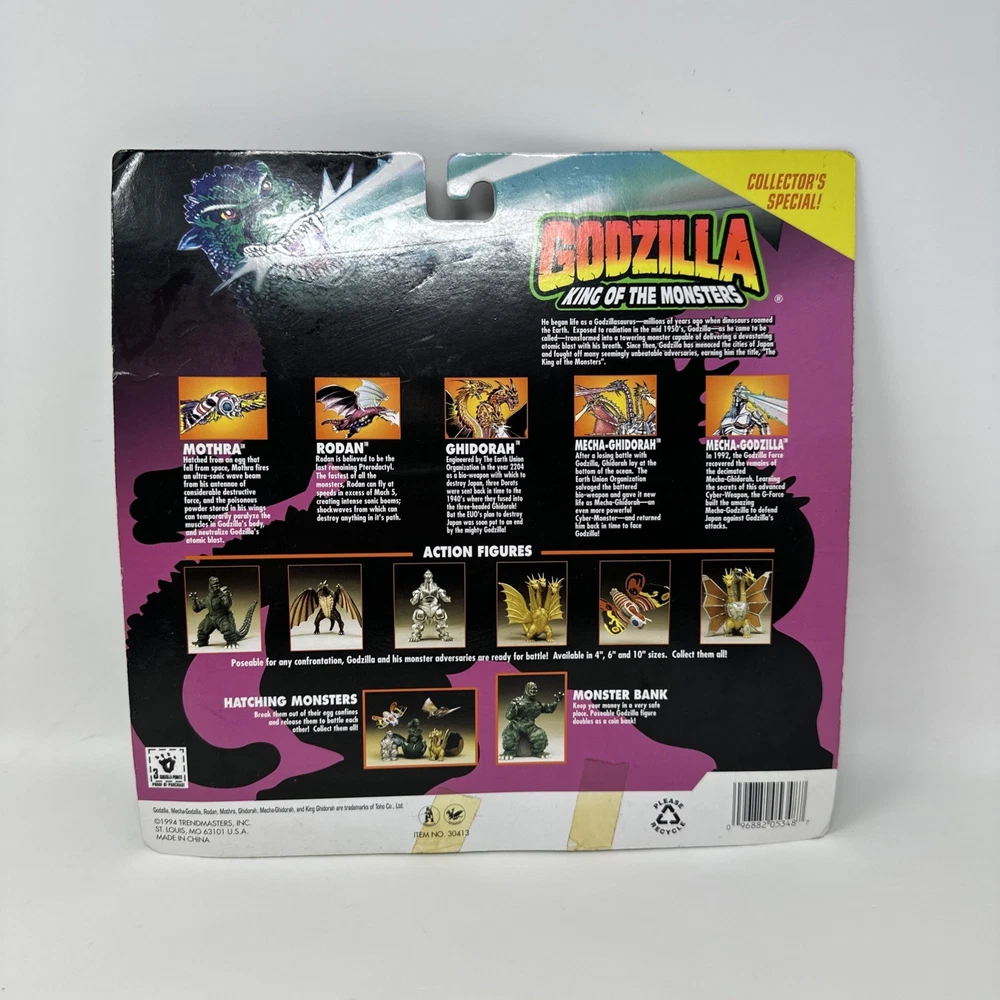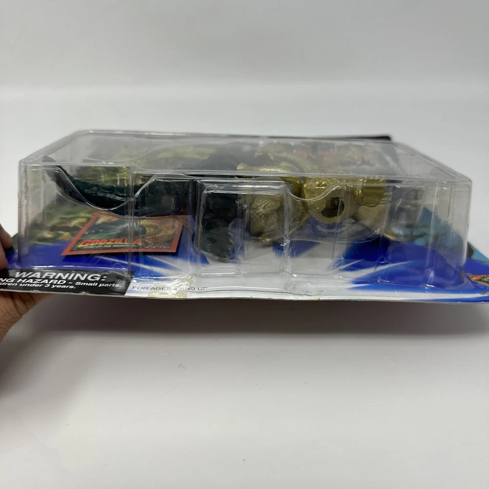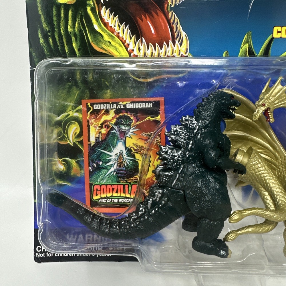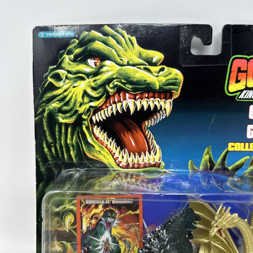 This 1994 Trendmasters Godzilla vs Ghidorah King of the Monsters action figure is sealed in original packaging, making it a standout collectible for fans of the classic kaiju franchise. Featuring detailed sculpts and vibrant paint, this vintage figure captures the epic battle between Godzilla and King Ghidorah. Part of the King of the Monsters line, this piece brings nostalgic '90s toy design to life and is a must-have for any serious Godzilla collection. Brand: Trendmasters Year: 1994 Franchise: Godzilla Figure: Godzilla vs Ghidorah Condition: Brand new and sealed; packaging shows minor wear consistent with age Includes: Sealed figure in original bubble card packaging Perfect for display or preservation, this vintage figure is a rare find in sealed condition. Please inspect all photos carefully to assess packaging condition before purchasing.