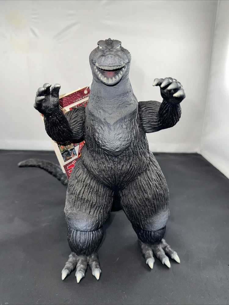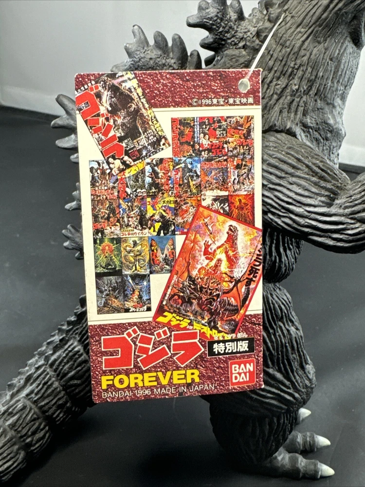 1996 BANDAI 9” GODZILLA 1962 WITH TAG Vinyl Figure GODZILLA FOREVER Version. Beautiful tag!!! Very similar to the memorial box version but the nail paint is white and the head chest and knees have gre...