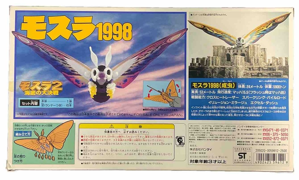 This item is like new in box. This 1998 Bandai Mothra 2 action figure is a must-have for any Godzilla fan. With intricate detailing and a durable build, this toy will provide hours of entertainment. The figure features Mothra battling under the deep sea, making it a unique addition to any collection. This toy was made in 1998 and is part of the Godzilla theme. The brand is Bandai, ensuring quality and accuracy. This item is perfect for collectors or for children looking for a fun and exciting toy.