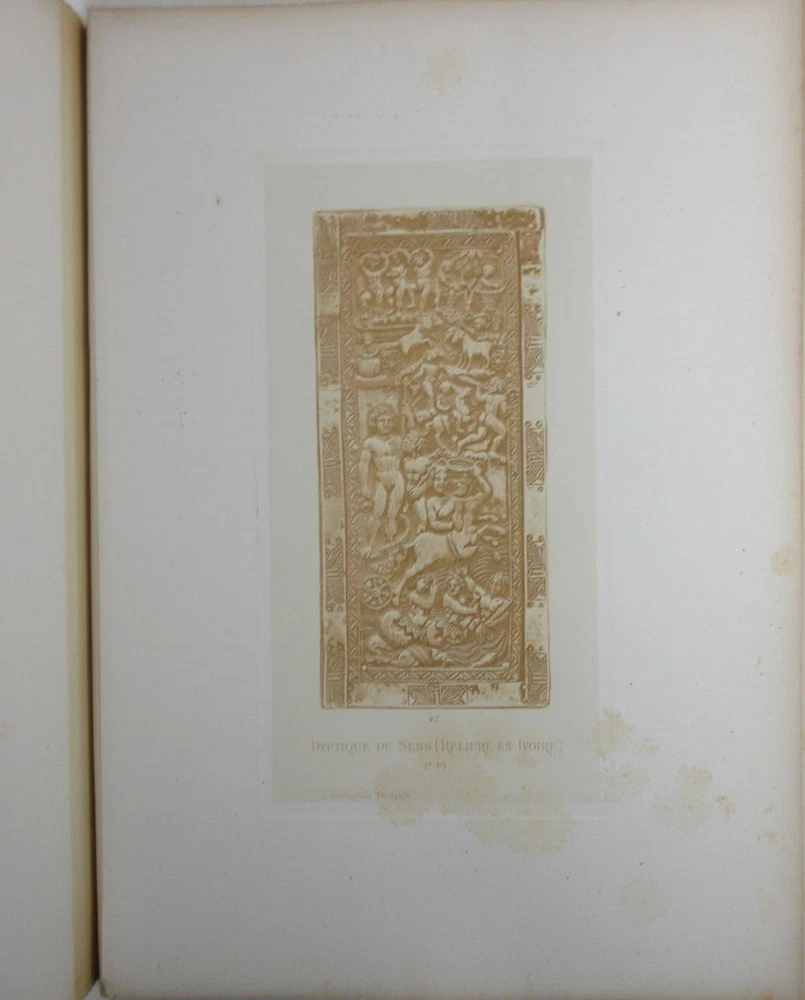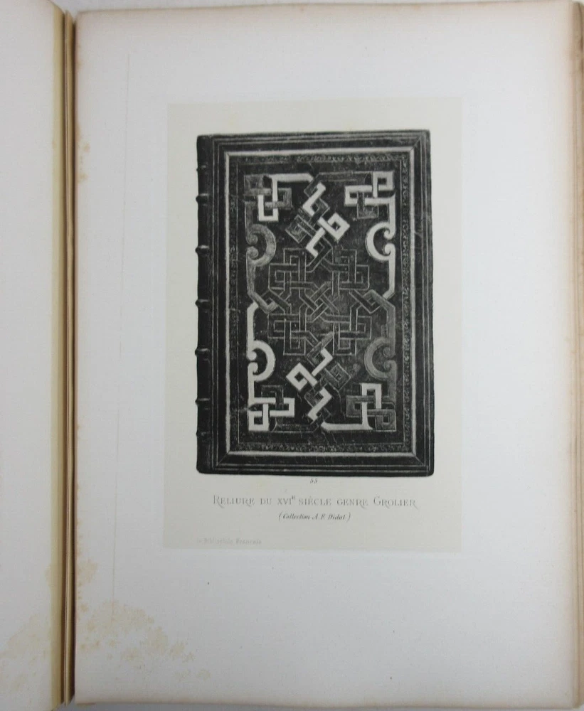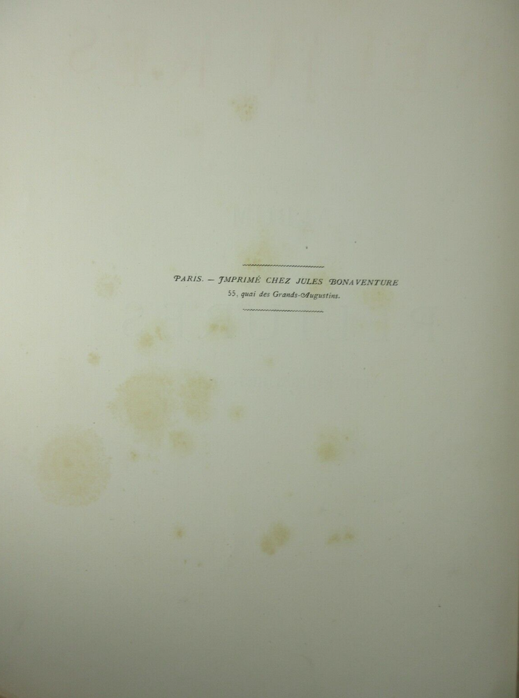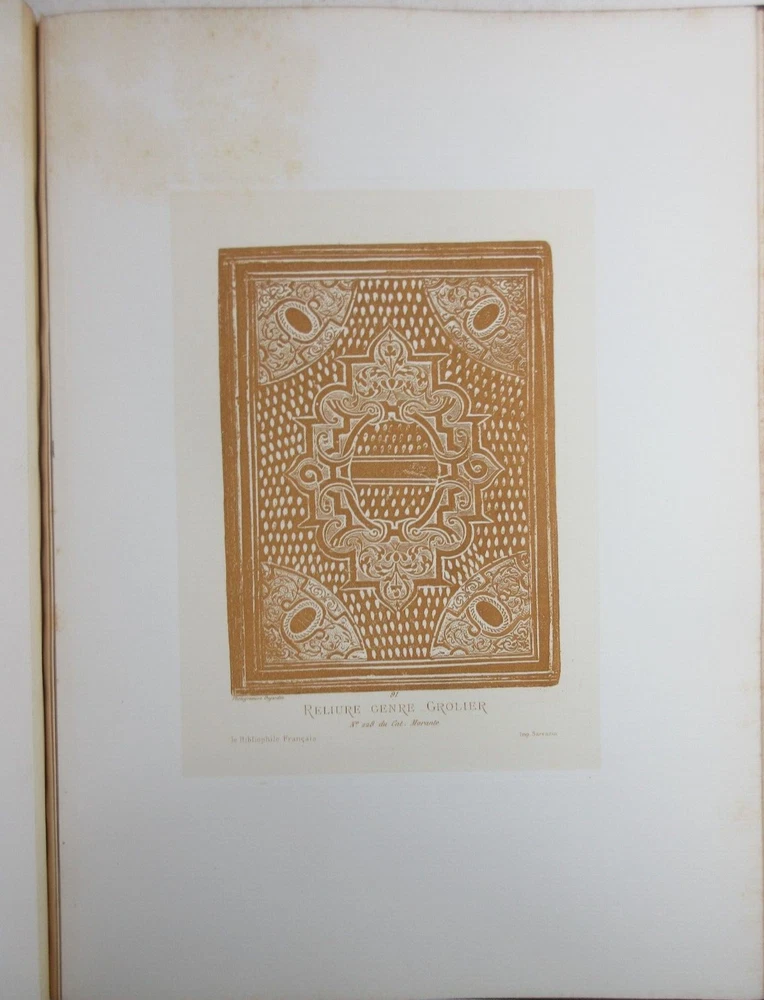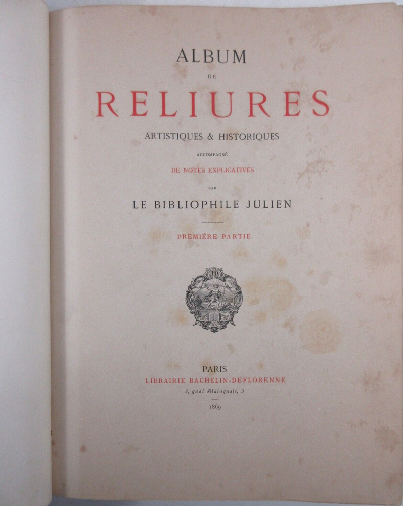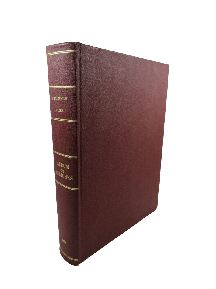 For sale is a rebound French-language hardback first edition of Album de Reliures: Artisitques & Historiques by Le Bibliophile Julien. Illustrated with the majority of the book being colored plates. Published by Librarie Bachelin-Deflorenne in Paris, 1869. Rebound in 4 parts, binding is sound and pages are generally unmarked with the exception of foxing and age spotting/toning throughout. Red hardcover boards show extremely light shelf wear. shelf reference # L-536