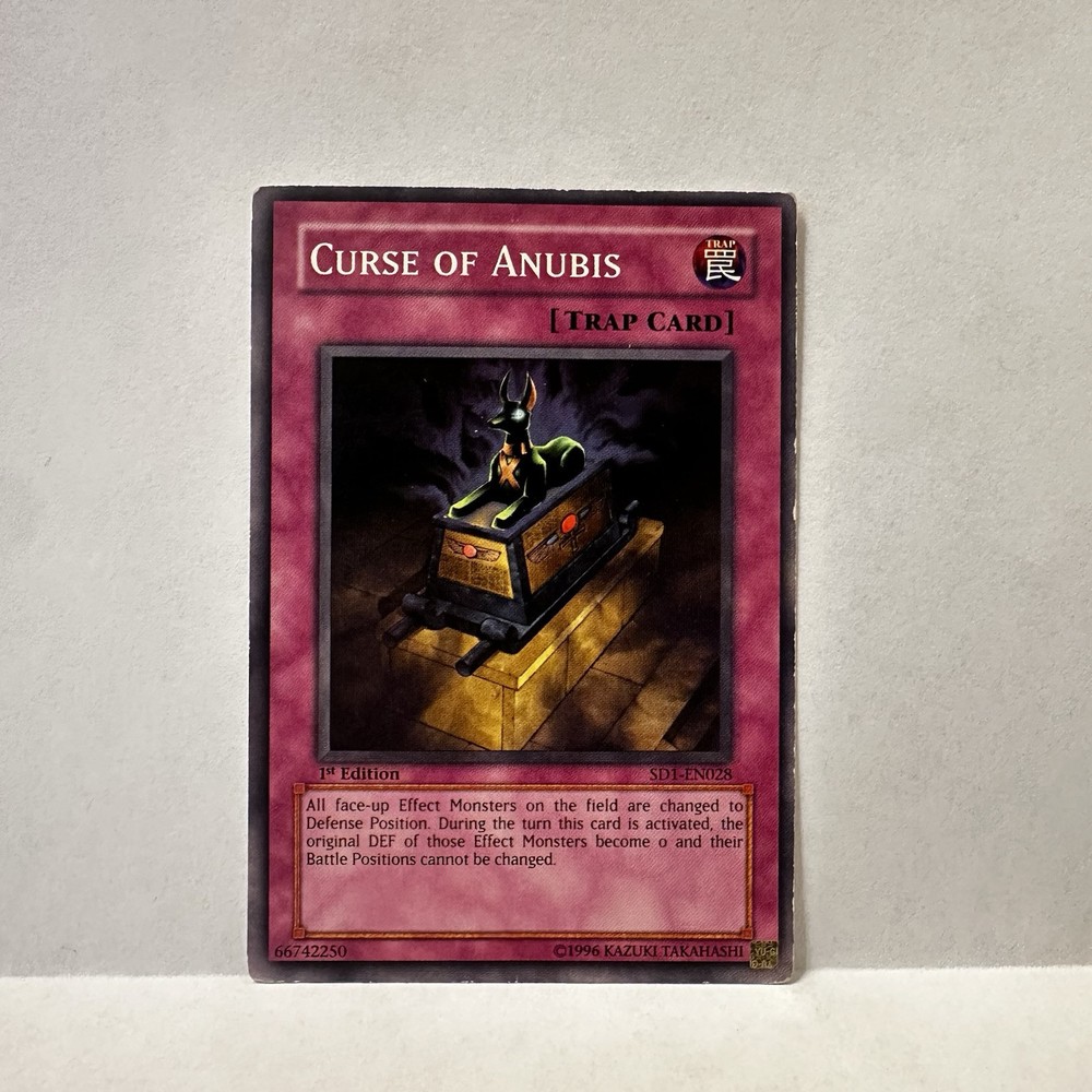 Elevate your Yu-Gi-Oh! TCG collection with the iconic Curse of Anubis from the Structure Deck: Dragon's Roar set. As a 1st Edition Common / Short Print Trap-Normal card, SD1-EN028 stands out with its unique abilities and strategic importance in gameplay. The card is printed in English, ensuring accessibility and comprehension for players and collectors alike. Crafted by Konami, this card boasts a sleek design and details that resonate with the rich heritage of the Yu-Gi-Oh! universe. With an attack power of 0 and defense toughness also set at 0, Curse of Anubis utilizes a different aspect of Trap cards, making it a valuable addition to any deck or display.