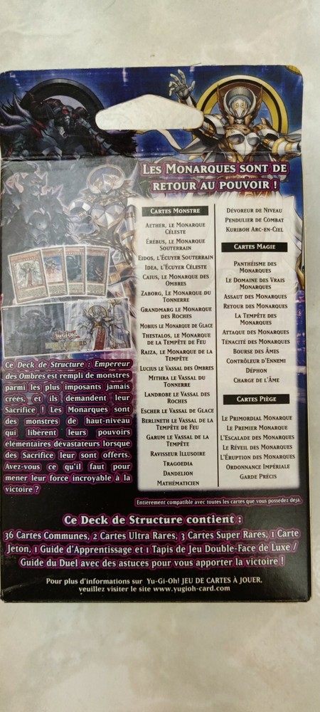 1x Yu-Gi-Oh! FRENCH Emperor Of Darkness Structure Deck - BRAND NEW & SEALED Yu-Gi-Oh! TCG Emperor Of Darkness Structure Deck With the addition of several brand-new cards and a ready-to-play Deck that makes these Monsters more powerful than ever, ancient Monarchs are back to rule with the Emperor of Darkness Structure Deck ! The Emperor of Darkness Structure Deck is filled with some of the most imposing Monsters ever made, and they demand Tribute! Monarchs are high-Level monsters that unleash their devastating elemental powers when Tributes are offered to Summon them. Strike a combo using the mighty Erebus the Underworld Monarch with new support cards like Eidos the Underworld Squire or The Prime Monarch , to thwart your opponent’s strategy and reinforce your Deck! In addition to this 41-card Deck, Duelists can add a brand-new Token card to their collection. With a mix of new and classic cards, this popular theme appeals to both beginning and existing players. The Emperor of Darkness Structure Deck contains 41 cards: 36 Common Cards 2 Ultra Rare Cards 3 Super Rare Cards 1 Token Card 1 Beginner’s Guide 1 Double-sided Deluxe Game Mat/Dueling Guide Emperor Of Darkness Structure Deck 1 Deck SR01-FR 1st Edition Mint/Near Mint Condition Language: English Shipping from: Canada Shipping to: Canada, USA All card(s) are shipped in a hard plastic top-loader sleeve, securely taped. All item(s) in the listing are 100% Konami TCG authentic and are ready for tournament use. Photo(s) are of the actual item(s). Shipped from a smoke-free and pet-free home. Seller does not provide combine shipping discounts. Returns NOT accepted. All sales are final. Payment method(s) accepted: PayPal Seller reserves the right to cancel, modify or remove the listing at any time. IMPORTANT: ALL ORDERS THAT TOTAL TO/AND OR ABOVE $50.00 (INCLUDING REGULAR SHIPPING COSTS ($1.93 TO CANADA/$3.93 TO USA)), MUST INCLUDE AN ADDITIONAL $20.00 CHARGE TO INCLUDE TRACKING+ DELIVERY CONFIRMATION. THIS IS A MANDATORY ADD-ON TO BETTER PROTECT BOTH THE BUYER AND THE SELLER. IF YOU DO NOT WISH TO PAY THE ADDITIONAL CHARGES, THE ORDER WILL BE CANCELED AND YOU WILL RECEIVE A REFUND IN-FULL. THANK YOU FOR YOUR UNDERSTANDING!
