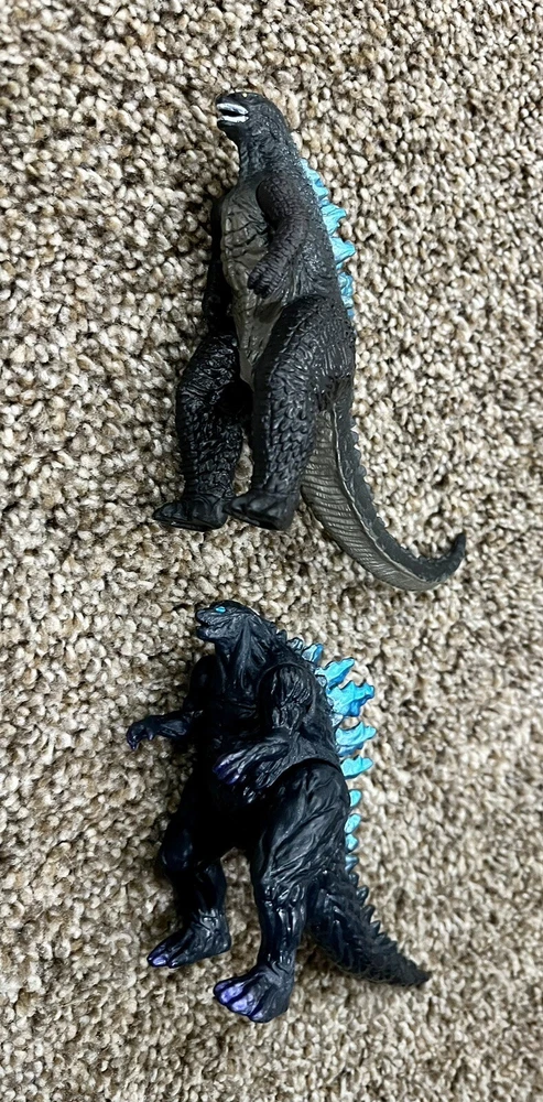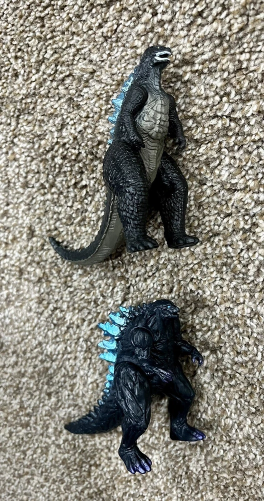 Two Godzilla 3 1/2 inch action figures blue scales on backs, arms and legs move. I do not see markings for manufacture or date. 6