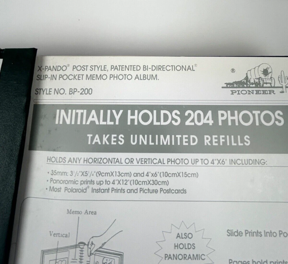 Set of 2 Pioneer Vintage Photo Albums Each Holds 200 3.5" x 5.25" and 4"x6" Photographs Dark Green with Gold Trim Accents Screwpost Binding allows for Unlimited Refill Pages Uses Refill Pages # 46BPR Memo Lines for Recording Photo Information Next to Each Photo Bi-Directional Slip In Pockets Holds Photos Horizontally or Vertically Photo Safe: Acid and PVC emission free Measures: 14: x 9.5" x 1.5" Condition: If You Wish to Purchase Multiple Items : Put items to purchase in your shopping cart, do not pay, instead Request Total. I will create a new invoice with your multiple items and new discounted shipping rate. Most of the time, I will put all items in one box to save shipping costs. If items are too large to ship together, I will choose most economic shipping for lowest cost to you. Shipping Policy: We offer Media Mail for books, music, DVDs and educational text books. Media Mail can give you a price discount, but it may take longer to arrive, please choose another shipping option if you must receive your media mail quickly. We ship USPS Ground Advantage, Priority Mail, Fed Ex, UPS and eBay Standard Envelope for Trading Cards, Postcards, Stamps and Coins. All shipping comes with tracking numbers. After receiving your payment, we will ship same day or next business day, depending on time of order. After putting your item in the shopping cart, choose the shipping tab and choose your shipping preference. Returns: Due to the inherent nature of antique, vintage, and previously owned items it is important that you please examine and review photos and or videos to determine detail conditions. If you want to return the item, for any reason other than damage (if damaged, see Notes Below) , you have 30 days to notify us that you wish to return the item. Refund will be issued once we have the item back in the same condition it was originally shipped. Return postage is the responsibility of the customer and we cannot refund original shipping cost. Item Damaged in Shipping: If your item arrives damaged SAVE all of the packaging. TAKE PHOTOS of the damaged item and packaging. Send them to me via EBAY Messaging System accessed in your order, This must be done right away, within 48 hours of receiving your item. I will need this evidence to file a claim with the postal service. Browse my shop to find unique, rare, vintage, and gently pre-owned treasures. www.ebay.com/str/vintagesunsetbeach Thank you for your interest, I hope to count you as one of my happy, satisfied customers.