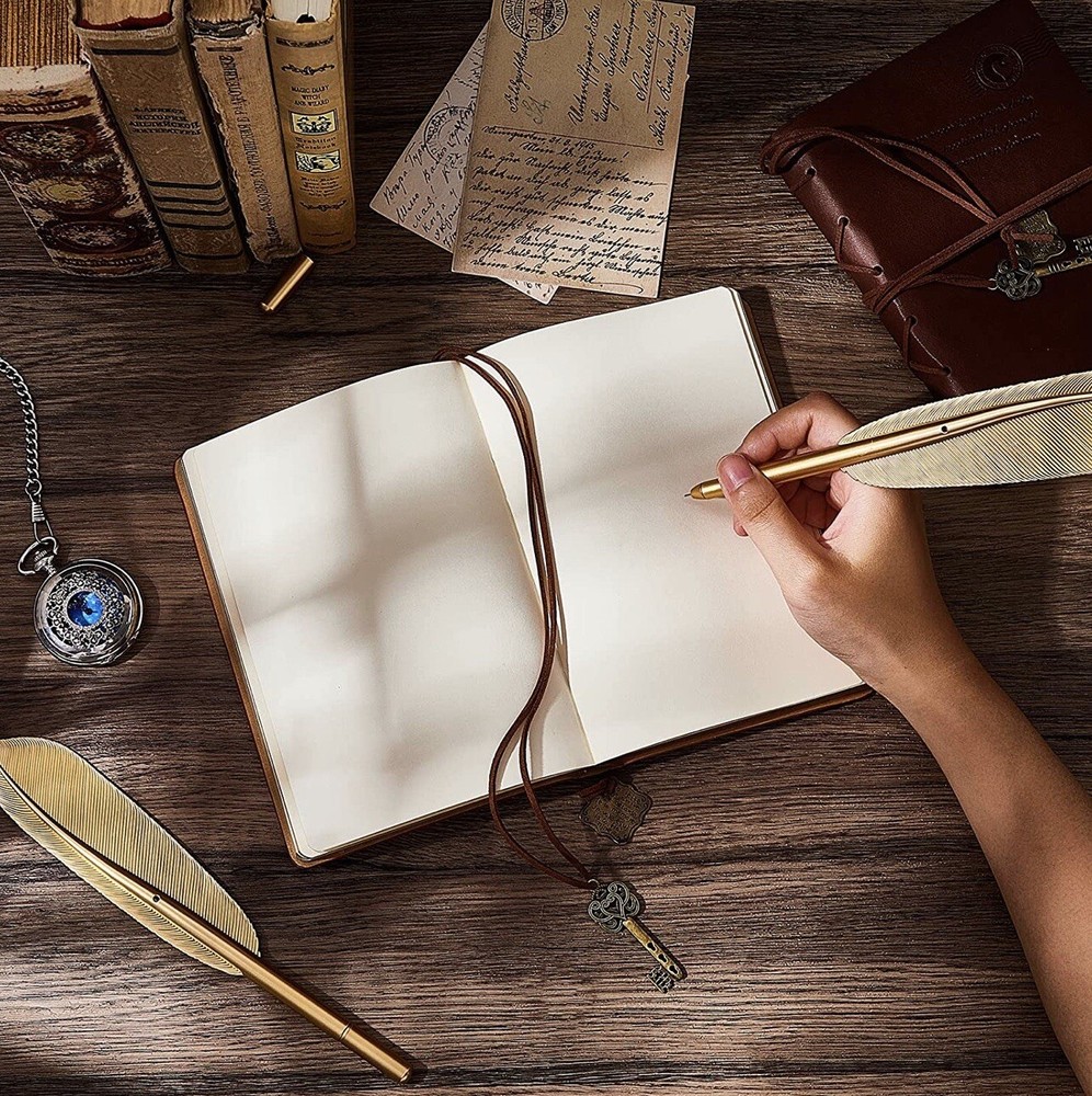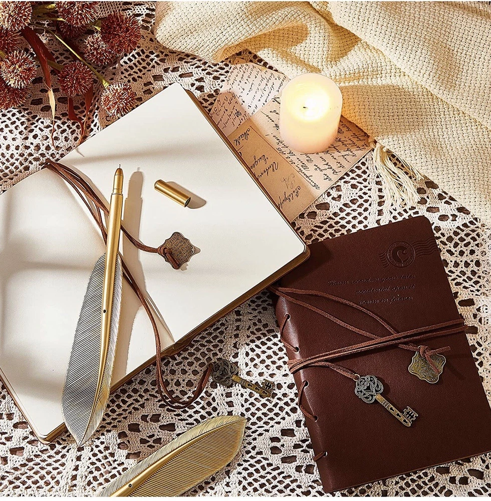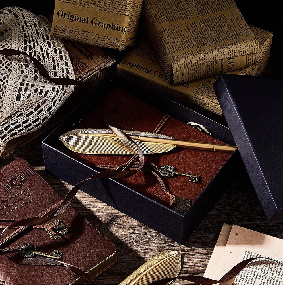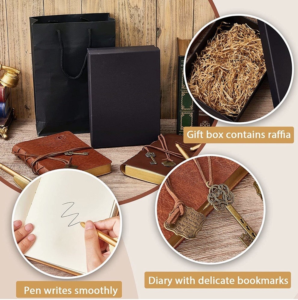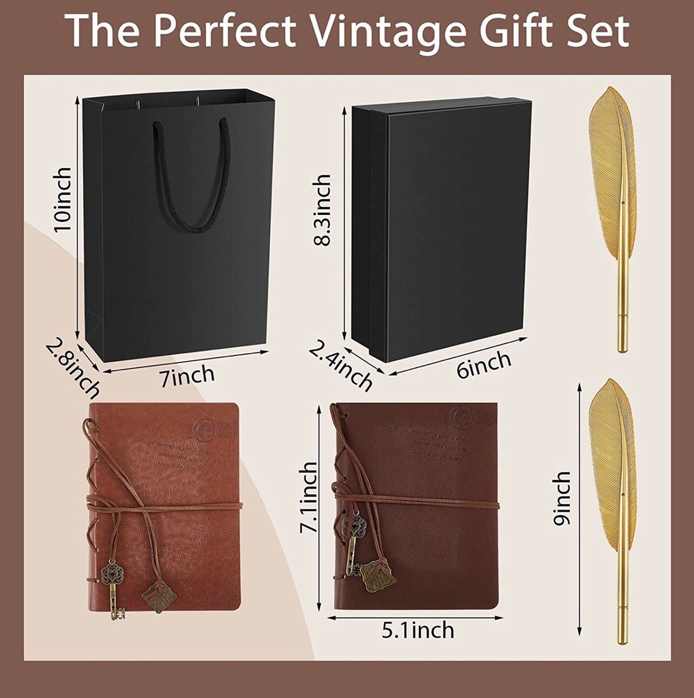 2 Set Leather Bound Journals Leather Journal Valentine Gifts. Features: Ideal and practical gift: The pen and journal gift set are not only suitable for graduates, but also for business executives, journalists, artisans, writers, or adventure lovers. They will use the set often. Cultivate writing: The leather journals for writing and feather pens are designed delicately, which may encourage you to write and record more. With time going, you may love writing and develop a good habit. Specifications: Main material: paper Color: Vintage journals: light coffee, coffee Size: Paper box: about 21 x 15 x 6 cm/ 8.27 x 5.91 x 2.36 inches Paper bag: about 26 x 18 x 7 cm/ 10.24 x 7.09 x 2.76 inches Package includes: 2 x Vintage journals 2 x Feather pens 1 x Paper box with raffia 1 x Paper bag