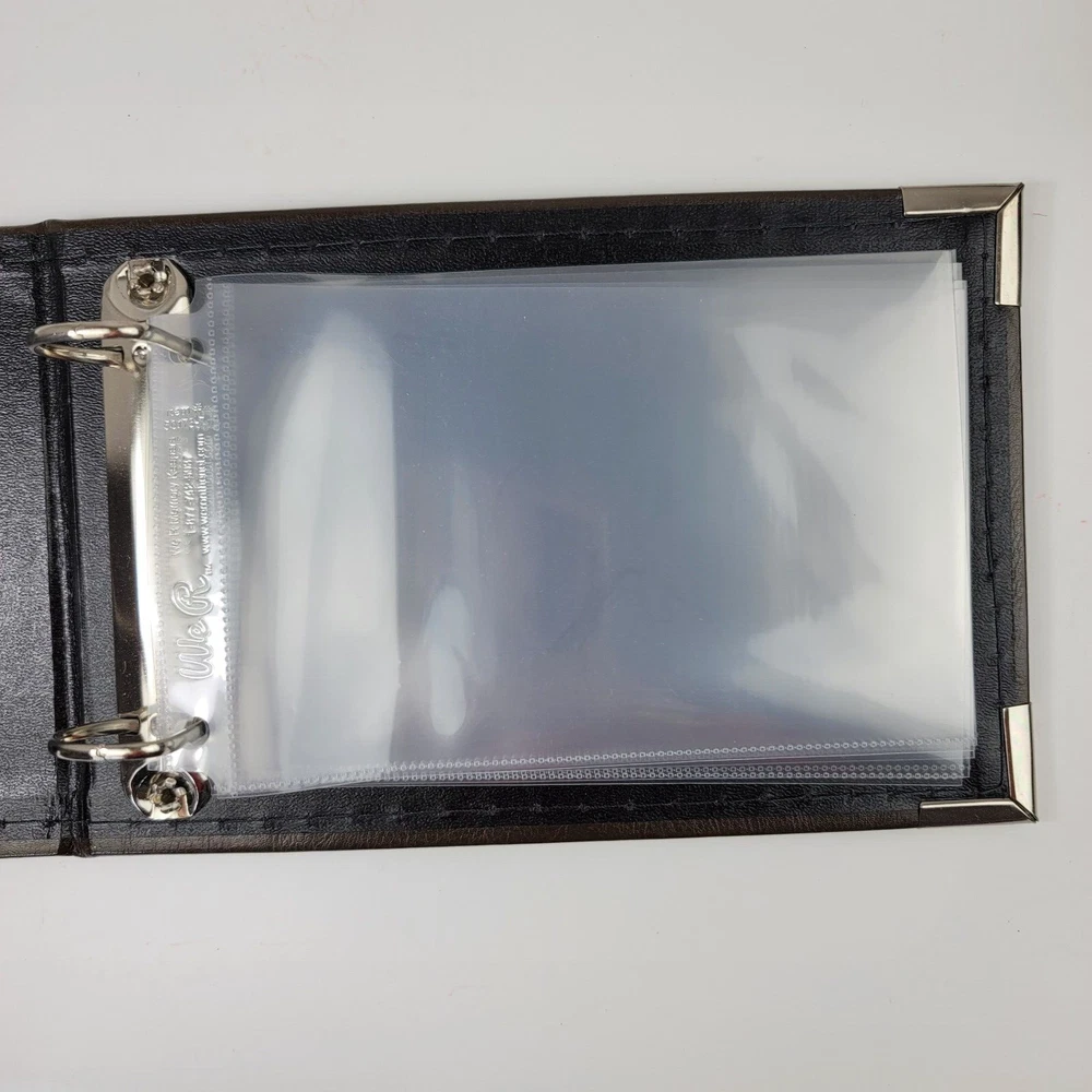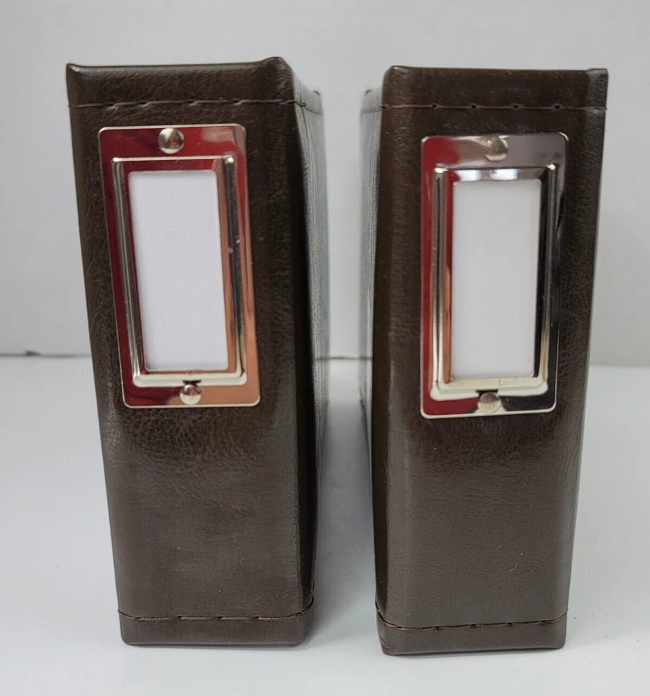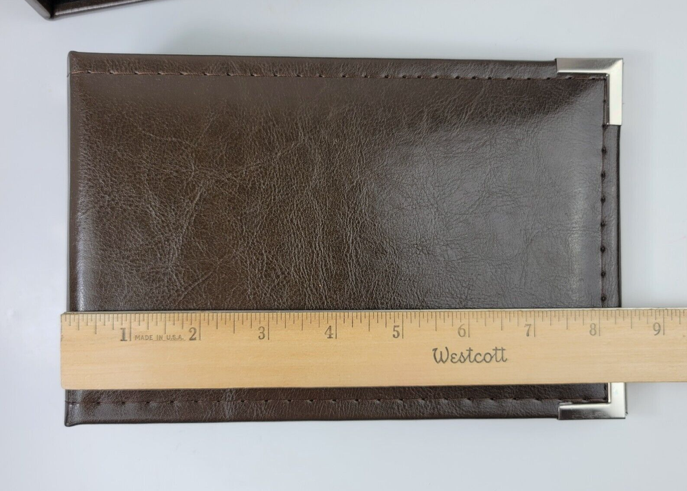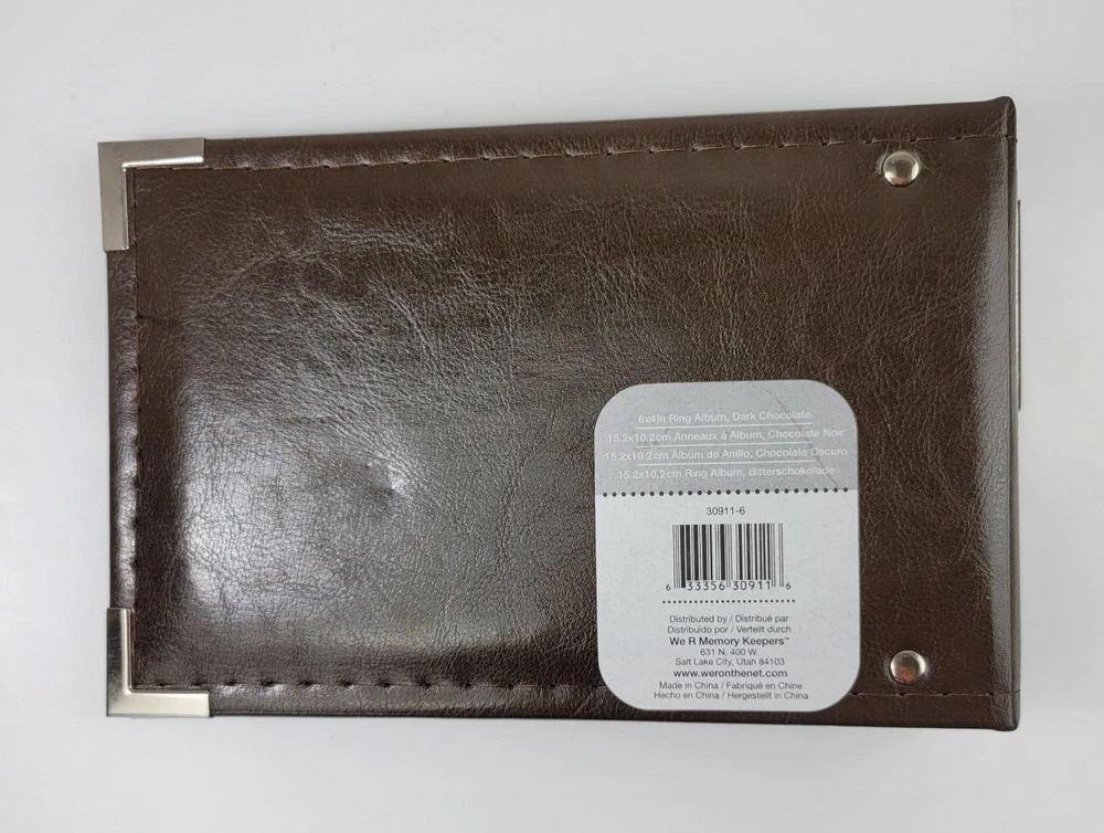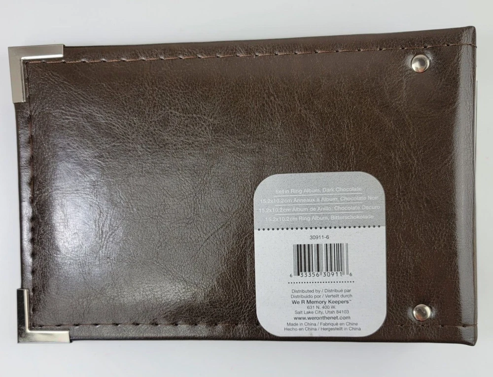 2 We R Memory Keepers Brown Leather 6" x 4" Ring Scrapbook/ Photo Album with 5- 4" x 6" Page Protectors in each album. Album measures approx. 8.5" x 5.5" x 1.75" deep. Album are unused. There is tarnish on some of the metal pieces from storage. Please see photos. This set of 2 is stored in a smoke/pet free home. Please buy with confidence that we will strive to make this an excellent transaction and you will enjoy your item. Please notice no returns. Thank you.