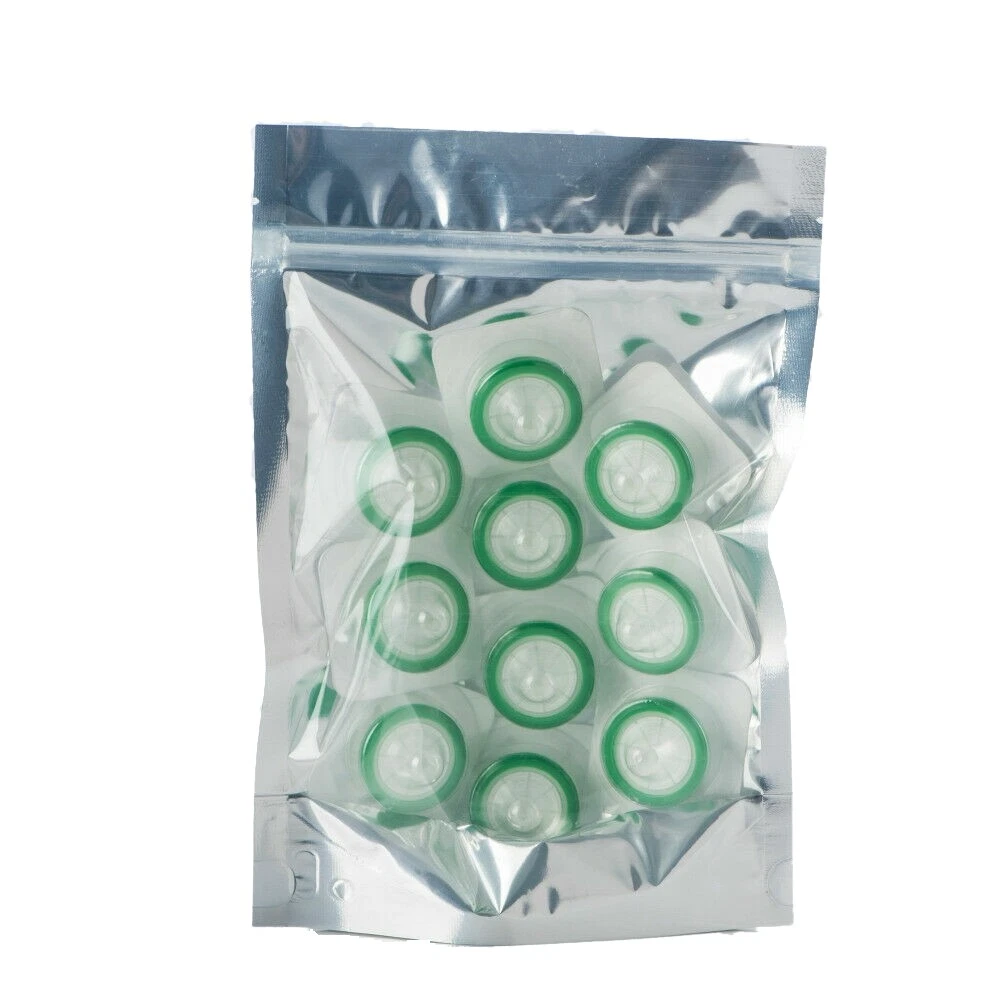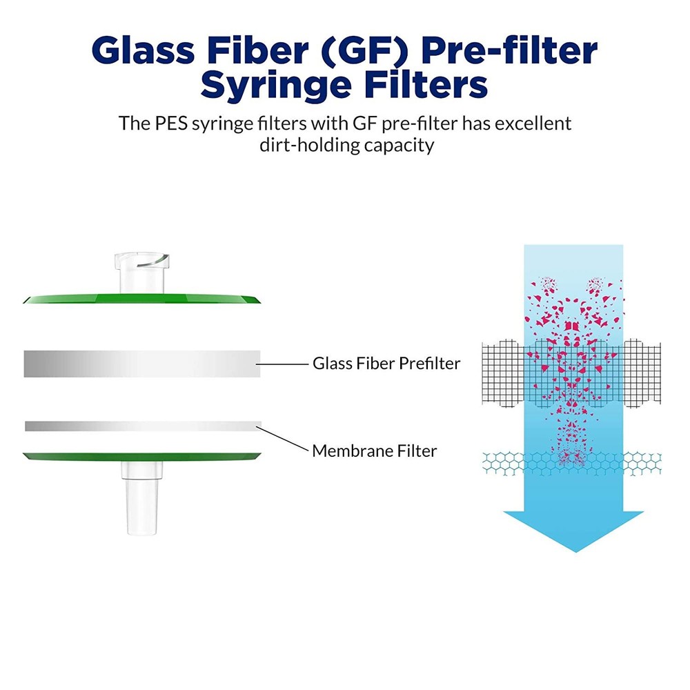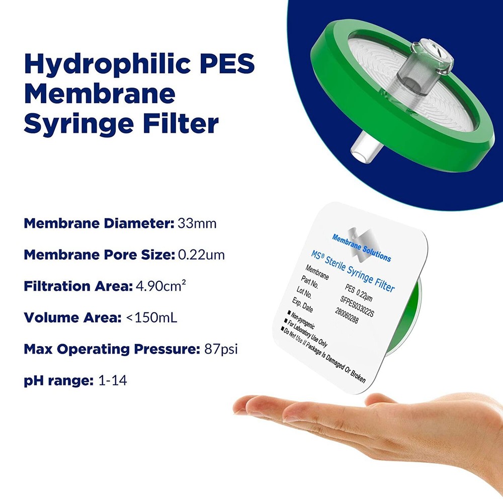 Polyethersulfone (PES) Syringe Filters,0.22μm, 33mm, for Sterile Filtration,Sterile Individually Packed PES (Polyethersulfone)-Most Popular Membrane. PES is hydrophilic and constructed from pure polyethersulfone polymer membrane for maximum sample recovery. Low protein and drug binding characteristics make it ideally suited for use in life sciences applications. Product features • Prefilter syringe filter provides two times greater throughput than standard filter without pre-filtration. • Sterile syringe filter is 100% integrity tested. • Both for mechanical and tensile high level of strength. • Used for most mid-polar liquids and organic solvents. • Low level extractable makes them suitable for environment analysis,proteins and extractables. • High level flow rate because of symmetric structure. Specification Product Type PES Syringe Filters Membrane Polyethersulfone (PES) Housing Material PP Primary Color Green Primary Material Polypropylene Wettability Hydrophilic Pore Size 0.22μm Filter Diameter 33mm Sterile Yes Non-pyrogenic Yes RNase/DNase Free Yes Sample Volume 100mL pH Range 1-14 pH Flow Rate 120-146ml/min (10 psi, 25℃) Sterilization and filtration efficiency LRV>7 Filtration Area 4.9cm2 Hold-up Volume (µL) <110μL Maximum Operating Pressure 87 psi Bacteria-retaining efficiency 99.99999% Inlet Connection Female Luer Lock Outlet Connection Male Luer Slip Application 1 Buffer & Media Application 2 Sterile Filtration Sample Types Aqueous、Solvents and harsh liquids according to chemical compatibility Pack Description Individual Case Quantity 10 Applications: Clarification of protein laden solutions Sterilization of food sciences, life sciences and biopharmaceutical solution Filtration of fluids with high particle loads Processing immunoassay and nucleic acid hybridization samples Polyethersulfone (PES) for serum, plasma and tissue culture Protein based samples in aqueous solutions Mild organic solutions Routine sample preparation Environmental samples Package options: 10pcs Syringe Filters 20pcs Syringe Filters 50pcs Syringe Filters 100pcs Syringe Filters 300pcs Syringe Filters 500pcs Syringe Filters 1000pcs Syringe Filters 2000pcs Syringe Filters How to use a syringe filter? Choose the right type of membrane material based on the properties of your sample. Be careful of the chemical compatibility to avoid extractables and leachables. Read this article about How to choose a syringe filter. 1. Load the sample into the syringe. 2. Attach the filter to the luer-lock of the syringe with a twisting motion. Make sure it is securely attached. 3. Filter the sample. Hold the syringe and filter vertically, and gently press the plunger to push the sample through the filter. Take care not to apply too much force or you may damage the filter. 4. Discard the used filter and repeat for the next sample.