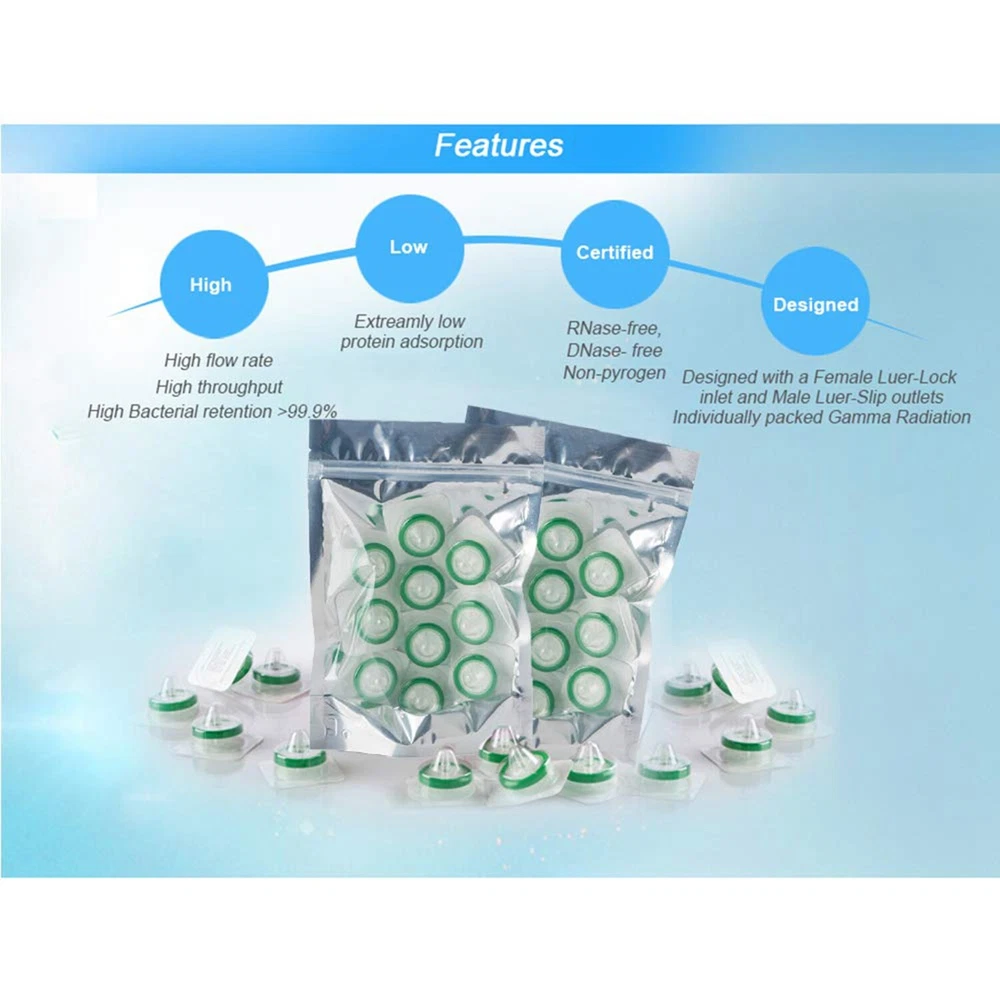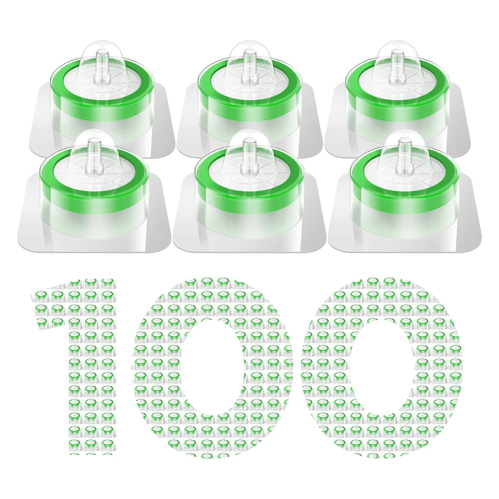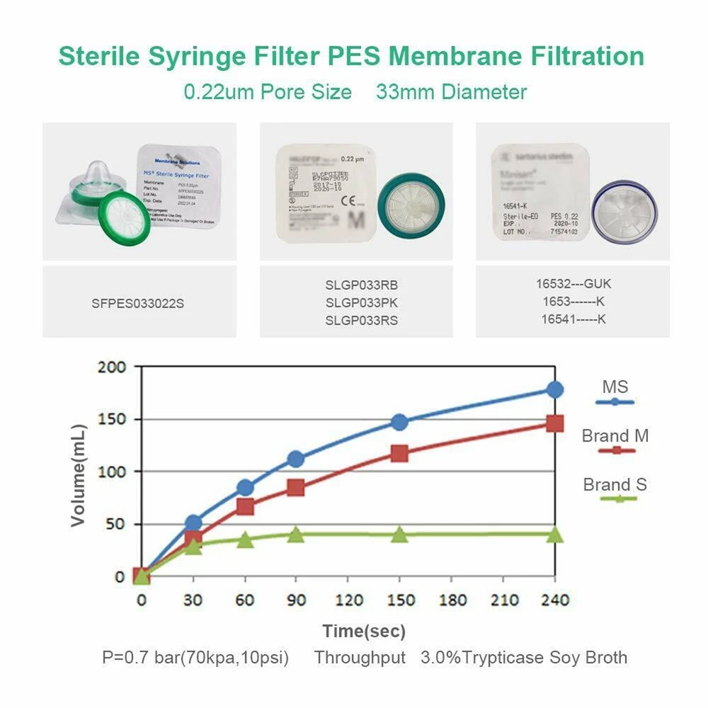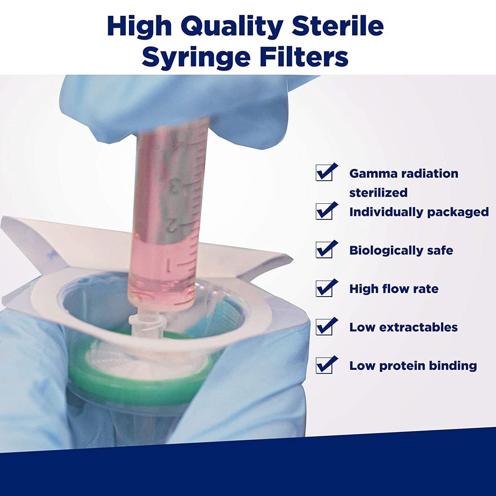 Polyethersulfone (PES) Syringe Filters,0.22μm, 33mm, for Sterile Filtration,Sterile Individually Packed PES (Polyethersulfone)-Most Popular Membrane. PES is hydrophilic and constructed from pure polyethersulfone polymer membrane for maximum sample recovery. Low protein and drug binding characteristics make it ideally suited for use in life sciences applications. Product features • Prefilter syringe filter provides two times greater throughput than standard filter without pre-filtration. • Sterile syringe filter is 100% integrity tested. • Both for mechanical and tensile high level of strength. • Used for most mid-polar liquids and organic solvents. • Low level extractable makes them suitable for environment analysis,proteins and extractables. • High level flow rate because of symmetric structure. Specification Product Type PES Syringe Filters Membrane Polyethersulfone (PES) Housing Material PP Primary Color Green Primary Material Polypropylene Wettability Hydrophilic Pore Size 0.22μm Filter Diameter 33mm Sterile Yes Non-pyrogenic Yes RNase/DNase Free Yes Sample Volume 100mL pH Range 1-14 pH Flow Rate 120-146ml/min (10 psi, 25℃) Sterilization and filtration efficiency LRV>7 Filtration Area 4.9cm2 Hold-up Volume (µL) <110μL Maximum Operating Pressure 87 psi Bacteria-retaining efficiency 99.99999% Inlet Connection Female Luer Lock Outlet Connection Male Luer Slip Application 1 Buffer & Media Application 2 Sterile Filtration Sample Types Aqueous、Solvents and harsh liquids according to chemical compatibility Pack Description Individual Case Quantity 10 Applications: Clarification of protein laden solutions Sterilization of food sciences, life sciences and biopharmaceutical solution Filtration of fluids with high particle loads Processing immunoassay and nucleic acid hybridization samples Polyethersulfone (PES) for serum, plasma and tissue culture Protein based samples in aqueous solutions Mild organic solutions Routine sample preparation Environmental samples Package options: 10pcs Syringe Filters 20pcs Syringe Filters 50pcs Syringe Filters 100pcs Syringe Filters 300pcs Syringe Filters 500pcs Syringe Filters 1000pcs Syringe Filters 2000pcs Syringe Filters How to use a syringe filter? Choose the right type of membrane material based on the properties of your sample. Be careful of the chemical compatibility to avoid extractables and leachables. Read this article about How to choose a syringe filter. 1. Load the sample into the syringe. 2. Attach the filter to the luer-lock of the syringe with a twisting motion. Make sure it is securely attached. 3. Filter the sample. Hold the syringe and filter vertically, and gently press the plunger to push the sample through the filter. Take care not to apply too much force or you may damage the filter. 4. Discard the used filter and repeat for the next sample.