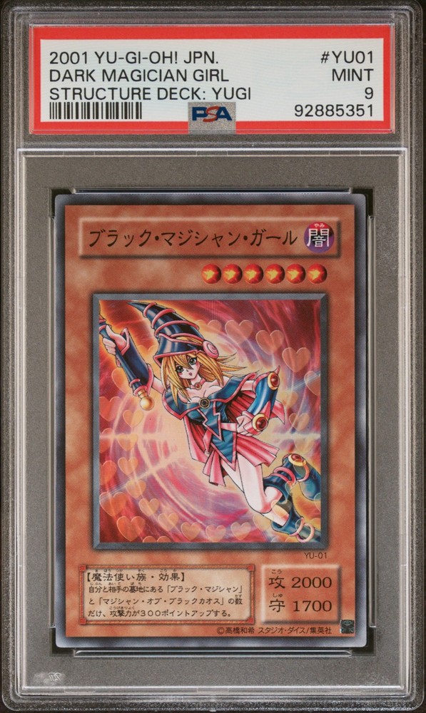 2001 YU-GI-OH! JAPANESE STRUCTURE DECK: YUGI #YU01 DARK MAGICIAN GIRL PSA 9 2001 YU-GI-OH! JAPANESE STRUCTURE DECK: YUGI #YU01 DARK MAGICIAN GIRL PSA 9 Purchase Info Thank you for your interest in this item consigned with PSA! By purchasing or making an offer on this item, you acknowledge and agree to the following terms: All sales are final. Returns not accepted. Payment must be made upon purchase of the item. All items are sold "as is" and without warranty of Collectors Universe, Inc. (d/b/a PSA), and ANY AND ALL IMPLIED WARRANTIES ARE DISCLAIMED AND EXCLUDED. Sales tax may apply depending on shipping address. PSA does not guarantee that another third-party grading company's authentication or certification of an item as genuine is correct or accurate. Neither a difference of opinion between third-party grading companies about authenticity, nor a company's subsequent reversal of its earlier authentication or certification of an item, will be a basis for rescinding a sale. Any dispute with another third-party grading company relating to the authenticity of an item must be resolved directly with that other company. Collectors' maximum liability in the event of loss or damage to an item during shipping will be the lesser of (a) the price paid for the item and (b) the change in fair market value of the item. You release Collectors from all other liability including for any claims of punitive damages, emotional distress, consequential damages, lost profits, or lost interest, except as prohibited by law. Shipping Purchased Items will be shipped directly from PSA Vault. You stay hands-free. PSA Vault When you purchase this item, you can save on sales tax and selling fees by keeping it in the PSA Vault, official Vault of eBay. Items already in PSA Vault and will be sent to PSA Vault will have no shipping charge Storage of any items with the PSA Vault will be subject to the PSA Vault Terms of Service. Consignment PSA has competitive rates on the world's largest collectibles marketplace with the option to list from the PSA Vault or immediately after PSA authentication and grading. Sale Price Under $100 $100 - $499 $500 - $999 $1,000 - $2,499 $2,500 - $4,999 $5,000+ Seller Fee 16% 14% 13% 10% 9% 7% Sellers pay a single fee as reflected above; no additional eBay fees are incurred. There is a $5 minimum fee on sold items.