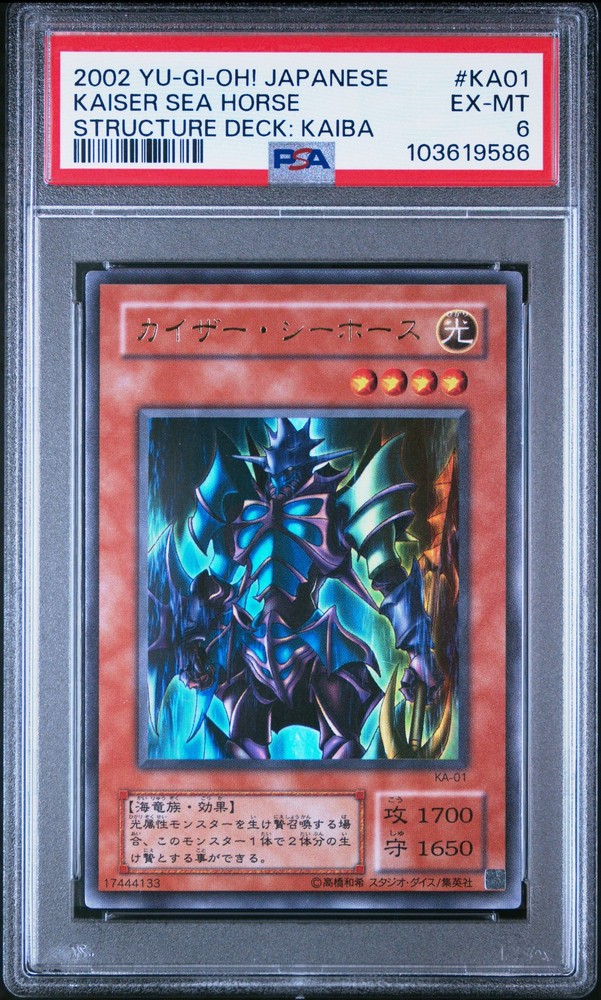 2002 YU-GI-OH! JAPANESE STRUCTURE DECK: KAIBA #KA01 KAISER SEA HORSE PSA 6 2002 YU-GI-OH! JAPANESE STRUCTURE DECK: KAIBA #KA01 KAISER SEA HORSE PSA 6 Purchase Info Thank you for your interest in this item consigned with PSA! By purchasing or making an offer on this item, you acknowledge and agree to the following terms: All sales are final. Returns not accepted. Payment must be made upon purchase of the item. All items are sold "as is" and without warranty of Collectors Universe, Inc. (d/b/a PSA), and ANY AND ALL IMPLIED WARRANTIES ARE DISCLAIMED AND EXCLUDED. Sales tax may apply depending on shipping address. PSA does not guarantee that another third-party grading company's authentication or certification of an item as genuine is correct or accurate. Neither a difference of opinion between third-party grading companies about authenticity, nor a company's subsequent reversal of its earlier authentication or certification of an item, will be a basis for rescinding a sale. Any dispute with another third-party grading company relating to the authenticity of an item must be resolved directly with that other company. Collectors' maximum liability in the event of loss or damage to an item during shipping will be the lesser of (a) the price paid for the item and (b) the change in fair market value of the item. You release Collectors from all other liability including for any claims of punitive damages, emotional distress, consequential damages, lost profits, or lost interest, except as prohibited by law. Shipping Purchased Items will be shipped directly from PSA Vault. You stay hands-free. PSA Vault When you purchase this item, you can save on sales tax and selling fees by keeping it in the PSA Vault, official Vault of eBay. Items already in PSA Vault and will be sent to PSA Vault will have no shipping charge Storage of any items with the PSA Vault will be subject to the PSA Vault Terms of Service. Consignment PSA has competitive rates on the world's largest collectibles marketplace with the option to list from the PSA Vault or immediately after PSA authentication and grading. Sale Price Under $100 $100 - $499 $500 - $999 $1,000 - $2,499 $2,500 - $4,999 $5,000+ Seller Fee 16% 14% 13% 10% 9% 7% Sellers pay a single fee as reflected above; no additional eBay fees are incurred. There is a $5 minimum fee on sold items.