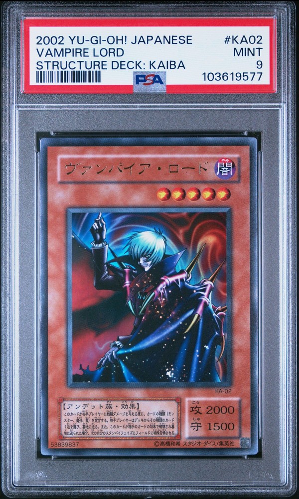 2002 YU-GI-OH! JAPANESE STRUCTURE DECK: KAIBA #KA02 VAMPIRE LORD PSA 9 2002 YU-GI-OH! JAPANESE STRUCTURE DECK: KAIBA #KA02 VAMPIRE LORD PSA 9 Purchase Info Thank you for your interest in this item consigned with PSA! By purchasing or making an offer on this item, you acknowledge and agree to the following terms: All sales are final. Returns not accepted. Payment must be made upon purchase of the item. All items are sold "as is" and without warranty of Collectors Universe, Inc. (d/b/a PSA), and ANY AND ALL IMPLIED WARRANTIES ARE DISCLAIMED AND EXCLUDED. Sales tax may apply depending on shipping address. PSA does not guarantee that another third-party grading company's authentication or certification of an item as genuine is correct or accurate. Neither a difference of opinion between third-party grading companies about authenticity, nor a company's subsequent reversal of its earlier authentication or certification of an item, will be a basis for rescinding a sale. Any dispute with another third-party grading company relating to the authenticity of an item must be resolved directly with that other company. Collectors' maximum liability in the event of loss or damage to an item during shipping will be the lesser of (a) the price paid for the item and (b) the change in fair market value of the item. You release Collectors from all other liability including for any claims of punitive damages, emotional distress, consequential damages, lost profits, or lost interest, except as prohibited by law. Shipping Purchased Items will be shipped directly from PSA Vault. You stay hands-free. PSA Vault When you purchase this item, you can save on sales tax and selling fees by keeping it in the PSA Vault, official Vault of eBay. Items already in PSA Vault and will be sent to PSA Vault will have no shipping charge Storage of any items with the PSA Vault will be subject to the PSA Vault Terms of Service. Consignment PSA has competitive rates on the world's largest collectibles marketplace with the option to list from the PSA Vault or immediately after PSA authentication and grading. Sale Price Under $100 $100 - $499 $500 - $999 $1,000 - $2,499 $2,500 - $4,999 $5,000+ Seller Fee 16% 14% 13% 10% 9% 7% Sellers pay a single fee as reflected above; no additional eBay fees are incurred. There is a $5 minimum fee on sold items.