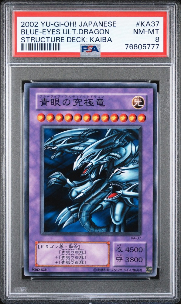 2002 YU-GI-OH! JAPANESE STRUCTURE DECK: KAIBA #KA37 BLUE-EYES ULTIMATE DRAGON PSA 8 2002 YU-GI-OH! JAPANESE STRUCTURE DECK: KAIBA #KA37 BLUE-EYES ULTIMATE DRAGON PSA 8 Purchase Info Thank you for your interest in bidding on this item consigned with PSA! By bidding on this item, you acknowledge and agree to the following terms: All sales are final. Returns not accepted. Payment must be made within 7 days of auction close. All items are sold "as is" and without warranty of Collectors Universe, Inc. (d/b/a PSA), and ANY AND ALL IMPLIED WARRANTIES ARE DISCLAIMED AND EXCLUDED. Sales tax may apply depending on shipping address. PSA does not guarantee that another third-party grading company's authentication or certification of an item as genuine is correct or accurate. Neither a difference of opinion between third-party grading companies about authenticity, nor a company's subsequent reversal of its earlier authentication or certification of an item, will be a basis for rescinding a sale. Any dispute with another third-party grading company relating to the authenticity of an item must be resolved directly with that other company. Collectors' maximum liability in the event of loss or damage to an item during shipping will be the lesser of (a) the price paid for the item and (b) the change in fair market value of the item. You release Collectors from all other liability including for any claims of punitive damages, emotional distress, consequential damages, lost profits, or lost interest, except as prohibited by law. Shipping Purchased Items will be shipped directly from PSA Vault. You stay hands-free. PSA Vault When you purchase this item, you can save on sales tax and selling fees by keeping it in the PSA Vault, official Vault of eBay. Items already in PSA Vault and will be sent to PSA Vault will have no shipping charge Storage of any items with the PSA Vault will be subject to the PSA Vault Terms of Service. Consignment PSA has competitive auction rates on the world's largest collectibles marketplace with the option to list from the PSA Vault or immediately after PSA authentication and grading. Sale Price Under $100 $100 - $499 $500 - $999 $1,000 - $2,499 $2,500 - $4,999 $5,000+ Seller Fee 13% + $3 flat 13% 12% 10% 9% 7% Sellers pay a single fee as reflected above; no additional eBay fees are incurred.