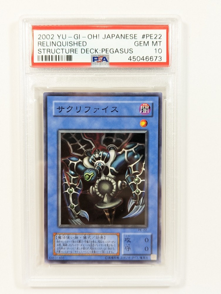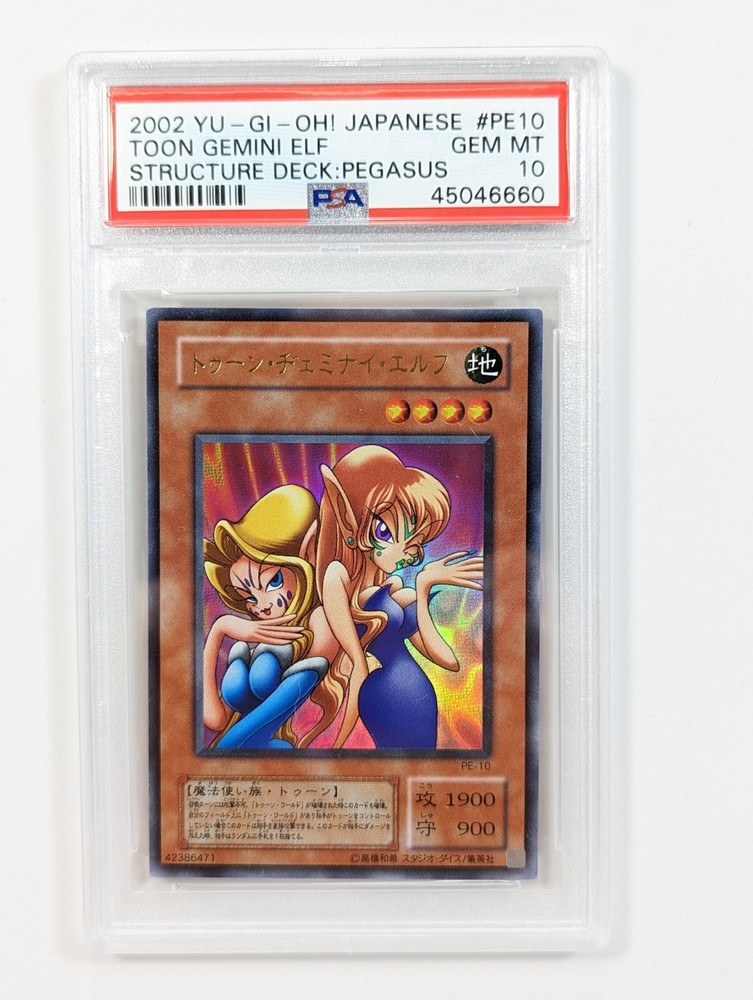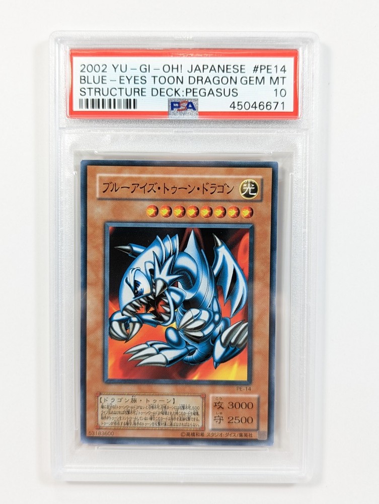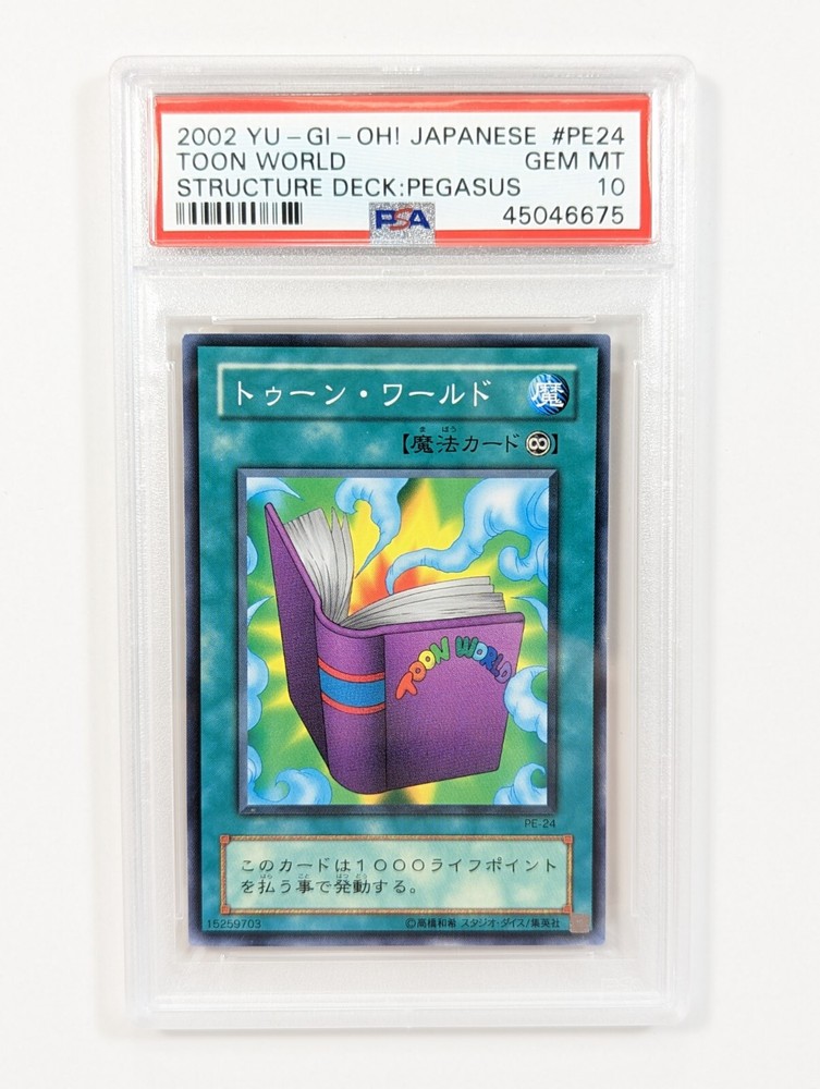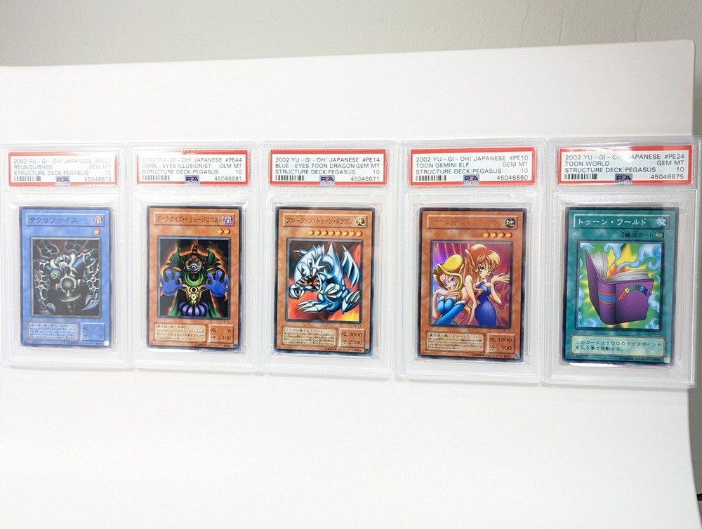 Available for sale is a 5 card set from the 2002 Yu-Gi-Oh Japanese Pegasus Structure Deck. All 5 cards have been professionally graded by PSA to be perfect 10's. The five cards in this set are: Blue Eyes Toon Dragon Toon Gemini Elf Relinquished Toon World Dark Eyes Illusionist Please view all photos carefully. Multiple high quality photos have been taken of this item please use that as the detailed description. If you have any questions or concerns please contact first before committing to purchase or making an offer. The exact item pictured will be the one you receive.
