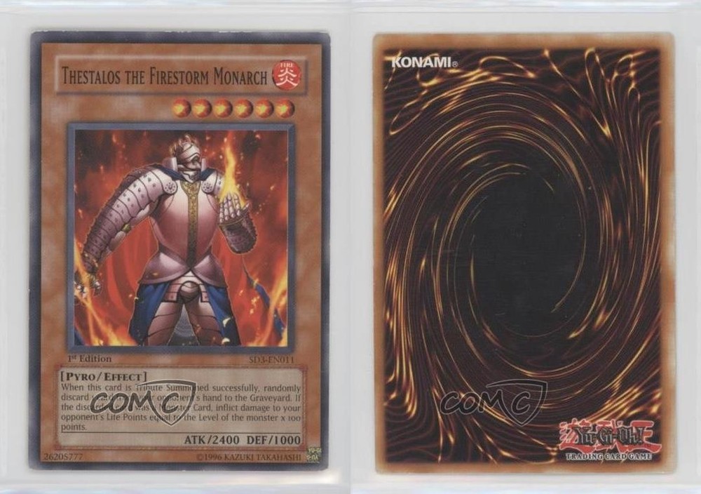 2005 Yu-Gi-Oh! Blaze of Destruction - Structure Deck [Base] - 1st Edition #SD3-EN011 Thestalos the Firestorm Monarch COMC Item: 122872939 - YuGiOh Card Search for more: 2005 Yu-Gi-Oh! Blaze of Destruction Search for more: 2005 Yu-Gi-Oh! Blaze of Destruction - Structure Deck [Base] - 1st Edition View all of our Listings Auctions Buy It Now About Us Located in the beautiful Pacific Northwest, COMC (Check Out My Cards) is the world's largest consignment service for trading card singles. More than 10,000 people have used our consignment service to list over 50 million trading cards. Find out how we can help you consign your items on eBay by contacting us through eBay messaging. COMC -- "The Safe & Easy Way to Buy & Sell" Raw Condition for Modern Cards Unless otherwise noted, raw modern cards are listed in Near Mint-Mint condition or better. A NM-MT card appears to be Mint at first glance, but upon closer inspection, may exhibit some of the following: minor print defects (e.g. roller marks, print line, dimple), minor scratches, slight edge wear, and slight corner wear. Centering is clearly visible in the images provided and does not factor into our condition assessment. Raw Condition for Vintage Cards Unless otherwise noted, raw vintage cards are listed in Excellent condition or better. An EX card may exhibit some of the following: minor rounding of corners, surface wear, print defects, light scratches, and slight edge wear/chipping. Centering is clearly visible in the images provided and does not factor into our condition assessment. Domestic Shipping Combined shipping for multiple items is available. To receive combined shipping, please ensure all desired items are in your eBay shopping cart before proceeding to checkout. eBay limits orders to 40 items per order. We automatically combine multiple orders placed on the same day. If you place multiple orders on the same day, please contact us to request a refund of applicable shipping costs. Signature confirmation may be required on invoices over $400. All cards are protected and shipped securely. International Shipping COMC offers eBay's International Shipping (EIS) for international orders under $2,500* (see country exceptions below). All duties and import fees are paid at checkout; in the rare event that there are additional import fees upon delivery, these are borne by the buyer. EIS packages route through a shipping hub in Erlanger, KY before shipping to their final destination. Please note that EIS does not allow for combined shipments. The shipping rates are determined by eBay and cannot be adjusted. *Maximum sale price exceptions: Colombia, Kuwait ($2,000); Taiwan ($1,539); Chile, Costa Rica, Guatemala, Honduras, Trinidad and Tobago ($1,000); Antigua and Barbuda, Aruba, Belize, Dominica, Grenada, Philippines, Saint Kitts and Nevis, Saint Lucia, Montserrat, Turks and Caicos Islands ($500); Dominican Republic, El Salvador ($200). Please request a shipping quote through eBay messaging for orders that exceed the maximum sale price supported by eBay's International Shipping. You will be responsible for all duties and import fees for international orders shipped outside the EIS. All cards are protected and shipped securely. Payment COMC does not accept offers on our cards through our eBay storefront. COMC utilizes eBay’s managed payments system. If you are experiencing difficulties making a payment, please contact eBay for assistance. Return Policy Returns are only accepted on the rare occasion the item is not as described. If you are making a return, please initiate the return process through eBay so a mailing label can be provided for you. Prior to listing, our expert team carefully assessed this item to represent it accurately. Please review the description and high-definition images prior to purchasing to ensure this item meets your satisfaction. We welcome you to contact us if you have further questions about this item. Trust and Integrity COMC carefully assesses each item consigned to us to prevent fraudulent items from entering the marketplace. If you believe an item offered on COMC may be fraudulent, please contact us with details so we can investigate the issue. Items we determine are outside our supported items policy may be removed. Last Modified: 7/18/2025 7:03:33 PM PDT