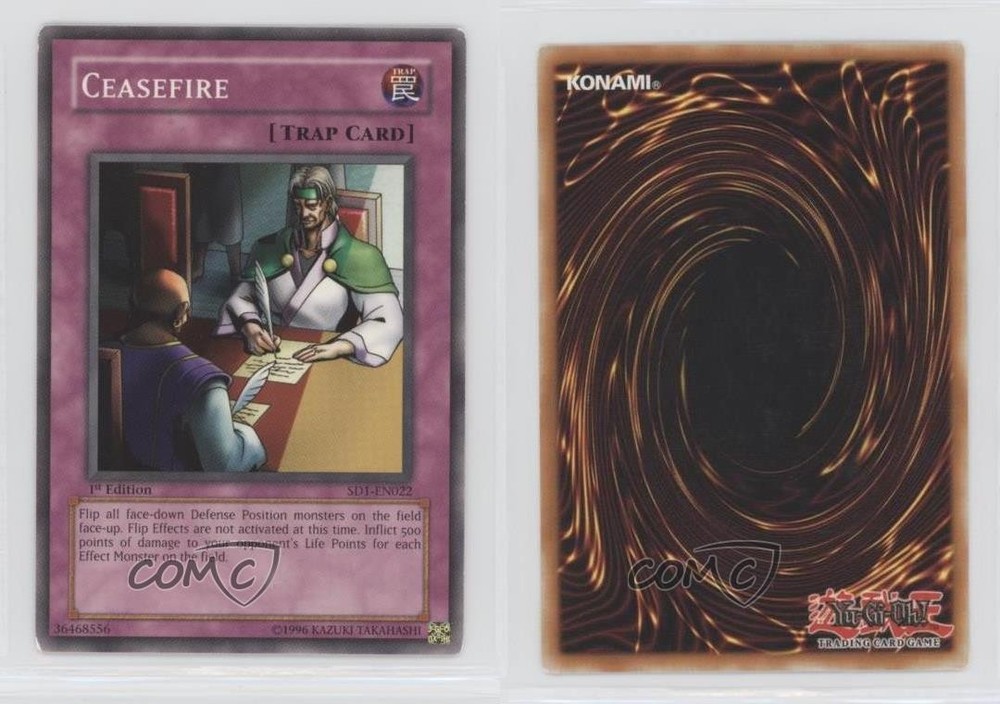 2005 Yu-Gi-Oh! Dragon's Roar - Structure Deck [Base] - 1st Edition #SD1-EN022 Ceasefire COMC Item: 152109131 - YuGiOh Card - Featuring Ceasefire Search for more: 2005 Yu-Gi-Oh! Dragon's Roar Search for more: 2005 Yu-Gi-Oh! Dragon's Roar - Structure Deck [Base] - 1st Edition View all of our Listings Auctions Buy It Now About Us Located in the beautiful Pacific Northwest, COMC (Check Out My Cards) is the world's largest consignment service for trading card singles. More than 10,000 people have used our consignment service to list over 50 million trading cards. Find out how we can help you consign your items on eBay by contacting us through eBay messaging. COMC -- "The Safe & Easy Way to Buy & Sell" Raw Condition for Modern Cards Unless otherwise noted, raw modern cards are listed in Near Mint-Mint condition or better. A NM-MT card appears to be Mint at first glance, but upon closer inspection, may exhibit some of the following: minor print defects (e.g. roller marks, print line, dimple), minor scratches, slight edge wear, and slight corner wear. Centering is clearly visible in the images provided and does not factor into our condition assessment. Raw Condition for Vintage Cards Unless otherwise noted, raw vintage cards are listed in Excellent condition or better. An EX card may exhibit some of the following: minor rounding of corners, surface wear, print defects, light scratches, and slight edge wear/chipping. Centering is clearly visible in the images provided and does not factor into our condition assessment. Domestic Shipping Combined shipping for multiple items is available. To receive combined shipping, please ensure all desired items are in your eBay shopping cart before proceeding to checkout. eBay limits orders to 40 items per order. We automatically combine multiple orders placed on the same day. If you place multiple orders on the same day, please contact us to request a refund of applicable shipping costs. Signature confirmation may be required on invoices over $400. All cards are protected and shipped securely. International Shipping COMC offers eBay's International Shipping (EIS) for international orders under $2,500* (see country exceptions below). All duties and import fees are paid at checkout; in the rare event that there are additional import fees upon delivery, these are borne by the buyer. EIS packages route through a shipping hub in Erlanger, KY before shipping to their final destination. Please note that EIS does not allow for combined shipments. The shipping rates are determined by eBay and cannot be adjusted. *Maximum sale price exceptions: Colombia, Kuwait ($2,000); Taiwan ($1,539); Chile, Costa Rica, Guatemala, Honduras, Trinidad and Tobago ($1,000); Antigua and Barbuda, Aruba, Belize, Dominica, Grenada, Philippines, Saint Kitts and Nevis, Saint Lucia, Montserrat, Turks and Caicos Islands ($500); Dominican Republic, El Salvador ($200). Please request a shipping quote through eBay messaging for orders that exceed the maximum sale price supported by eBay's International Shipping. You will be responsible for all duties and import fees for international orders shipped outside the EIS. All cards are protected and shipped securely. Payment COMC does not accept offers on our cards through our eBay storefront. COMC utilizes eBay’s managed payments system. If you are experiencing difficulties making a payment, please contact eBay for assistance. Return Policy Returns are only accepted on the rare occasion the item is not as described. If you are making a return, please initiate the return process through eBay so a mailing label can be provided for you. Prior to listing, our expert team carefully assessed this item to represent it accurately. Please review the description and high-definition images prior to purchasing to ensure this item meets your satisfaction. We welcome you to contact us if you have further questions about this item. Trust and Integrity COMC carefully assesses each item consigned to us to prevent fraudulent items from entering the marketplace. If you believe an item offered on COMC may be fraudulent, please contact us with details so we can investigate the issue. Items we determine are outside our supported items policy may be removed. Last Modified: 6/6/2025 7:51:11 PM PDT