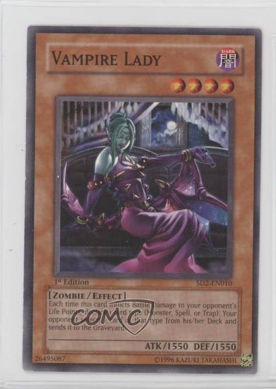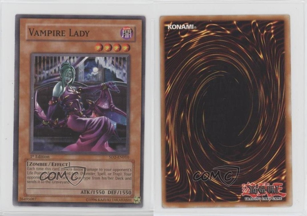 2005 Yu-Gi-Oh! Zombie Madness - Structure Deck [Base] - 1st Edition #SD2-EN010 Vampire Lady COMC Item: 192788296 - YuGiOh Card - Featuring Vampire Lady Search for more: 2005 Yu-Gi-Oh! Zombie Madness Search for more: 2005 Yu-Gi-Oh! Zombie Madness - Structure Deck [Base] - 1st Edition View all of our Listings Auctions Buy It Now About Us Located in the beautiful Pacific Northwest, COMC (Check Out My Cards) is the world's largest consignment service for trading card singles. More than 10,000 people have used our consignment service to list over 50 million trading cards. Find out how we can help you consign your items on eBay by contacting us through eBay messaging. COMC -- "The Safe & Easy Way to Buy & Sell" Raw Condition for Modern Cards Unless otherwise noted, raw modern cards are listed in Near Mint-Mint condition or better. A NM-MT card appears to be Mint at first glance, but upon closer inspection, may exhibit some of the following: minor print defects (e.g. roller marks, print line, dimple), minor scratches, slight edge wear, and slight corner wear. Centering is clearly visible in the images provided and does not factor into our condition assessment. Raw Condition for Vintage Cards Unless otherwise noted, raw vintage cards are listed in Excellent condition or better. An EX card may exhibit some of the following: minor rounding of corners, surface wear, print defects, light scratches, and slight edge wear/chipping. Centering is clearly visible in the images provided and does not factor into our condition assessment. Domestic Shipping Combined shipping for multiple items is available. To receive combined shipping, please ensure all desired items are in your eBay shopping cart before proceeding to checkout. eBay limits orders to 40 items per order. We automatically combine multiple orders placed on the same day. If you place multiple orders on the same day, please contact us to request a refund of applicable shipping costs. Signature confirmation may be required on invoices over $400. All cards are protected and shipped securely. International Shipping COMC offers eBay's International Shipping (EIS) for international orders under $2,500* (see country exceptions below). All duties and import fees are paid at checkout; in the rare event that there are additional import fees upon delivery, these are borne by the buyer. EIS packages route through a shipping hub in Erlanger, KY before shipping to their final destination. Please note that EIS does not allow for combined shipments. The shipping rates are determined by eBay and cannot be adjusted. *Maximum sale price exceptions: Colombia, Kuwait ($2,000); Taiwan ($1,539); Chile, Costa Rica, Guatemala, Honduras, Trinidad and Tobago ($1,000); Antigua and Barbuda, Aruba, Belize, Dominica, Grenada, Philippines, Saint Kitts and Nevis, Saint Lucia, Montserrat, Turks and Caicos Islands ($500); Dominican Republic, El Salvador ($200). Please request a shipping quote through eBay messaging for orders that exceed the maximum sale price supported by eBay's International Shipping. You will be responsible for all duties and import fees for international orders shipped outside the EIS. All cards are protected and shipped securely. Payment COMC does not accept offers on our cards through our eBay storefront. COMC utilizes eBay’s managed payments system. If you are experiencing difficulties making a payment, please contact eBay for assistance. Return Policy Returns are only accepted on the rare occasion the item is not as described. If you are making a return, please initiate the return process through eBay so a mailing label can be provided for you. Prior to listing, our expert team carefully assessed this item to represent it accurately. Please review the description and high-definition images prior to purchasing to ensure this item meets your satisfaction. We welcome you to contact us if you have further questions about this item. Trust and Integrity COMC carefully assesses each item consigned to us to prevent fraudulent items from entering the marketplace. If you believe an item offered on COMC may be fraudulent, please contact us with details so we can investigate the issue. Items we determine are outside our supported items policy may be removed. Last Modified: 6/26/2025 6:52:38 PM PDT