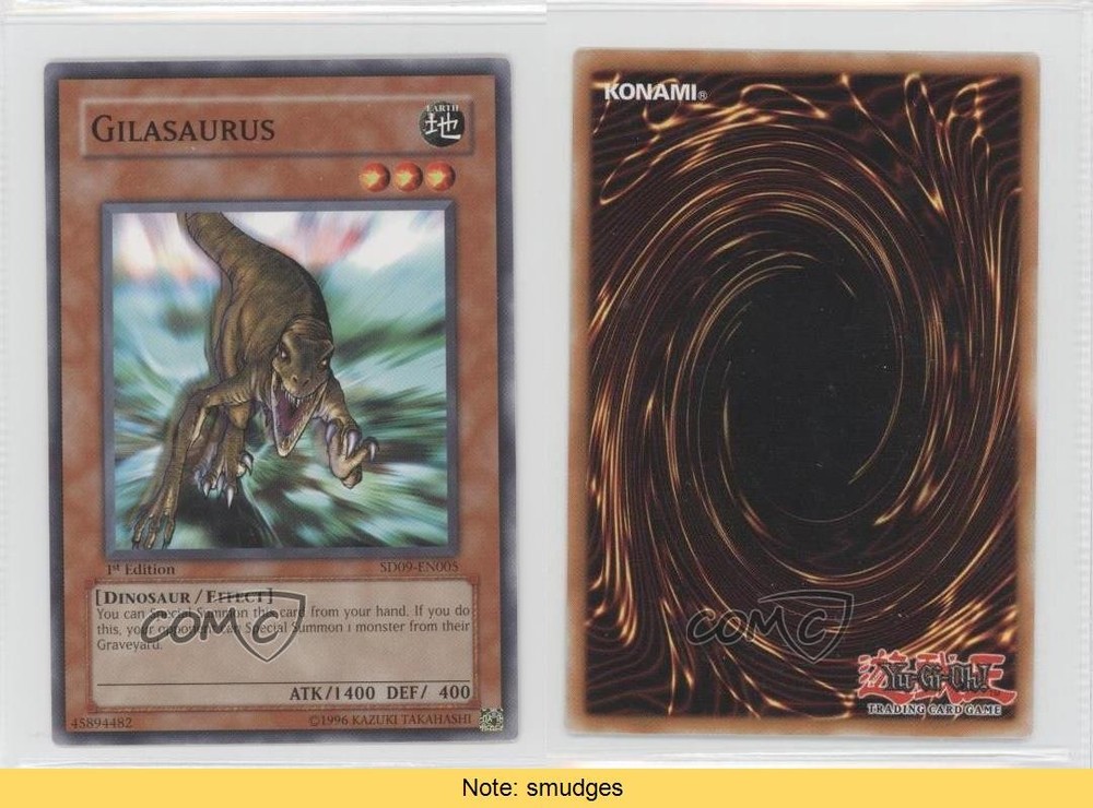 2006 Yu-Gi-Oh! Dinosaur's Rage - Structure Deck [Base] - 1st Edition #SD09-EN005 Gilasaurus COMC Item: 25707544 CONDITION NOTE: smudges - YuGiOh Card - Featuring Gilasaurus Search for more: 2006 Yu-Gi-Oh! Dinosaur's Rage Search for more: 2006 Yu-Gi-Oh! Dinosaur's Rage - Structure Deck [Base] - 1st Edition View all of our Listings Auctions Buy It Now About Us Located in the beautiful Pacific Northwest, COMC (Check Out My Cards) is the world's largest consignment service for trading card singles. More than 10,000 people have used our consignment service to list over 50 million trading cards. Find out how we can help you consign your items on eBay by contacting us through eBay messaging. COMC -- "The Safe & Easy Way to Buy & Sell" Raw Condition for Modern Cards Unless otherwise noted, raw modern cards are listed in Near Mint-Mint condition or better. A NM-MT card appears to be Mint at first glance, but upon closer inspection, may exhibit some of the following: minor print defects (e.g. roller marks, print line, dimple), minor scratches, slight edge wear, and slight corner wear. Centering is clearly visible in the images provided and does not factor into our condition assessment. Raw Condition for Vintage Cards Unless otherwise noted, raw vintage cards are listed in Excellent condition or better. An EX card may exhibit some of the following: minor rounding of corners, surface wear, print defects, light scratches, and slight edge wear/chipping. Centering is clearly visible in the images provided and does not factor into our condition assessment. Domestic Shipping Combined shipping for multiple items is available. To receive combined shipping, please ensure all desired items are in your eBay shopping cart before proceeding to checkout. eBay limits orders to 40 items per order. We automatically combine multiple orders placed on the same day. If you place multiple orders on the same day, please contact us to request a refund of applicable shipping costs. Signature confirmation may be required on invoices over $400. All cards are protected and shipped securely. International Shipping COMC offers eBay's International Shipping (EIS) for international orders under $2,500* (see country exceptions below). All duties and import fees are paid at checkout; in the rare event that there are additional import fees upon delivery, these are borne by the buyer. EIS packages route through a shipping hub in Erlanger, KY before shipping to their final destination. Please note that EIS does not allow for combined shipments. The shipping rates are determined by eBay and cannot be adjusted. *Maximum sale price exceptions: Colombia, Kuwait ($2,000); Taiwan ($1,539); Chile, Costa Rica, Guatemala, Honduras, Trinidad and Tobago ($1,000); Antigua and Barbuda, Aruba, Belize, Dominica, Grenada, Philippines, Saint Kitts and Nevis, Saint Lucia, Montserrat, Turks and Caicos Islands ($500); Dominican Republic, El Salvador ($200). Please request a shipping quote through eBay messaging for orders that exceed the maximum sale price supported by eBay's International Shipping. You will be responsible for all duties and import fees for international orders shipped outside the EIS. All cards are protected and shipped securely. Payment COMC does not accept offers on our cards through our eBay storefront. COMC utilizes eBay’s managed payments system. If you are experiencing difficulties making a payment, please contact eBay for assistance. Return Policy Returns are only accepted on the rare occasion the item is not as described. If you are making a return, please initiate the return process through eBay so a mailing label can be provided for you. Prior to listing, our expert team carefully assessed this item to represent it accurately. Please review the description and high-definition images prior to purchasing to ensure this item meets your satisfaction. We welcome you to contact us if you have further questions about this item. Trust and Integrity COMC carefully assesses each item consigned to us to prevent fraudulent items from entering the marketplace. If you believe an item offered on COMC may be fraudulent, please contact us with details so we can investigate the issue. Items we determine are outside our supported items policy may be removed. Last Modified: 6/14/2025 8:39:33 PM PDT