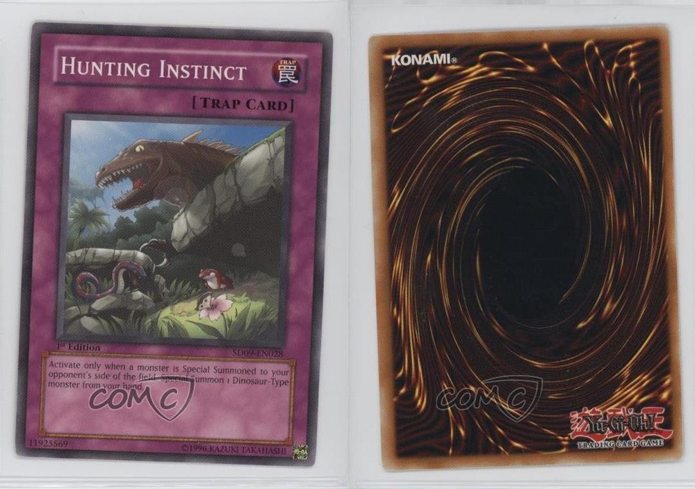 2006 Yu-Gi-Oh! Dinosaur's Rage - Structure Deck [Base] - 1st Edition #SD09-EN028 Hunting Instinct COMC Item: 209222623 - YuGiOh Card - Featuring Hunting Instinct Search for more: 2006 Yu-Gi-Oh! Dinosaur's Rage Search for more: 2006 Yu-Gi-Oh! Dinosaur's Rage - Structure Deck [Base] - 1st Edition View all of our Listings Auctions Buy It Now About Us Located in the beautiful Pacific Northwest, COMC (Check Out My Cards) is the world's largest consignment service for trading card singles. More than 10,000 people have used our consignment service to list over 50 million trading cards. Find out how we can help you consign your items on eBay by contacting us through eBay messaging. COMC -- "The Safe & Easy Way to Buy & Sell" Raw Condition for Modern Cards Unless otherwise noted, raw modern cards are listed in Near Mint-Mint condition or better. A NM-MT card appears to be Mint at first glance, but upon closer inspection, may exhibit some of the following: minor print defects (e.g. roller marks, print line, dimple), minor scratches, slight edge wear, and slight corner wear. Centering is clearly visible in the images provided and does not factor into our condition assessment. Raw Condition for Vintage Cards Unless otherwise noted, raw vintage cards are listed in Excellent condition or better. An EX card may exhibit some of the following: minor rounding of corners, surface wear, print defects, light scratches, and slight edge wear/chipping. Centering is clearly visible in the images provided and does not factor into our condition assessment. Domestic Shipping Combined shipping for multiple items is available. To receive combined shipping, please ensure all desired items are in your eBay shopping cart before proceeding to checkout. eBay limits orders to 40 items per order. We automatically combine multiple orders placed on the same day. If you place multiple orders on the same day, please contact us to request a refund of applicable shipping costs. Signature confirmation may be required on invoices over $400. All cards are protected and shipped securely. International Shipping COMC offers eBay's International Shipping (EIS) for international orders under $2,500* (see country exceptions below). All duties and import fees are paid at checkout; in the rare event that there are additional import fees upon delivery, these are borne by the buyer. EIS packages route through a shipping hub in Erlanger, KY before shipping to their final destination. Please note that EIS does not allow for combined shipments. The shipping rates are determined by eBay and cannot be adjusted. *Maximum sale price exceptions: Colombia, Kuwait ($2,000); Taiwan ($1,539); Chile, Costa Rica, Guatemala, Honduras, Trinidad and Tobago ($1,000); Antigua and Barbuda, Aruba, Belize, Dominica, Grenada, Philippines, Saint Kitts and Nevis, Saint Lucia, Montserrat, Turks and Caicos Islands ($500); Dominican Republic, El Salvador ($200). Please request a shipping quote through eBay messaging for orders that exceed the maximum sale price supported by eBay's International Shipping. You will be responsible for all duties and import fees for international orders shipped outside the EIS. All cards are protected and shipped securely. Payment COMC does not accept offers on our cards through our eBay storefront. COMC utilizes eBay’s managed payments system. If you are experiencing difficulties making a payment, please contact eBay for assistance. Return Policy Returns are only accepted on the rare occasion the item is not as described. If you are making a return, please initiate the return process through eBay so a mailing label can be provided for you. Prior to listing, our expert team carefully assessed this item to represent it accurately. Please review the description and high-definition images prior to purchasing to ensure this item meets your satisfaction. We welcome you to contact us if you have further questions about this item. Trust and Integrity COMC carefully assesses each item consigned to us to prevent fraudulent items from entering the marketplace. If you believe an item offered on COMC may be fraudulent, please contact us with details so we can investigate the issue. Items we determine are outside our supported items policy may be removed. Last Modified: 6/14/2025 8:48:23 PM PDT