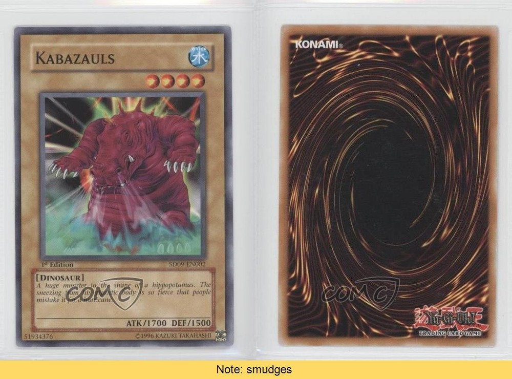 2006 Yu-Gi-Oh! Dinosaur's Rage - Structure Deck [Base] - 1st Edition #SD09-EN002 Kabazauls COMC Item: 25707529 CONDITION NOTE: smudges - YuGiOh Card - Featuring Kabazauls Search for more: 2006 Yu-Gi-Oh! Dinosaur's Rage Search for more: 2006 Yu-Gi-Oh! Dinosaur's Rage - Structure Deck [Base] - 1st Edition View all of our Listings Auctions Buy It Now About Us Located in the beautiful Pacific Northwest, COMC (Check Out My Cards) is the world's largest consignment service for trading card singles. More than 10,000 people have used our consignment service to list over 50 million trading cards. Find out how we can help you consign your items on eBay by contacting us through eBay messaging. COMC -- "The Safe & Easy Way to Buy & Sell" Raw Condition for Modern Cards Unless otherwise noted, raw modern cards are listed in Near Mint-Mint condition or better. A NM-MT card appears to be Mint at first glance, but upon closer inspection, may exhibit some of the following: minor print defects (e.g. roller marks, print line, dimple), minor scratches, slight edge wear, and slight corner wear. Centering is clearly visible in the images provided and does not factor into our condition assessment. Raw Condition for Vintage Cards Unless otherwise noted, raw vintage cards are listed in Excellent condition or better. An EX card may exhibit some of the following: minor rounding of corners, surface wear, print defects, light scratches, and slight edge wear/chipping. Centering is clearly visible in the images provided and does not factor into our condition assessment. Domestic Shipping Combined shipping for multiple items is available. To receive combined shipping, please ensure all desired items are in your eBay shopping cart before proceeding to checkout. eBay limits orders to 40 items per order. We automatically combine multiple orders placed on the same day. If you place multiple orders on the same day, please contact us to request a refund of applicable shipping costs. Signature confirmation may be required on invoices over $400. All cards are protected and shipped securely. International Shipping COMC offers eBay's International Shipping (EIS) for international orders under $2,500* (see country exceptions below). All duties and import fees are paid at checkout; in the rare event that there are additional import fees upon delivery, these are borne by the buyer. EIS packages route through a shipping hub in Erlanger, KY before shipping to their final destination. Please note that EIS does not allow for combined shipments. The shipping rates are determined by eBay and cannot be adjusted. *Maximum sale price exceptions: Colombia, Kuwait ($2,000); Taiwan ($1,539); Chile, Costa Rica, Guatemala, Honduras, Trinidad and Tobago ($1,000); Antigua and Barbuda, Aruba, Belize, Dominica, Grenada, Philippines, Saint Kitts and Nevis, Saint Lucia, Montserrat, Turks and Caicos Islands ($500); Dominican Republic, El Salvador ($200). Please request a shipping quote through eBay messaging for orders that exceed the maximum sale price supported by eBay's International Shipping. You will be responsible for all duties and import fees for international orders shipped outside the EIS. All cards are protected and shipped securely. Payment COMC does not accept offers on our cards through our eBay storefront. COMC utilizes eBay’s managed payments system. If you are experiencing difficulties making a payment, please contact eBay for assistance. Return Policy Returns are only accepted on the rare occasion the item is not as described. If you are making a return, please initiate the return process through eBay so a mailing label can be provided for you. Prior to listing, our expert team carefully assessed this item to represent it accurately. Please review the description and high-definition images prior to purchasing to ensure this item meets your satisfaction. We welcome you to contact us if you have further questions about this item. Trust and Integrity COMC carefully assesses each item consigned to us to prevent fraudulent items from entering the marketplace. If you believe an item offered on COMC may be fraudulent, please contact us with details so we can investigate the issue. Items we determine are outside our supported items policy may be removed. Last Modified: 6/12/2025 4:14:40 AM PDT