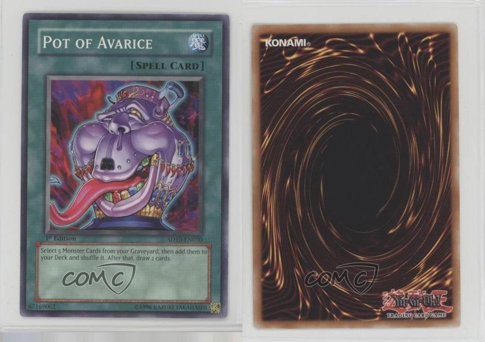 2007 Yu-Gi-Oh! Machine Re-Volt - Structure Deck [Base] - 1st Edition #SD10-EN030 Pot of Avarice COMC Item: 195581610 - YuGiOh Card - Featuring Pot of Avarice Search for more: 2007 Yu-Gi-Oh! Machine Re-Volt Search for more: 2007 Yu-Gi-Oh! Machine Re-Volt - Structure Deck [Base] - 1st Edition View all of our Listings Auctions Buy It Now About Us Located in the beautiful Pacific Northwest, COMC (Check Out My Cards) is the world's largest consignment service for trading card singles. More than 10,000 people have used our consignment service to list over 50 million trading cards. Find out how we can help you consign your items on eBay by contacting us through eBay messaging. COMC -- "The Safe & Easy Way to Buy & Sell" Raw Condition for Modern Cards Unless otherwise noted, raw modern cards are listed in Near Mint-Mint condition or better. A NM-MT card appears to be Mint at first glance, but upon closer inspection, may exhibit some of the following: minor print defects (e.g. roller marks, print line, dimple), minor scratches, slight edge wear, and slight corner wear. Centering is clearly visible in the images provided and does not factor into our condition assessment. Raw Condition for Vintage Cards Unless otherwise noted, raw vintage cards are listed in Excellent condition or better. An EX card may exhibit some of the following: minor rounding of corners, surface wear, print defects, light scratches, and slight edge wear/chipping. Centering is clearly visible in the images provided and does not factor into our condition assessment. Domestic Shipping Combined shipping for multiple items is available. To receive combined shipping, please ensure all desired items are in your eBay shopping cart before proceeding to checkout. eBay limits orders to 40 items per order. We automatically combine multiple orders placed on the same day. If you place multiple orders on the same day, please contact us to request a refund of applicable shipping costs. Signature confirmation may be required on invoices over $400. All cards are protected and shipped securely. International Shipping COMC offers eBay's International Shipping (EIS) for international orders under $2,500* (see country exceptions below). All duties and import fees are paid at checkout; in the rare event that there are additional import fees upon delivery, these are borne by the buyer. EIS packages route through a shipping hub in Erlanger, KY before shipping to their final destination. Please note that EIS does not allow for combined shipments. The shipping rates are determined by eBay and cannot be adjusted. *Maximum sale price exceptions: Colombia, Kuwait ($2,000); Taiwan ($1,539); Chile, Costa Rica, Guatemala, Honduras, Trinidad and Tobago ($1,000); Antigua and Barbuda, Aruba, Belize, Dominica, Grenada, Philippines, Saint Kitts and Nevis, Saint Lucia, Montserrat, Turks and Caicos Islands ($500); Dominican Republic, El Salvador ($200). Please request a shipping quote through eBay messaging for orders that exceed the maximum sale price supported by eBay's International Shipping. You will be responsible for all duties and import fees for international orders shipped outside the EIS. All cards are protected and shipped securely. Payment COMC does not accept offers on our cards through our eBay storefront. COMC utilizes eBay’s managed payments system. If you are experiencing difficulties making a payment, please contact eBay for assistance. Return Policy Returns are only accepted on the rare occasion the item is not as described. If you are making a return, please initiate the return process through eBay so a mailing label can be provided for you. Prior to listing, our expert team carefully assessed this item to represent it accurately. Please review the description and high-definition images prior to purchasing to ensure this item meets your satisfaction. We welcome you to contact us if you have further questions about this item. Trust and Integrity COMC carefully assesses each item consigned to us to prevent fraudulent items from entering the marketplace. If you believe an item offered on COMC may be fraudulent, please contact us with details so we can investigate the issue. Items we determine are outside our supported items policy may be removed. Last Modified: 7/15/2025 12:47:43 AM PDT