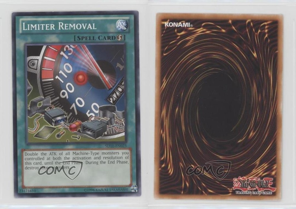 2007 Yu-Gi-Oh! Machine Re-Volt - Structure Deck [Base] - Unlimited #SD10-EN025 Limiter Removal COMC Item: 143690116 - YuGiOh Card - Featuring Limiter Removal Search for more: 2007 Yu-Gi-Oh! Machine Re-Volt Search for more: 2007 Yu-Gi-Oh! Machine Re-Volt - Structure Deck [Base] - Unlimited View all of our Listings Auctions Buy It Now About Us Located in the beautiful Pacific Northwest, COMC (Check Out My Cards) is the world's largest consignment service for trading card singles. More than 10,000 people have used our consignment service to list over 50 million trading cards. Find out how we can help you consign your items on eBay by contacting us through eBay messaging. COMC -- "The Safe & Easy Way to Buy & Sell" Raw Condition for Modern Cards Unless otherwise noted, raw modern cards are listed in Near Mint-Mint condition or better. A NM-MT card appears to be Mint at first glance, but upon closer inspection, may exhibit some of the following: minor print defects (e.g. roller marks, print line, dimple), minor scratches, slight edge wear, and slight corner wear. Centering is clearly visible in the images provided and does not factor into our condition assessment. Raw Condition for Vintage Cards Unless otherwise noted, raw vintage cards are listed in Excellent condition or better. An EX card may exhibit some of the following: minor rounding of corners, surface wear, print defects, light scratches, and slight edge wear/chipping. Centering is clearly visible in the images provided and does not factor into our condition assessment. Domestic Shipping Combined shipping for multiple items is available. To receive combined shipping, please ensure all desired items are in your eBay shopping cart before proceeding to checkout. eBay limits orders to 40 items per order. We automatically combine multiple orders placed on the same day. If you place multiple orders on the same day, please contact us to request a refund of applicable shipping costs. Signature confirmation may be required on invoices over $400. All cards are protected and shipped securely. International Shipping COMC offers eBay's International Shipping (EIS) for international orders under $2,500* (see country exceptions below). All duties and import fees are paid at checkout; in the rare event that there are additional import fees upon delivery, these are borne by the buyer. EIS packages route through a shipping hub in Erlanger, KY before shipping to their final destination. Please note that EIS does not allow for combined shipments. The shipping rates are determined by eBay and cannot be adjusted. *Maximum sale price exceptions: Colombia, Kuwait ($2,000); Taiwan ($1,539); Chile, Costa Rica, Guatemala, Honduras, Trinidad and Tobago ($1,000); Antigua and Barbuda, Aruba, Belize, Dominica, Grenada, Philippines, Saint Kitts and Nevis, Saint Lucia, Montserrat, Turks and Caicos Islands ($500); Dominican Republic, El Salvador ($200). Please request a shipping quote through eBay messaging for orders that exceed the maximum sale price supported by eBay's International Shipping. You will be responsible for all duties and import fees for international orders shipped outside the EIS. All cards are protected and shipped securely. Payment COMC does not accept offers on our cards through our eBay storefront. COMC utilizes eBay’s managed payments system. If you are experiencing difficulties making a payment, please contact eBay for assistance. Return Policy Returns are only accepted on the rare occasion the item is not as described. If you are making a return, please initiate the return process through eBay so a mailing label can be provided for you. Prior to listing, our expert team carefully assessed this item to represent it accurately. Please review the description and high-definition images prior to purchasing to ensure this item meets your satisfaction. We welcome you to contact us if you have further questions about this item. Trust and Integrity COMC carefully assesses each item consigned to us to prevent fraudulent items from entering the marketplace. If you believe an item offered on COMC may be fraudulent, please contact us with details so we can investigate the issue. Items we determine are outside our supported items policy may be removed. Last Modified: 6/13/2025 9:35:59 PM PDT