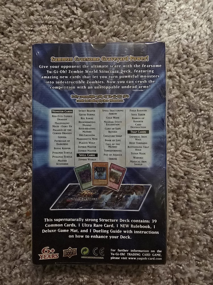 For sale is a factory-sealed and 1st Edition copy of the Yu-Gi-Oh! 5D’s Zombie World Structure Deck. This deck is perfect for collectors and duelists, featuring iconic zombie-type cards like Red-Eyes Zombie Dragon, Plague Wolf, Zombie World, and more. This structure deck allows players to transform all monsters on the field into Zombies—opening up powerful synergy plays and lockdown strategies. Includes a mix of common, rare, and ultra rare cards, plus a rulebook, game mat, and dueling guide.