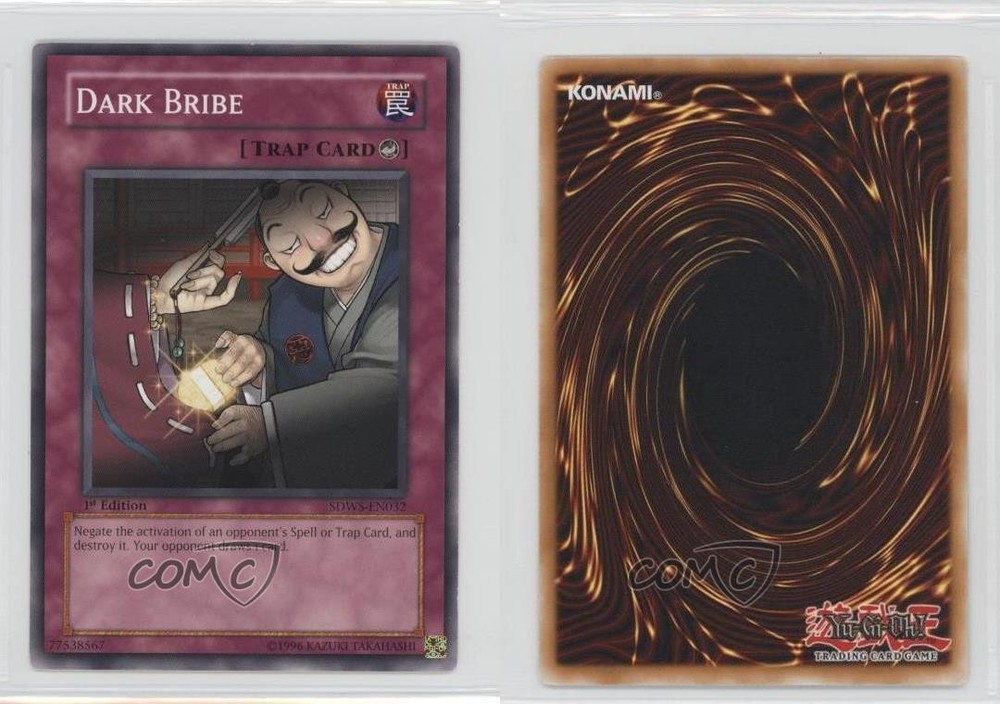 2009 Yu-Gi-Oh! Warriors' Strike - Structure Deck [Base] - 1st Edition #SDWS-EN032 Dark Bribe COMC Item: 26375697 - YuGiOh Card - Featuring Dark Bribe Search for more: 2009 Yu-Gi-Oh! Warriors' Strike Search for more: 2009 Yu-Gi-Oh! Warriors' Strike - Structure Deck [Base] - 1st Edition View all of our Listings Auctions Buy It Now About Us Located in the beautiful Pacific Northwest, COMC (Check Out My Cards) is the world's largest consignment service for trading card singles. More than 10,000 people have used our consignment service to list over 50 million trading cards. Find out how we can help you consign your items on eBay by contacting us through eBay messaging. COMC -- "The Safe & Easy Way to Buy & Sell" Raw Condition for Modern Cards Unless otherwise noted, raw modern cards are listed in Near Mint-Mint condition or better. A NM-MT card appears to be Mint at first glance, but upon closer inspection, may exhibit some of the following: minor print defects (e.g. roller marks, print line, dimple), minor scratches, slight edge wear, and slight corner wear. Centering is clearly visible in the images provided and does not factor into our condition assessment. Raw Condition for Vintage Cards Unless otherwise noted, raw vintage cards are listed in Excellent condition or better. An EX card may exhibit some of the following: minor rounding of corners, surface wear, print defects, light scratches, and slight edge wear/chipping. Centering is clearly visible in the images provided and does not factor into our condition assessment. Domestic Shipping Combined shipping for multiple items is available. To receive combined shipping, please ensure all desired items are in your eBay shopping cart before proceeding to checkout. eBay limits orders to 40 items per order. We automatically combine multiple orders placed on the same day. If you place multiple orders on the same day, please contact us to request a refund of applicable shipping costs. Signature confirmation may be required on invoices over $400. All cards are protected and shipped securely. International Shipping COMC offers eBay's International Shipping (EIS) for international orders under $2,500* (see country exceptions below). All duties and import fees are paid at checkout; in the rare event that there are additional import fees upon delivery, these are borne by the buyer. EIS packages route through a shipping hub in Erlanger, KY before shipping to their final destination. Please note that EIS does not allow for combined shipments. The shipping rates are determined by eBay and cannot be adjusted. *Maximum sale price exceptions: Colombia, Kuwait ($2,000); Taiwan ($1,539); Chile, Costa Rica, Guatemala, Honduras, Trinidad and Tobago ($1,000); Antigua and Barbuda, Aruba, Belize, Dominica, Grenada, Philippines, Saint Kitts and Nevis, Saint Lucia, Montserrat, Turks and Caicos Islands ($500); Dominican Republic, El Salvador ($200). Please request a shipping quote through eBay messaging for orders that exceed the maximum sale price supported by eBay's International Shipping. You will be responsible for all duties and import fees for international orders shipped outside the EIS. All cards are protected and shipped securely. Payment COMC does not accept offers on our cards through our eBay storefront. COMC utilizes eBay’s managed payments system. If you are experiencing difficulties making a payment, please contact eBay for assistance. Return Policy Returns are only accepted on the rare occasion the item is not as described. If you are making a return, please initiate the return process through eBay so a mailing label can be provided for you. Prior to listing, our expert team carefully assessed this item to represent it accurately. Please review the description and high-definition images prior to purchasing to ensure this item meets your satisfaction. We welcome you to contact us if you have further questions about this item. Trust and Integrity COMC carefully assesses each item consigned to us to prevent fraudulent items from entering the marketplace. If you believe an item offered on COMC may be fraudulent, please contact us with details so we can investigate the issue. Items we determine are outside our supported items policy may be removed. Last Modified: 6/16/2025 5:35:59 AM PDT