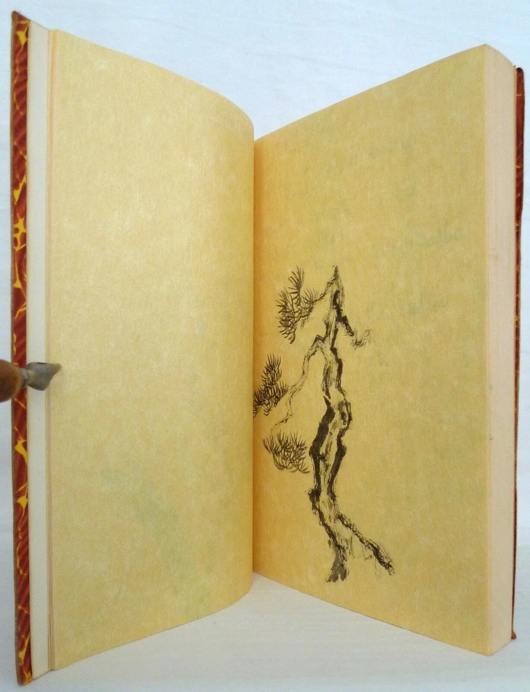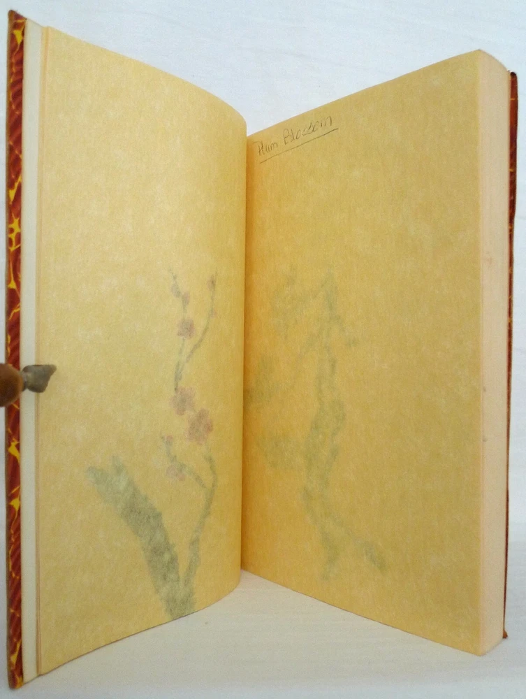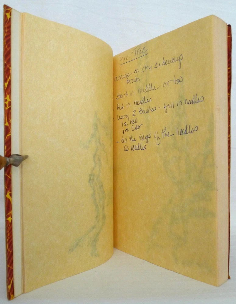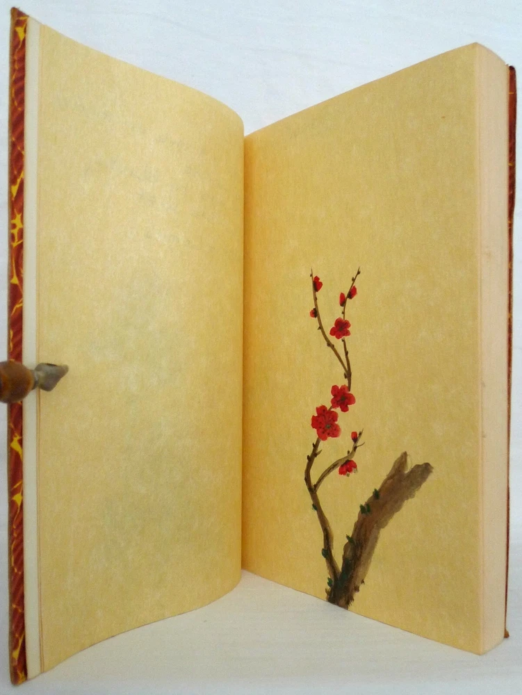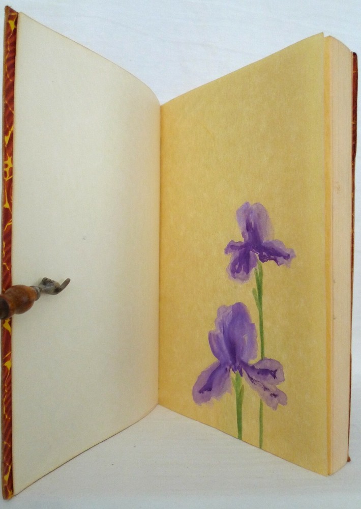 Title: Hand-made Book. Crafted by: Mary Allen. Origin: Berkeley, California, USA. Period: 2010s. Description: Offered is a fine hand-made blank book. The (8vo) hardcover book is covered in a tan leather, features a traditional Smyth-sewn binding, hand-sewn signatures. The bookblock has two marigold and burgundy silk headbands. Burgundy marbled endpapers surround handmade Japanese slightly thick antique white rice paper leaves (edges cut). Quite a delight to feel in your hands, and to use. Lead pages illustrated with nicely done watercolor paintings of flowers and a landscape scene, remainder unused, see images. Dimensions: 7.25 L x 5.25 W x 7.5 H inches. Purpose: Sketch, notebook, diary or journal.