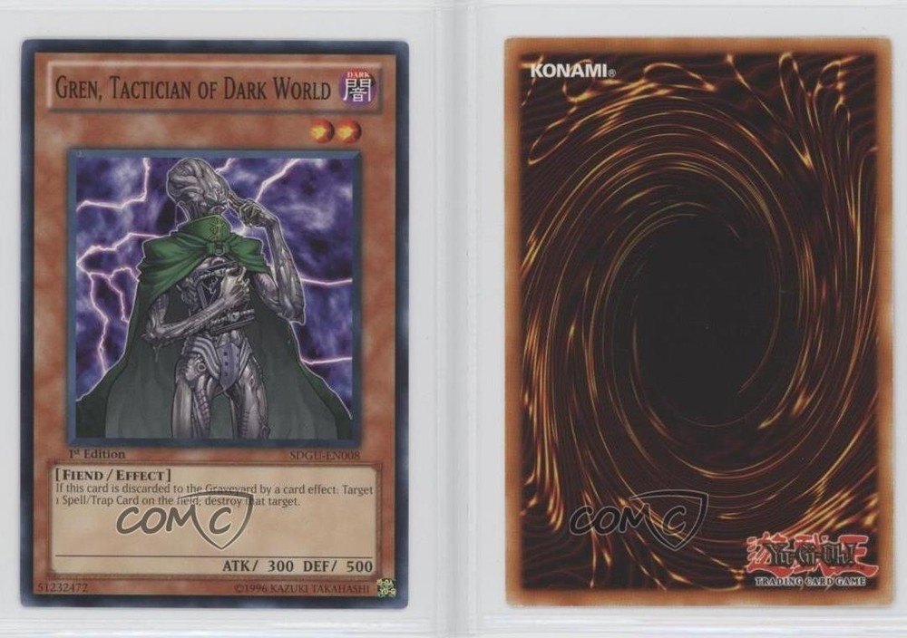 2011 Yu-Gi-Oh! Gates of the Underworld - Structure Deck [Base] - 1st Edition #SDGU-EN008 Gren, Tactician of Dark World COMC Item: 37494667 - YuGiOh Card Search for more: 2011 Yu-Gi-Oh! Gates of the Underworld Search for more: 2011 Yu-Gi-Oh! Gates of the Underworld - Structure Deck [Base] - 1st Edition View all of our Listings Auctions Buy It Now About Us Located in the beautiful Pacific Northwest, COMC (Check Out My Cards) is the world's largest consignment service for trading card singles. More than 10,000 people have used our consignment service to list over 50 million trading cards. Find out how we can help you consign your items on eBay by contacting us through eBay messaging. COMC -- "The Safe & Easy Way to Buy & Sell" Raw Condition for Modern Cards Unless otherwise noted, raw modern cards are listed in Near Mint-Mint condition or better. A NM-MT card appears to be Mint at first glance, but upon closer inspection, may exhibit some of the following: minor print defects (e.g. roller marks, print line, dimple), minor scratches, slight edge wear, and slight corner wear. Centering is clearly visible in the images provided and does not factor into our condition assessment. Raw Condition for Vintage Cards Unless otherwise noted, raw vintage cards are listed in Excellent condition or better. An EX card may exhibit some of the following: minor rounding of corners, surface wear, print defects, light scratches, and slight edge wear/chipping. Centering is clearly visible in the images provided and does not factor into our condition assessment. Domestic Shipping Combined shipping for multiple items is available. To receive combined shipping, please ensure all desired items are in your eBay shopping cart before proceeding to checkout. eBay limits orders to 40 items per order. We automatically combine multiple orders placed on the same day. If you place multiple orders on the same day, please contact us to request a refund of applicable shipping costs. Signature confirmation may be required on invoices over $400. All cards are protected and shipped securely. International Shipping COMC offers eBay's International Shipping (EIS) for international orders under $2,500* (see country exceptions below). All duties and import fees are paid at checkout; in the rare event that there are additional import fees upon delivery, these are borne by the buyer. EIS packages route through a shipping hub in Erlanger, KY before shipping to their final destination. Please note that EIS does not allow for combined shipments. The shipping rates are determined by eBay and cannot be adjusted. *Maximum sale price exceptions: Colombia, Kuwait ($2,000); Taiwan ($1,539); Chile, Costa Rica, Guatemala, Honduras, Trinidad and Tobago ($1,000); Antigua and Barbuda, Aruba, Belize, Dominica, Grenada, Philippines, Saint Kitts and Nevis, Saint Lucia, Montserrat, Turks and Caicos Islands ($500); Dominican Republic, El Salvador ($200). Please request a shipping quote through eBay messaging for orders that exceed the maximum sale price supported by eBay's International Shipping. You will be responsible for all duties and import fees for international orders shipped outside the EIS. All cards are protected and shipped securely. Payment COMC does not accept offers on our cards through our eBay storefront. COMC utilizes eBay’s managed payments system. If you are experiencing difficulties making a payment, please contact eBay for assistance. Return Policy Returns are only accepted on the rare occasion the item is not as described. If you are making a return, please initiate the return process through eBay so a mailing label can be provided for you. Prior to listing, our expert team carefully assessed this item to represent it accurately. Please review the description and high-definition images prior to purchasing to ensure this item meets your satisfaction. We welcome you to contact us if you have further questions about this item. Trust and Integrity COMC carefully assesses each item consigned to us to prevent fraudulent items from entering the marketplace. If you believe an item offered on COMC may be fraudulent, please contact us with details so we can investigate the issue. Items we determine are outside our supported items policy may be removed. Last Modified: 6/11/2025 3:46:39 AM PDT