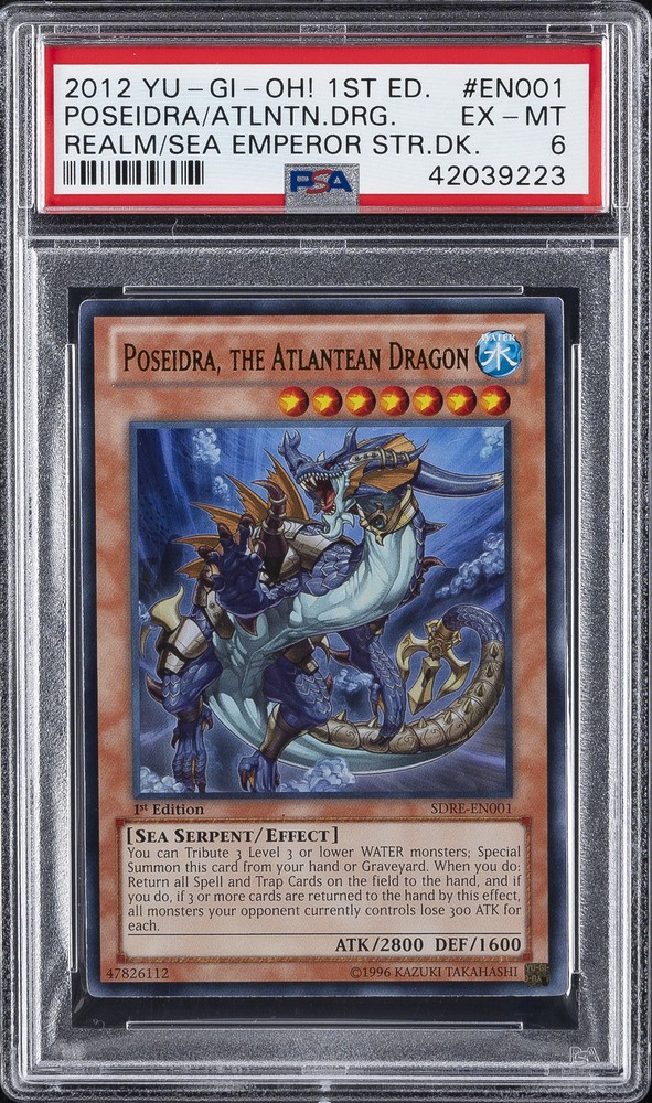 2012 YU-GI-OH! REALM OF THE SEA EMPEROR STRUCTURE DECK 1ST EDITION #EN001 POSEIDRA, THE ATLANTEAN DRAGON PSA 6 2012 YU-GI-OH! REALM OF THE SEA EMPEROR STRUCTURE DECK 1ST EDITION #EN001 POSEIDRA, THE ATLANTEAN DRAGON PSA 6 Purchase Info Thank you for your interest in this item consigned with PSA! By purchasing or making an offer on this item, you acknowledge and agree to the following terms: All sales are final. Returns not accepted. Payment must be made upon purchase of the item. All items are sold "as is" and without warranty of Collectors Universe, Inc. (d/b/a PSA), and ANY AND ALL IMPLIED WARRANTIES ARE DISCLAIMED AND EXCLUDED. Sales tax may apply depending on shipping address. PSA does not guarantee that another third-party grading company's authentication or certification of an item as genuine is correct or accurate. Neither a difference of opinion between third-party grading companies about authenticity, nor a company's subsequent reversal of its earlier authentication or certification of an item, will be a basis for rescinding a sale. Any dispute with another third-party grading company relating to the authenticity of an item must be resolved directly with that other company. Collectors' maximum liability in the event of loss or damage to an item during shipping will be the lesser of (a) the price paid for the item and (b) the change in fair market value of the item. You release Collectors from all other liability including for any claims of punitive damages, emotional distress, consequential damages, lost profits, or lost interest, except as prohibited by law. Shipping Purchased Items will be shipped directly from PSA Vault. You stay hands-free. PSA Vault When you purchase this item, you can save on sales tax and selling fees by keeping it in the PSA Vault, official Vault of eBay. Items already in PSA Vault and will be sent to PSA Vault will have no shipping charge Storage of any items with the PSA Vault will be subject to the PSA Vault Terms of Service. Consignment PSA has competitive rates on the world's largest collectibles marketplace with the option to list from the PSA Vault or immediately after PSA authentication and grading. Sale Price Under $100 $100 - $499 $500 - $999 $1,000 - $2,499 $2,500 - $4,999 $5,000+ Seller Fee 16% 14% 13% 10% 9% 7% Sellers pay a single fee as reflected above; no additional eBay fees are incurred. There is a $5 minimum fee on sold items.