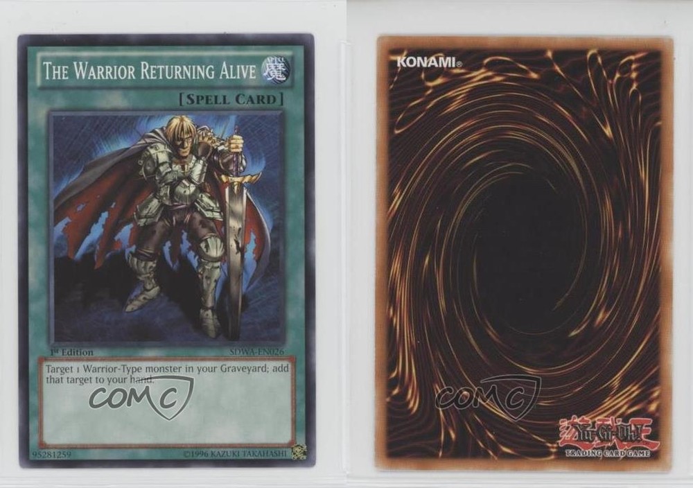 2012 Yu-Gi-Oh! Samurai Warlords - Structure Deck [Base] - 1st Edition #SDWA-EN026 The Warrior Returning Alive COMC Item: 195580289 - YuGiOh Card Search for more: 2012 Yu-Gi-Oh! Samurai Warlords Search for more: 2012 Yu-Gi-Oh! Samurai Warlords - Structure Deck [Base] - 1st Edition View all of our Listings Auctions Buy It Now About Us Located in the beautiful Pacific Northwest, COMC (Check Out My Cards) is the world's largest consignment service for trading card singles. More than 10,000 people have used our consignment service to list over 50 million trading cards. Find out how we can help you consign your items on eBay by contacting us through eBay messaging. COMC -- "The Safe & Easy Way to Buy & Sell" Raw Condition for Modern Cards Unless otherwise noted, raw modern cards are listed in Near Mint-Mint condition or better. A NM-MT card appears to be Mint at first glance, but upon closer inspection, may exhibit some of the following: minor print defects (e.g. roller marks, print line, dimple), minor scratches, slight edge wear, and slight corner wear. Centering is clearly visible in the images provided and does not factor into our condition assessment. Raw Condition for Vintage Cards Unless otherwise noted, raw vintage cards are listed in Excellent condition or better. An EX card may exhibit some of the following: minor rounding of corners, surface wear, print defects, light scratches, and slight edge wear/chipping. Centering is clearly visible in the images provided and does not factor into our condition assessment. Domestic Shipping Combined shipping for multiple items is available. To receive combined shipping, please ensure all desired items are in your eBay shopping cart before proceeding to checkout. eBay limits orders to 40 items per order. We automatically combine multiple orders placed on the same day. If you place multiple orders on the same day, please contact us to request a refund of applicable shipping costs. Signature confirmation may be required on invoices over $400. All cards are protected and shipped securely. International Shipping COMC offers eBay's International Shipping (EIS) for international orders under $2,500* (see country exceptions below). All duties and import fees are paid at checkout; in the rare event that there are additional import fees upon delivery, these are borne by the buyer. EIS packages route through a shipping hub in Erlanger, KY before shipping to their final destination. Please note that EIS does not allow for combined shipments. The shipping rates are determined by eBay and cannot be adjusted. *Maximum sale price exceptions: Colombia, Kuwait ($2,000); Taiwan ($1,539); Chile, Costa Rica, Guatemala, Honduras, Trinidad and Tobago ($1,000); Antigua and Barbuda, Aruba, Belize, Dominica, Grenada, Philippines, Saint Kitts and Nevis, Saint Lucia, Montserrat, Turks and Caicos Islands ($500); Dominican Republic, El Salvador ($200). Please request a shipping quote through eBay messaging for orders that exceed the maximum sale price supported by eBay's International Shipping. You will be responsible for all duties and import fees for international orders shipped outside the EIS. All cards are protected and shipped securely. Payment COMC does not accept offers on our cards through our eBay storefront. COMC utilizes eBay’s managed payments system. If you are experiencing difficulties making a payment, please contact eBay for assistance. Return Policy Returns are only accepted on the rare occasion the item is not as described. If you are making a return, please initiate the return process through eBay so a mailing label can be provided for you. Prior to listing, our expert team carefully assessed this item to represent it accurately. Please review the description and high-definition images prior to purchasing to ensure this item meets your satisfaction. We welcome you to contact us if you have further questions about this item. Trust and Integrity COMC carefully assesses each item consigned to us to prevent fraudulent items from entering the marketplace. If you believe an item offered on COMC may be fraudulent, please contact us with details so we can investigate the issue. Items we determine are outside our supported items policy may be removed. Last Modified: 6/15/2025 5:51:29 AM PDT