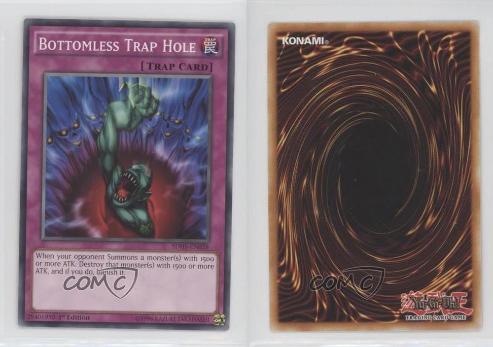 2015 Yu-Gi-Oh! HERO Strike - Structure Deck [Base] - 1st Edition #SDHS-EN038 Bottomless Trap Hole COMC Item: 122854057 - YuGiOh Card - Featuring Bottomless Trap Hole Search for more: 2015 Yu-Gi-Oh! HERO Strike Search for more: 2015 Yu-Gi-Oh! HERO Strike - Structure Deck [Base] - 1st Edition View all of our Listings Auctions Buy It Now About Us Located in the beautiful Pacific Northwest, COMC (Check Out My Cards) is the world's largest consignment service for trading card singles. More than 10,000 people have used our consignment service to list over 50 million trading cards. Find out how we can help you consign your items on eBay by contacting us through eBay messaging. COMC -- "The Safe & Easy Way to Buy & Sell" Raw Condition for Modern Cards Unless otherwise noted, raw modern cards are listed in Near Mint-Mint condition or better. A NM-MT card appears to be Mint at first glance, but upon closer inspection, may exhibit some of the following: minor print defects (e.g. roller marks, print line, dimple), minor scratches, slight edge wear, and slight corner wear. Centering is clearly visible in the images provided and does not factor into our condition assessment. Raw Condition for Vintage Cards Unless otherwise noted, raw vintage cards are listed in Excellent condition or better. An EX card may exhibit some of the following: minor rounding of corners, surface wear, print defects, light scratches, and slight edge wear/chipping. Centering is clearly visible in the images provided and does not factor into our condition assessment. Domestic Shipping Combined shipping for multiple items is available. To receive combined shipping, please ensure all desired items are in your eBay shopping cart before proceeding to checkout. eBay limits orders to 40 items per order. We automatically combine multiple orders placed on the same day. If you place multiple orders on the same day, please contact us to request a refund of applicable shipping costs. Signature confirmation may be required on invoices over $400. All cards are protected and shipped securely. International Shipping COMC offers eBay's International Shipping (EIS) for international orders under $2,500* (see country exceptions below). All duties and import fees are paid at checkout; in the rare event that there are additional import fees upon delivery, these are borne by the buyer. EIS packages route through a shipping hub in Erlanger, KY before shipping to their final destination. Please note that EIS does not allow for combined shipments. The shipping rates are determined by eBay and cannot be adjusted. *Maximum sale price exceptions: Colombia, Kuwait ($2,000); Taiwan ($1,539); Chile, Costa Rica, Guatemala, Honduras, Trinidad and Tobago ($1,000); Antigua and Barbuda, Aruba, Belize, Dominica, Grenada, Philippines, Saint Kitts and Nevis, Saint Lucia, Montserrat, Turks and Caicos Islands ($500); Dominican Republic, El Salvador ($200). Please request a shipping quote through eBay messaging for orders that exceed the maximum sale price supported by eBay's International Shipping. You will be responsible for all duties and import fees for international orders shipped outside the EIS. All cards are protected and shipped securely. Payment COMC does not accept offers on our cards through our eBay storefront. COMC utilizes eBay’s managed payments system. If you are experiencing difficulties making a payment, please contact eBay for assistance. Return Policy Returns are only accepted on the rare occasion the item is not as described. If you are making a return, please initiate the return process through eBay so a mailing label can be provided for you. Prior to listing, our expert team carefully assessed this item to represent it accurately. Please review the description and high-definition images prior to purchasing to ensure this item meets your satisfaction. We welcome you to contact us if you have further questions about this item. Trust and Integrity COMC carefully assesses each item consigned to us to prevent fraudulent items from entering the marketplace. If you believe an item offered on COMC may be fraudulent, please contact us with details so we can investigate the issue. Items we determine are outside our supported items policy may be removed. Last Modified: 6/27/2025 1:58:15 AM PDT